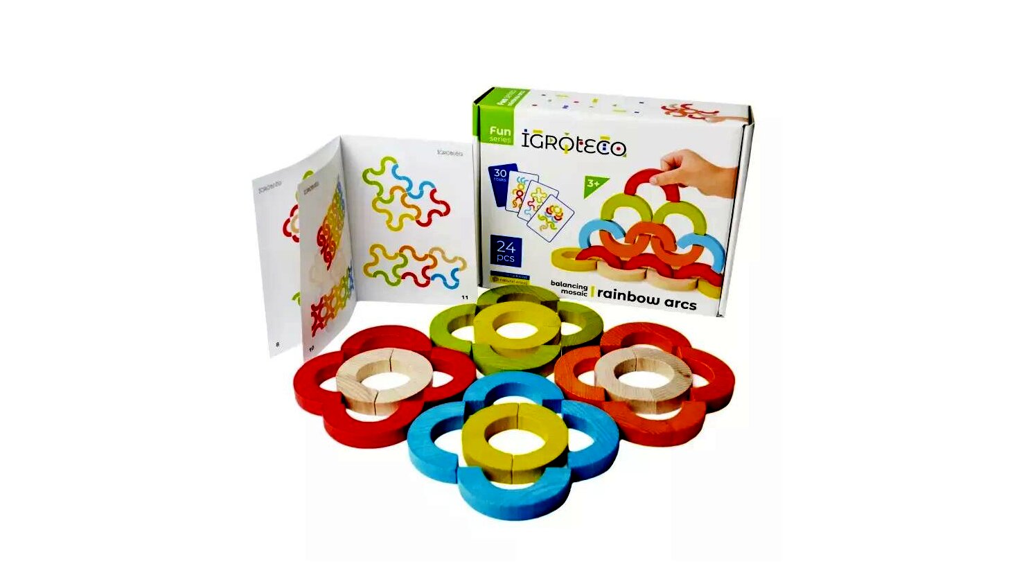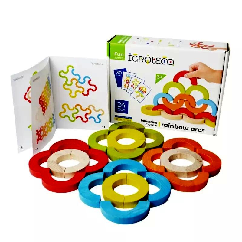 A készlet 24 darab színes, félkör alakú elemet tartalmaz, amelyek természetes fából készültek. Ezekkel az elemekkel különféle mintákat, stilizált állatokat, embereket vagy virágokat lehet kirakni, de akár tornyokat is építhetnek a gyerekek.Ez a játék ideális választás azon gyermekek számára, akik szeretnek kreatívan alkotni és kihívásokkal szembenézni. A készlethez tartozik egy 30 feladatos instrukciós füzet, amely segít a gyerekeknek önállóan is izgalmas formákat létrehozni. A játék tanítja a türelmet, a kitartást, és segít abban, hogy a gyerekek megtanulják összehasonlítani a végeredményt a tervekkel.