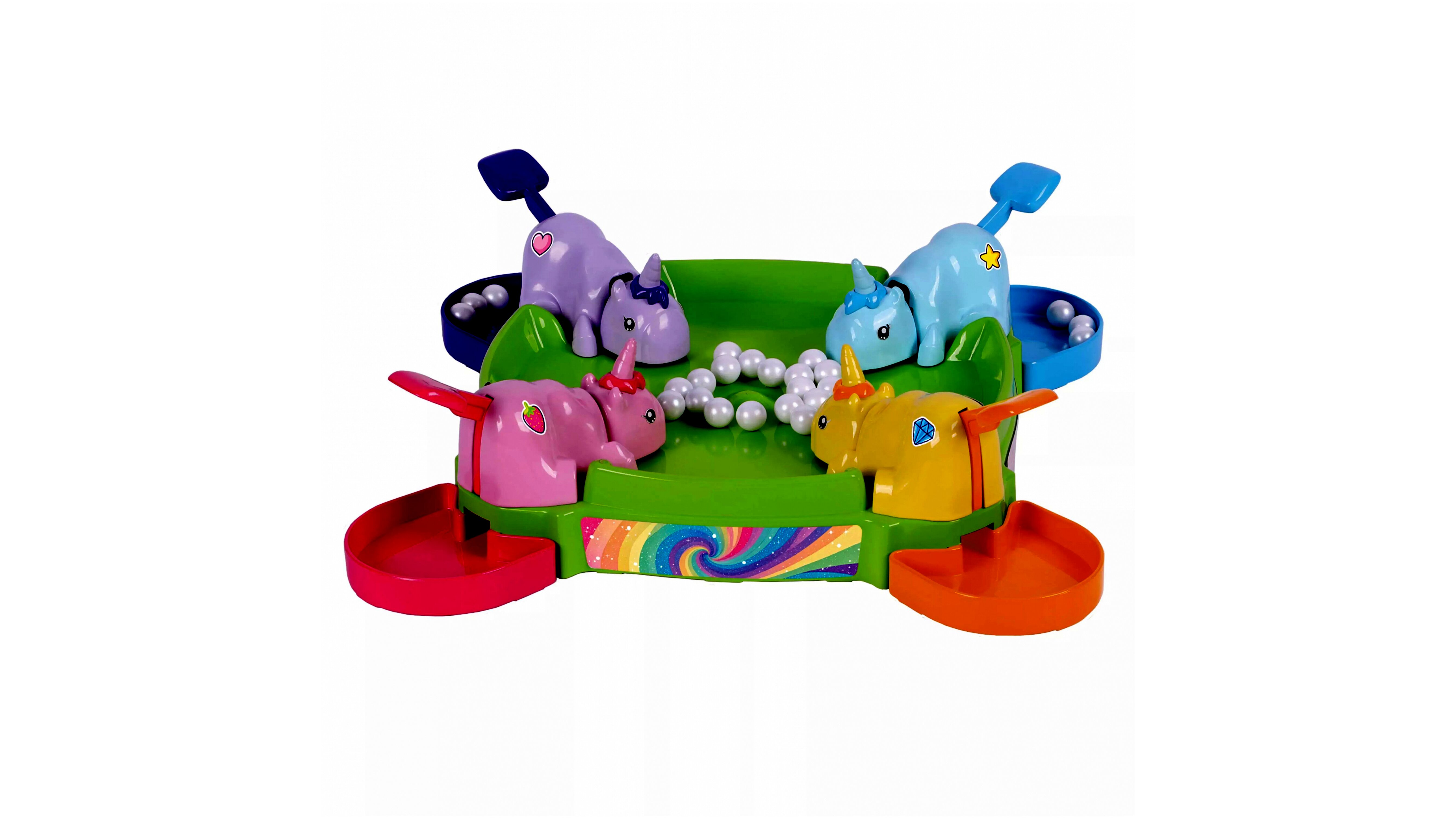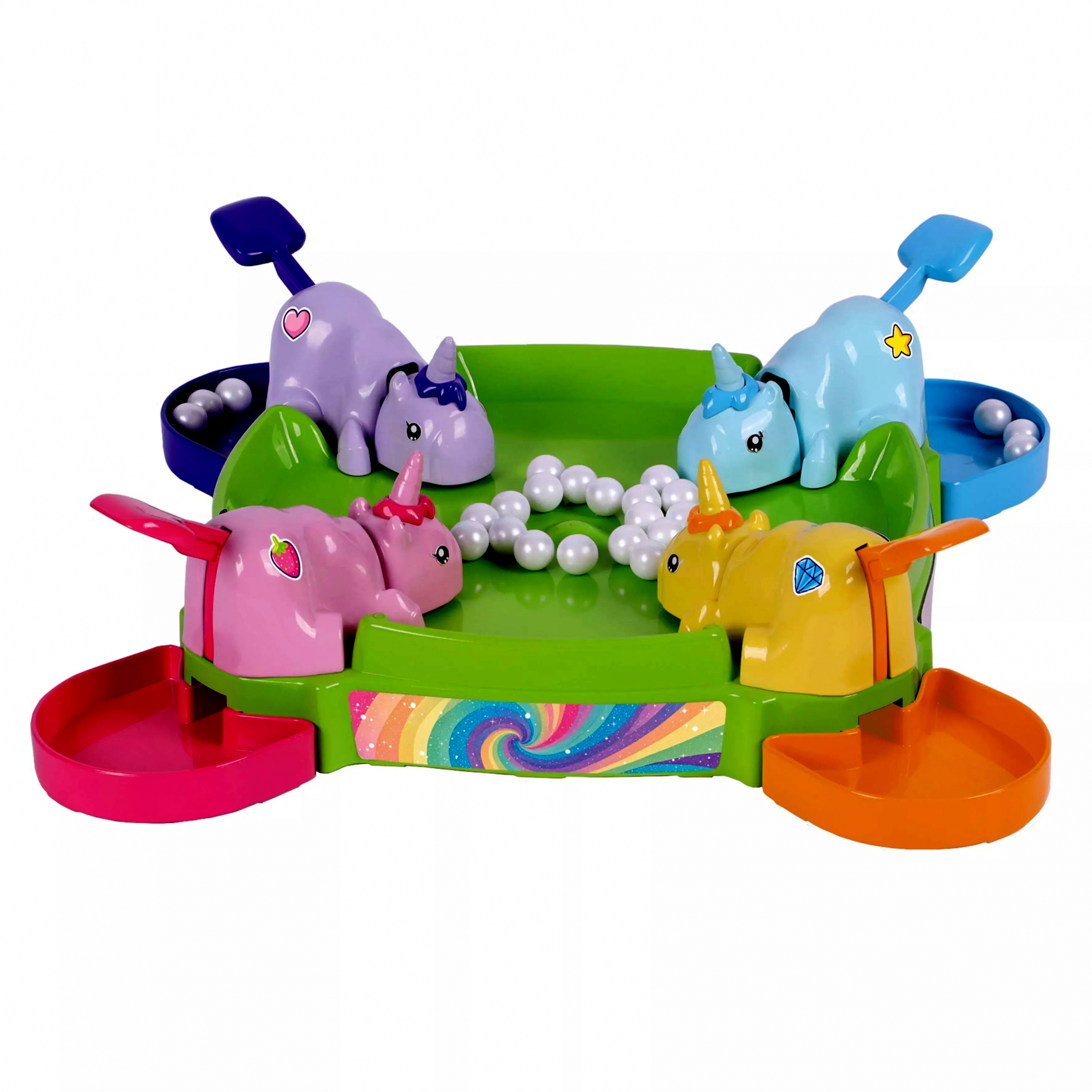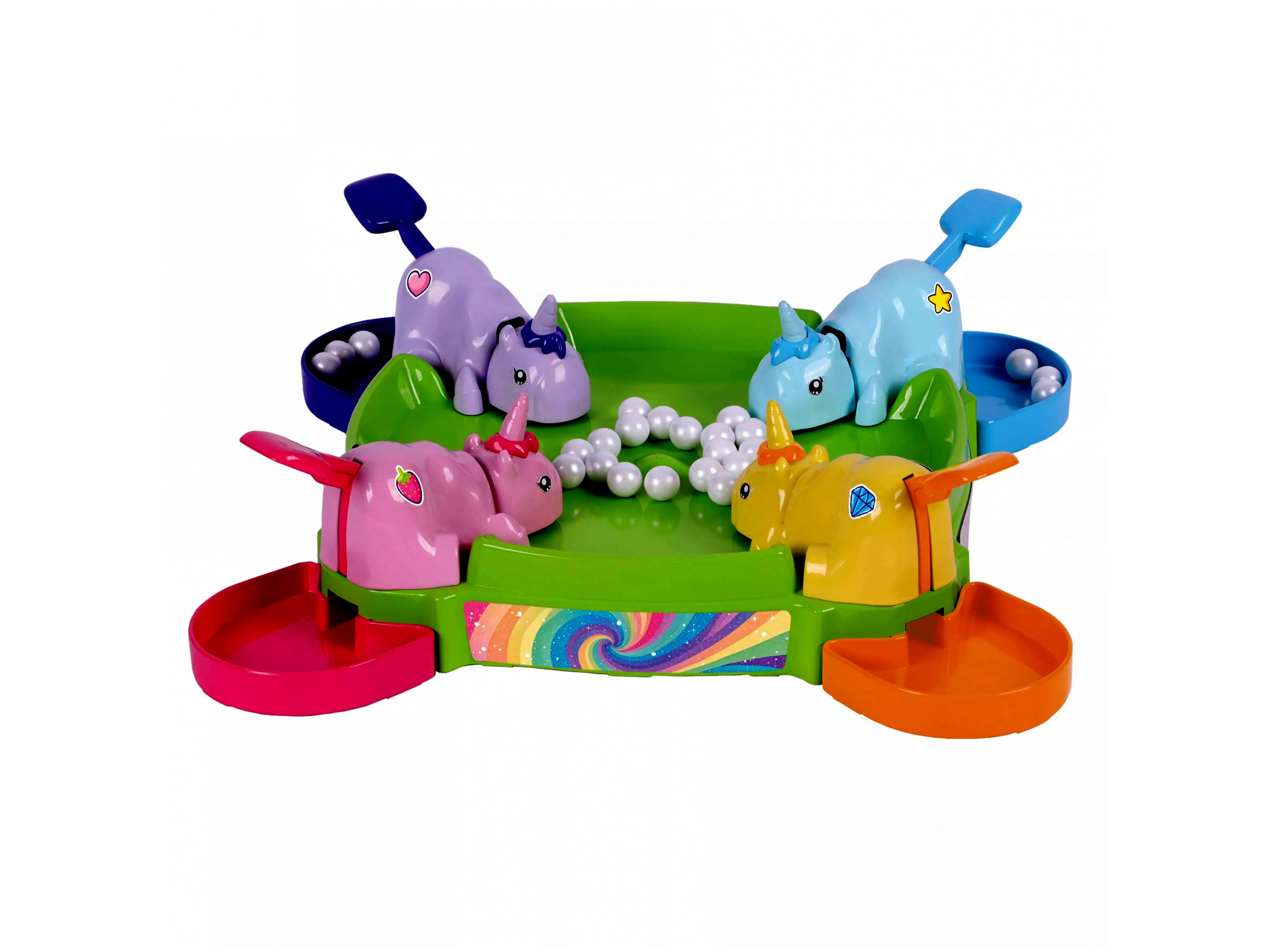 Tartalom: 4 unikornis figura, 24 golyó, 4 tároló tálca, játéktábla