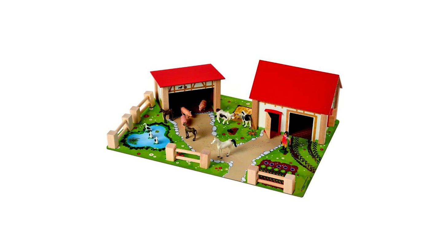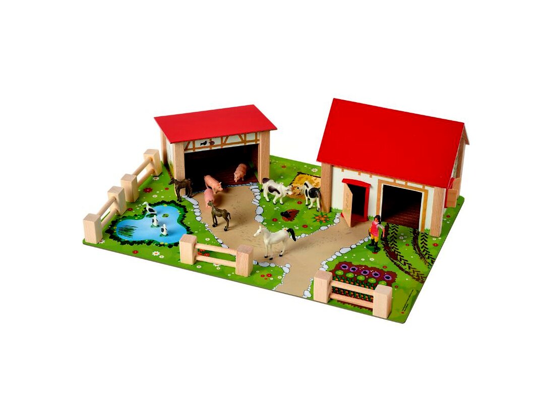 Az Eichhorn Farmgazdaság játékszettjével a gyerekek eljátszhatják egy gazdaság hétköznapjainak jeleneteit. A készletben az igényesen és részletgazdagon kidolgozott alaplapon és épületeken kívül kerítéselemek és különböző állatfigurák (pl. malacok, tehenek, lovak, libák) is helyet kaptak, akik kényelmesen elférnek kis otthonukban. A gazdasszony kiterelheti az állatokat az istállóból, megetetheti a jószágokat, kitakaríthatja a fekhelyeiket, leszüretelheti a beérett termést, majd a nap végén visszaterelheti a farmállatokat a helyükre.A készlet az alaplapot és a farmer figurát is tartalmazza.