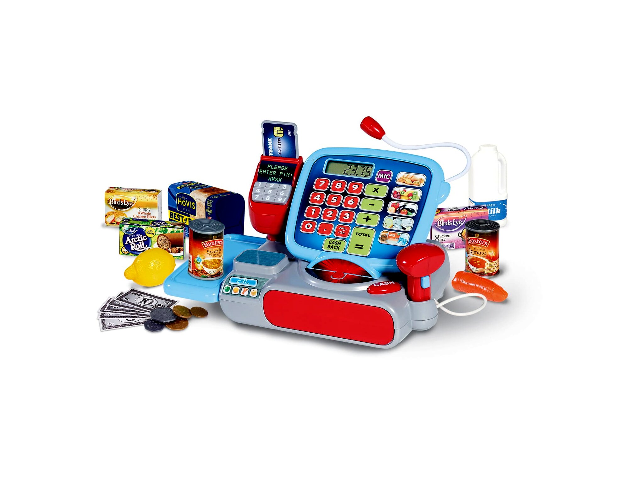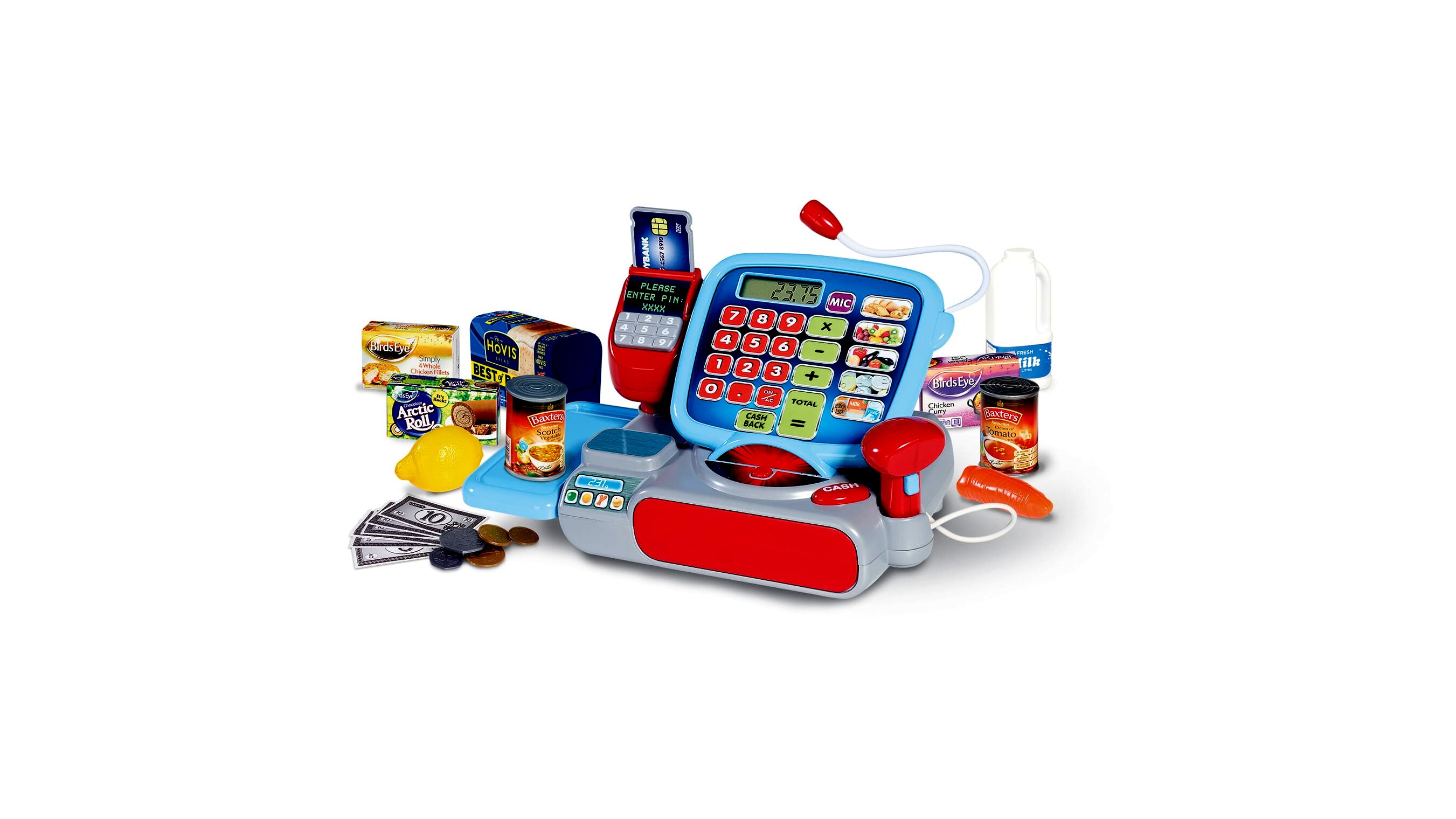 A pénztárgépben lévő számológép valóban működik, ahogyan a hozzá csatlakoztatott mikrofon is. A vásárló egyaránt fizethet bankkártyával és készpénzzel, hiszen a bankkártya terminál és játékpénz is a 30 részes csomagba tartozik.