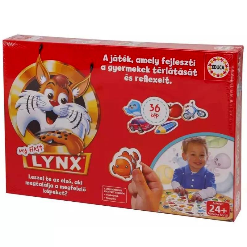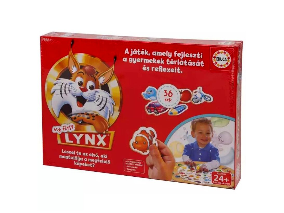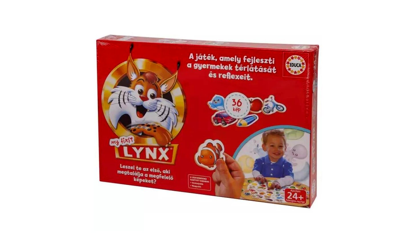 Az Educa Első Lynx-em társasjátékával a kicsik próbára tehetik megfigyelőképességüket és gyorsaságukat. A feladat egyszerű: meg kell találni minél gyorsabban a véletlenszerűen kiválasztott képet a játéktáblán. Aki először megtalálja a képecskét, az megtarthatja a kártyát. A játék győztese a legtöbb képecskét összegyűjtő játékos. Az Első Lynx-em társasjátékot kifejezetten picik számára lett fejlesztették, a képecskék nagyobbak és vastagabb anyagra lettek nyomtatva, így illeszkednek az apró kezecskékhez.Az aranyos grafika, valamint a lurkók számára könnyen felismerhető képek játékra hívják a gyerekeket. A játékszabály egyszerű, könnyen tanulható, így társasjáték akár a gyerekek első társasjátéka is lehet.
