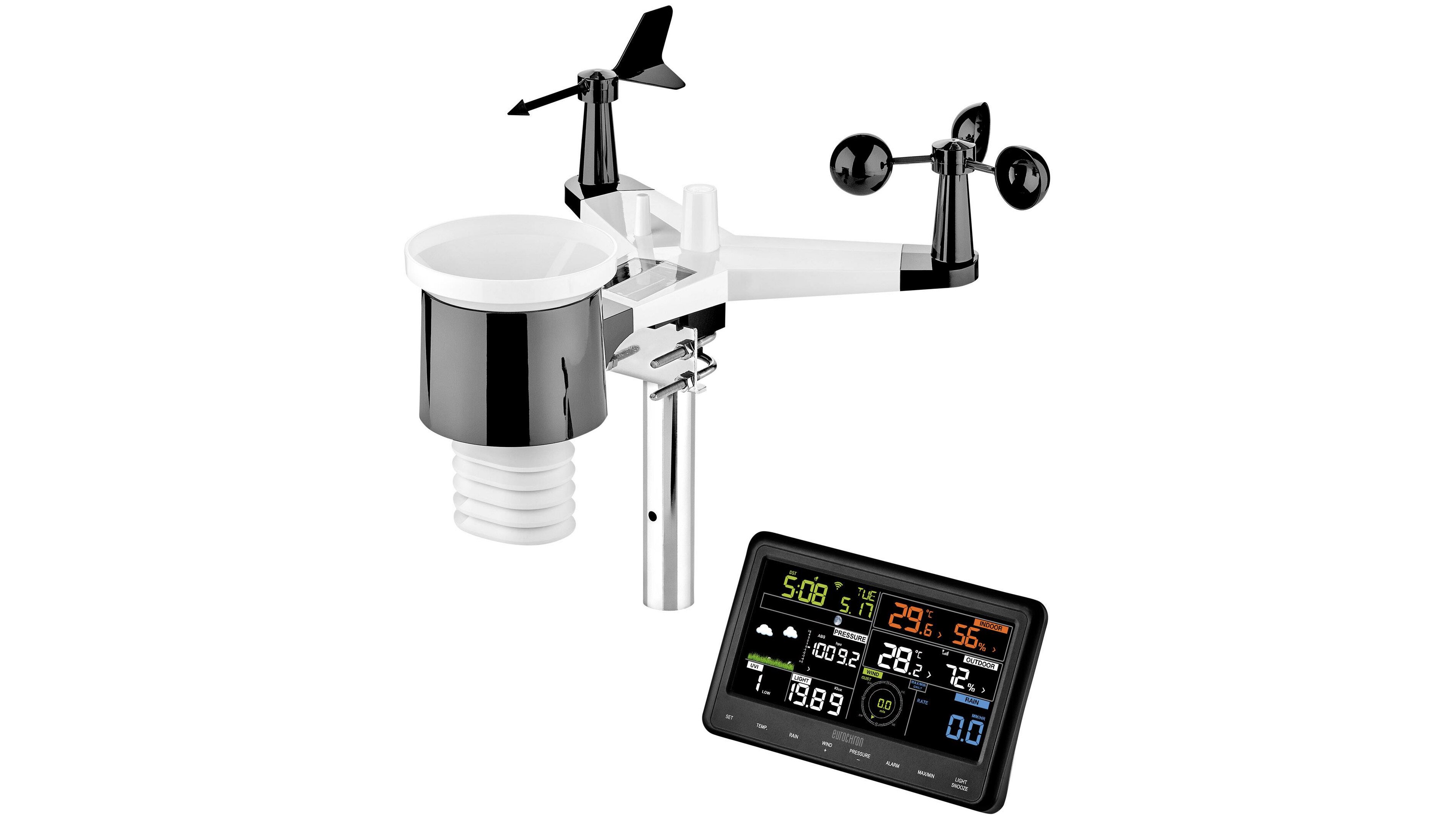 Színes időjárásjelző állomás, Külső érzékelő, Szélzászló, Szélsebesség érzékelő, Esőfelfogó tölcsér, Árboc tartó szerelési anyaggal, Hálózati adapter, Használati útmutató