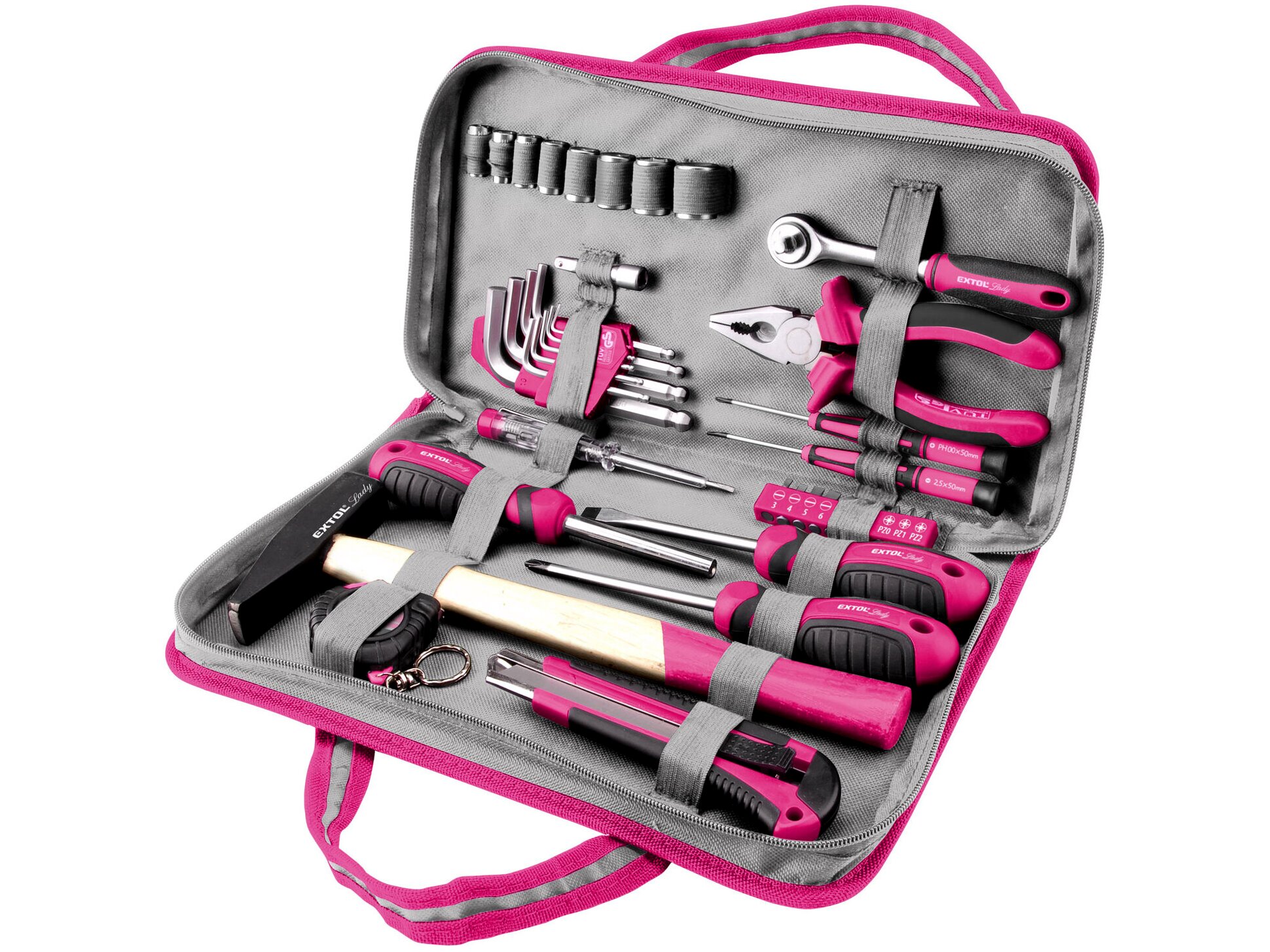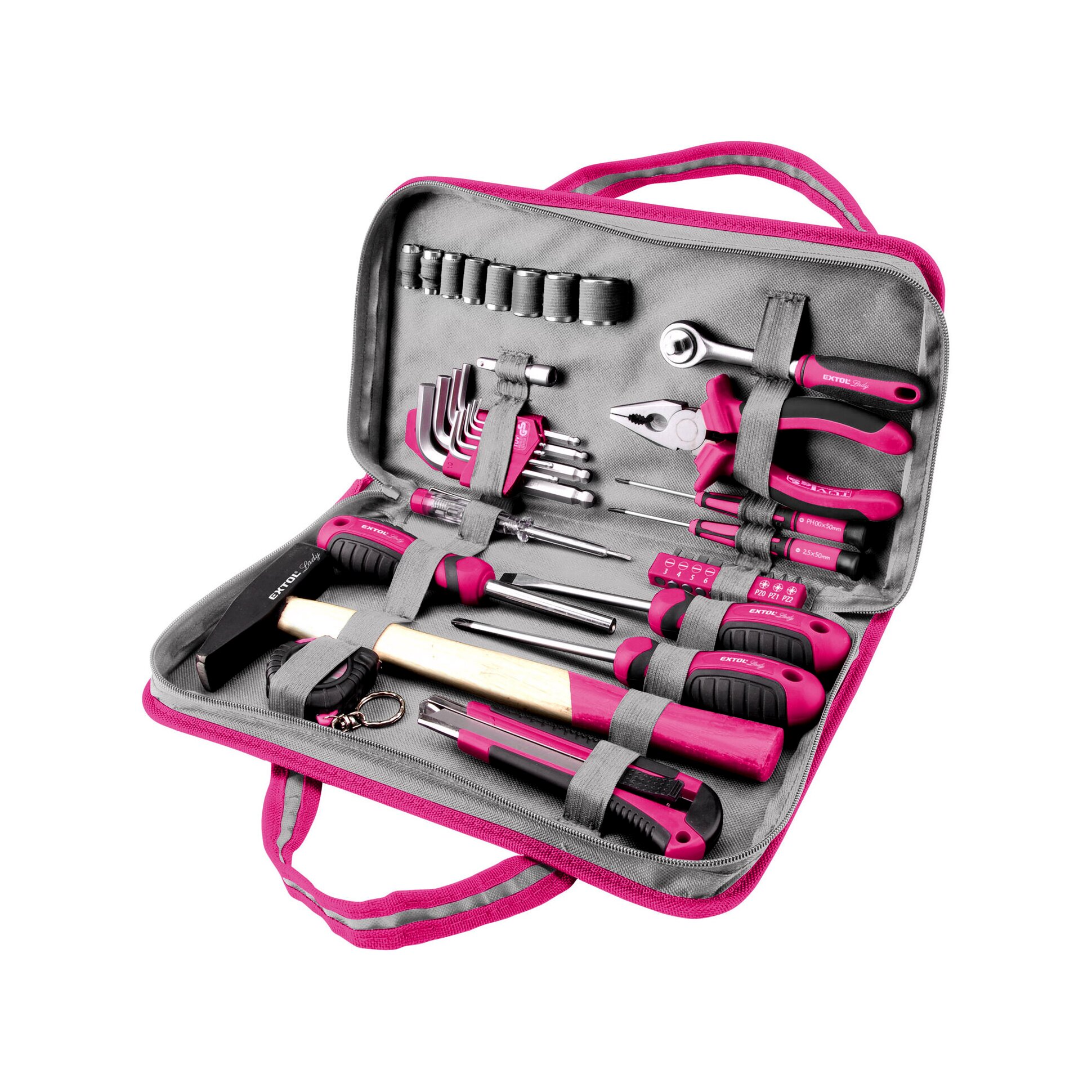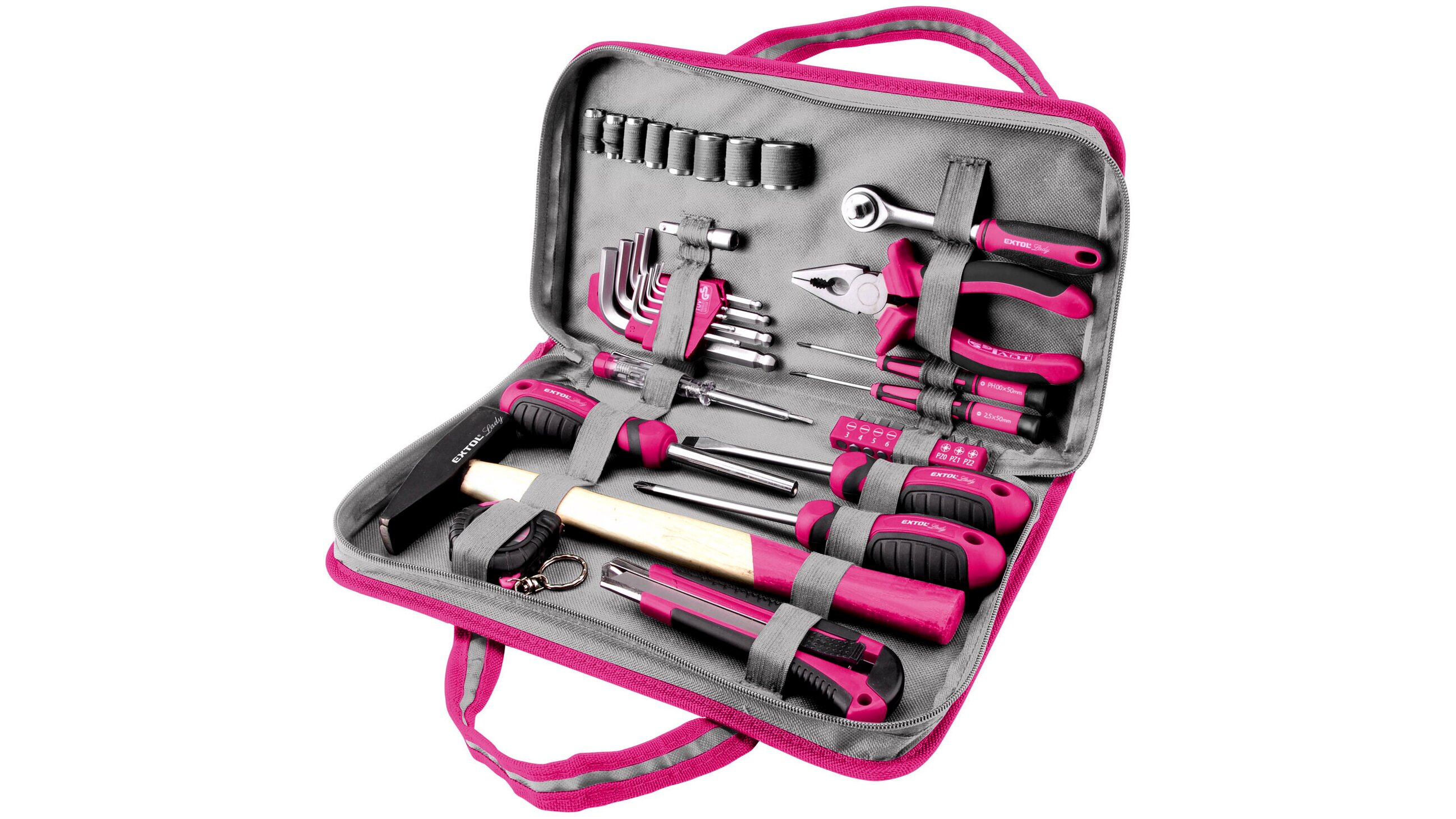 A készlet rózsaszín Extol Lady dizájnja nemcsak esztétikus, hanem könnyen felismerhetővé is teszi a szerszámokat a többi között. A kéziszerszámok ergonomikus markolattal készülnek, így kényelmes fogást és biztonságos használatot nyújtanak hosszabb munka során is.
