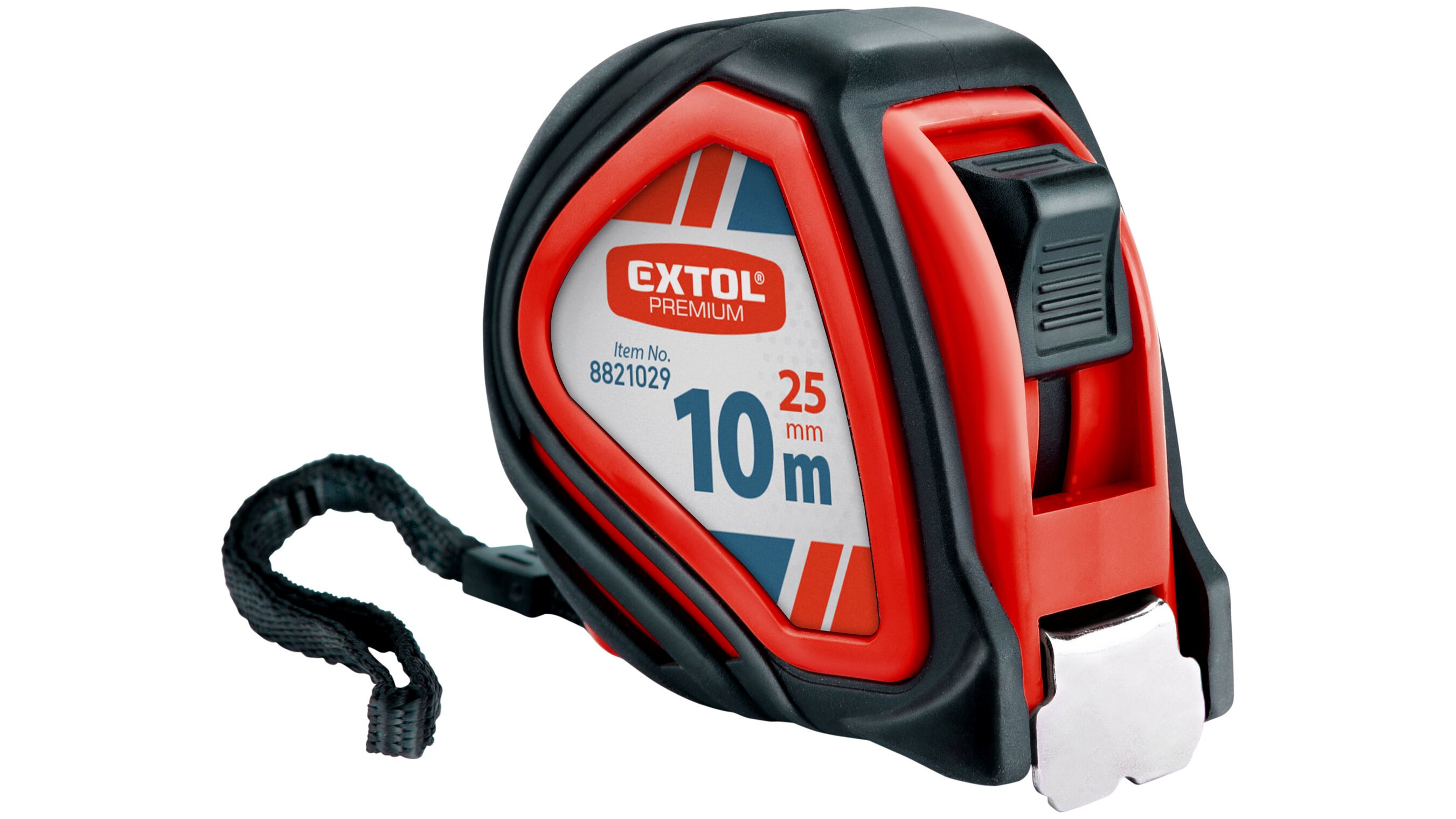 A gumiborítás és az ergonómikus csúszásgátló elemek megvédik a mérőszalag műanyag testét. Önfeltekercselő szerkezetnek erős rugója van. A STOP gomb csúszásgátló felületkezeléssel rendelkezik.Az íves profilú acél szalag sík helyzetben tartását segíti a mérőszalagnak.