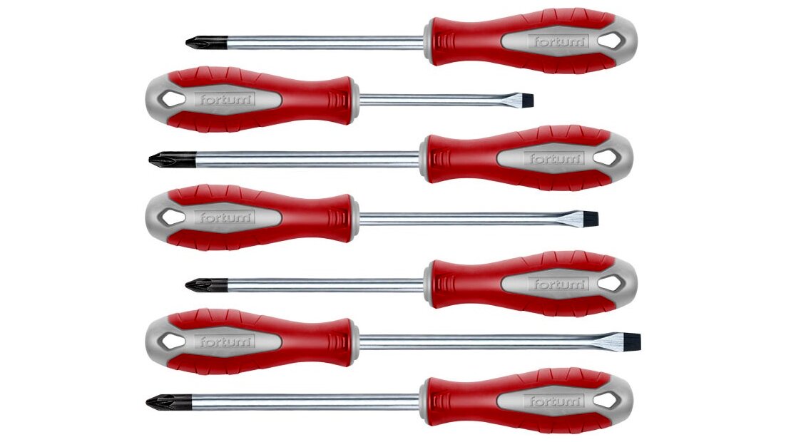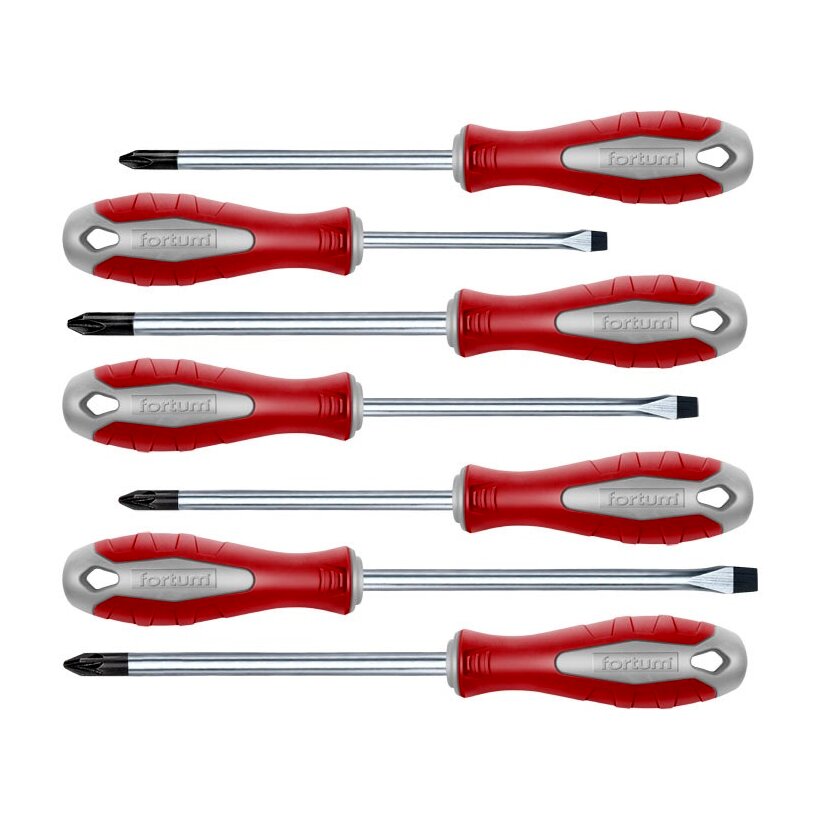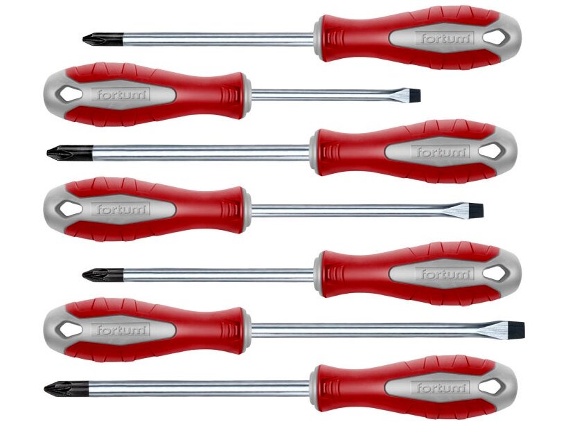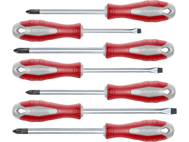 Fortum 4740930 Csavarhúzó készlet, 7 részes lapos: 3×75, 5×100, 6×125mm, PH1×100, PH2×125, PZ1×100, PZ2×125, CV. mágneses, papír doboz