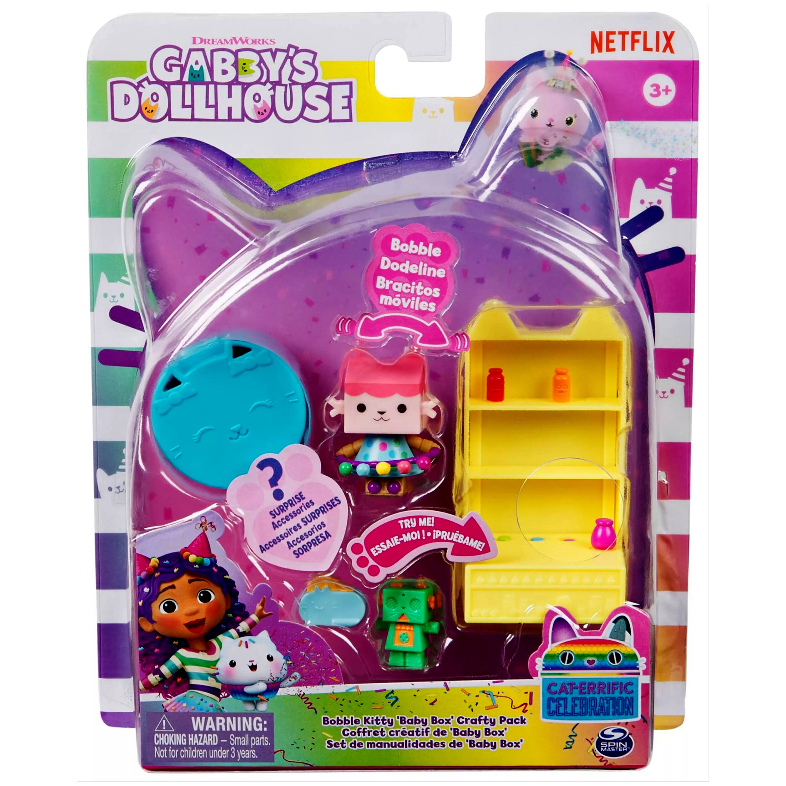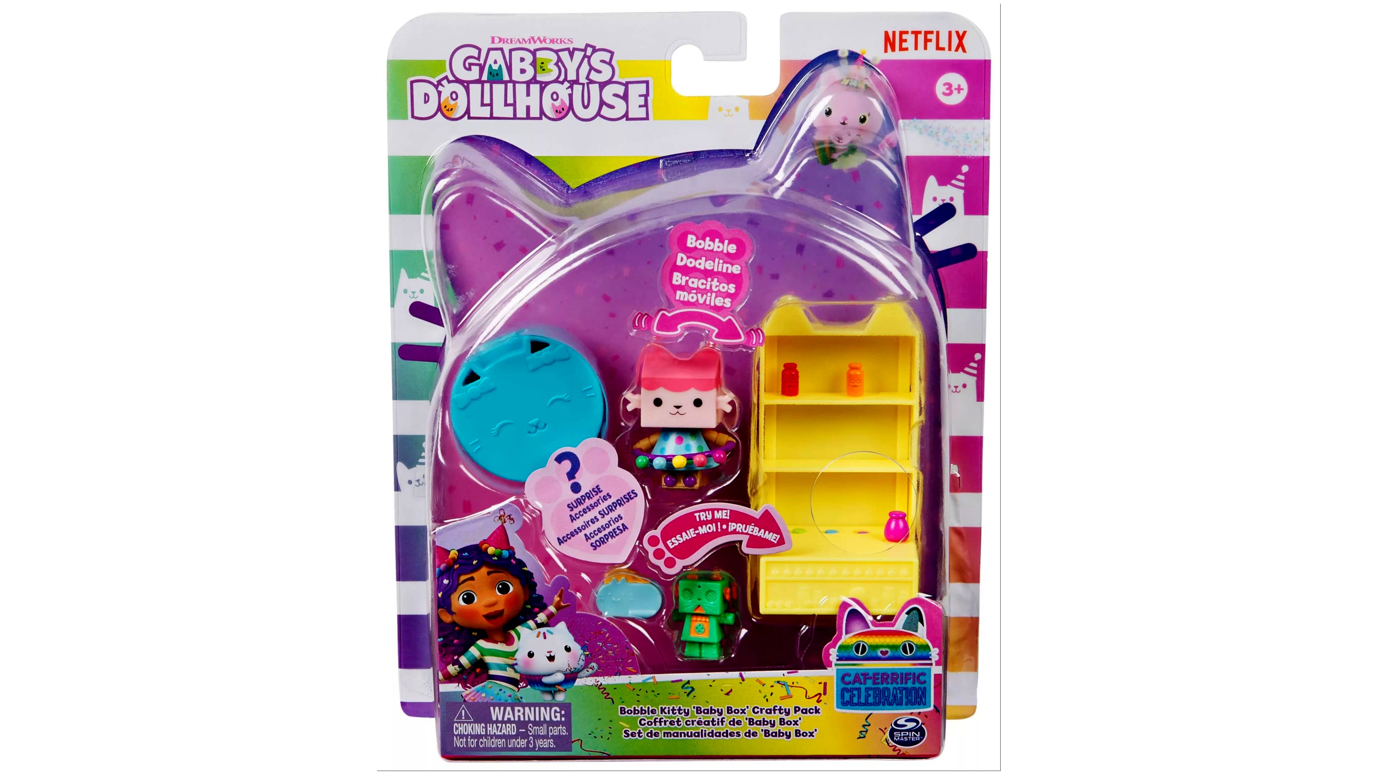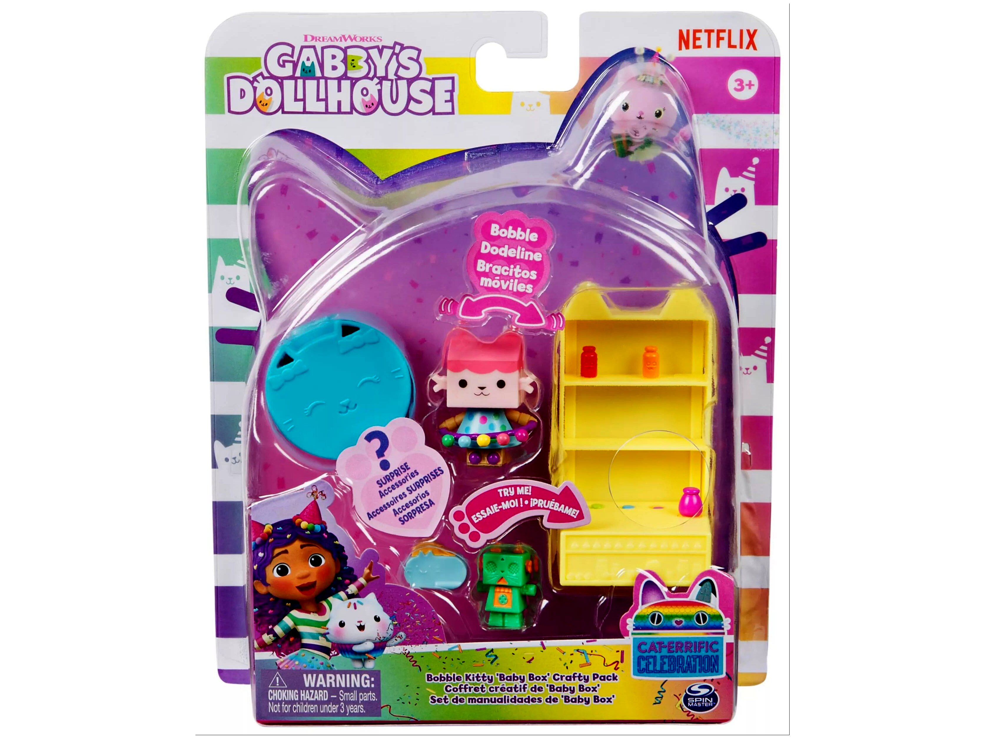 A Gabi babaháza sorozathoz készült játékszett egy bólogató fejű cicafigurával és babaházbútor kiegészítővel, amelyet a gyerekek „küldeményként” nyithatnak ki. A meglepetés játék elemeivel a babaházas történetek könnyen újraalkothatók és továbbgondolhatók.