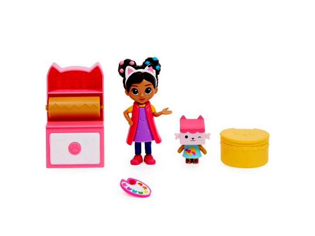 A lányok könnyedén festőművészekké válhatnak a Gabi művész stúdiója játékszettel.A játékkészlet egy 10 cm-es Gabi figurát, egy Baby Box Cat figurát, egy művész-szekrény bútorelemet, egy festőpaletta kiegészítőt, valamint egy Dollhouse Delivery meglepetés dobozt tartalmaz kiegészítővel.