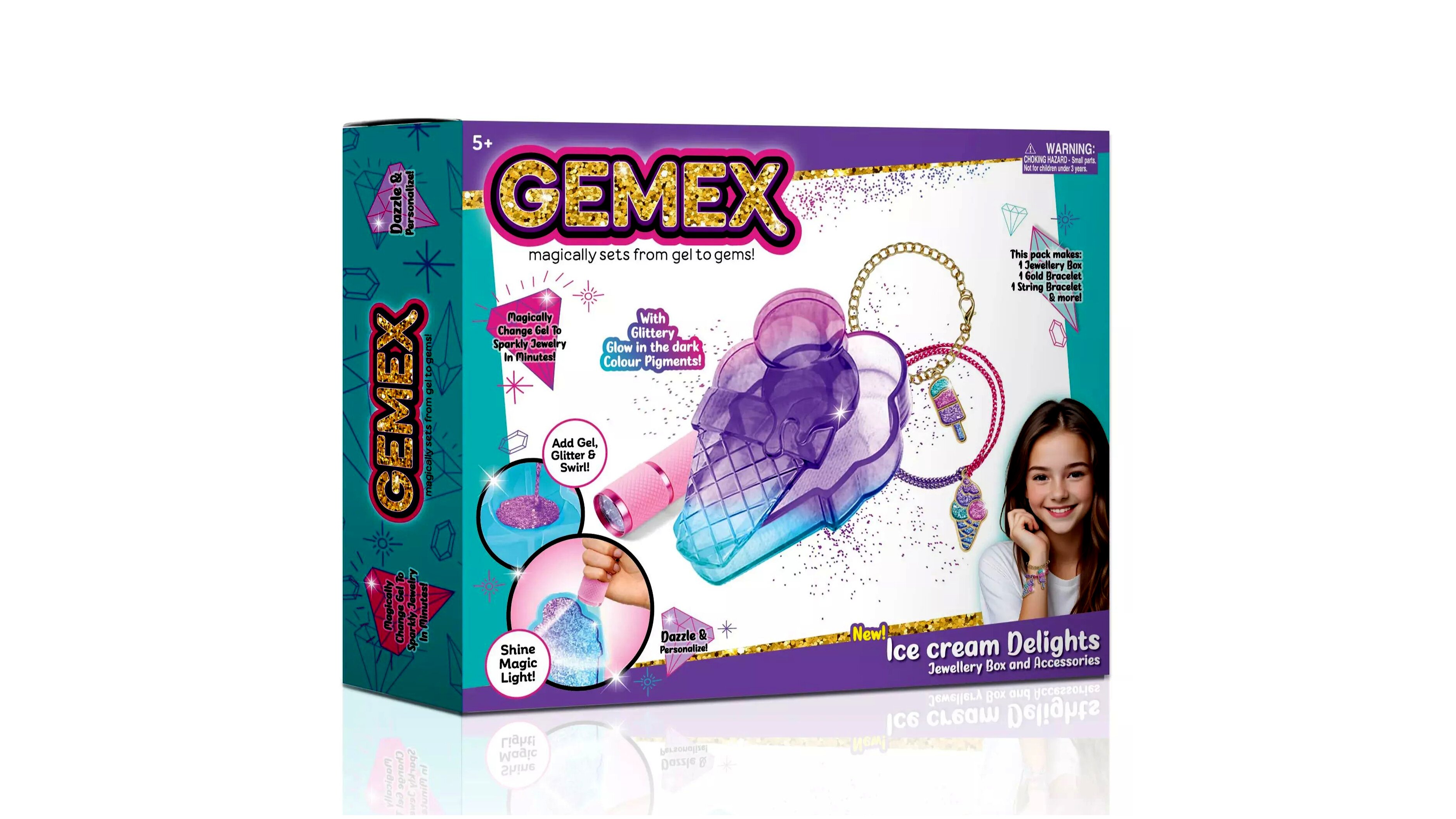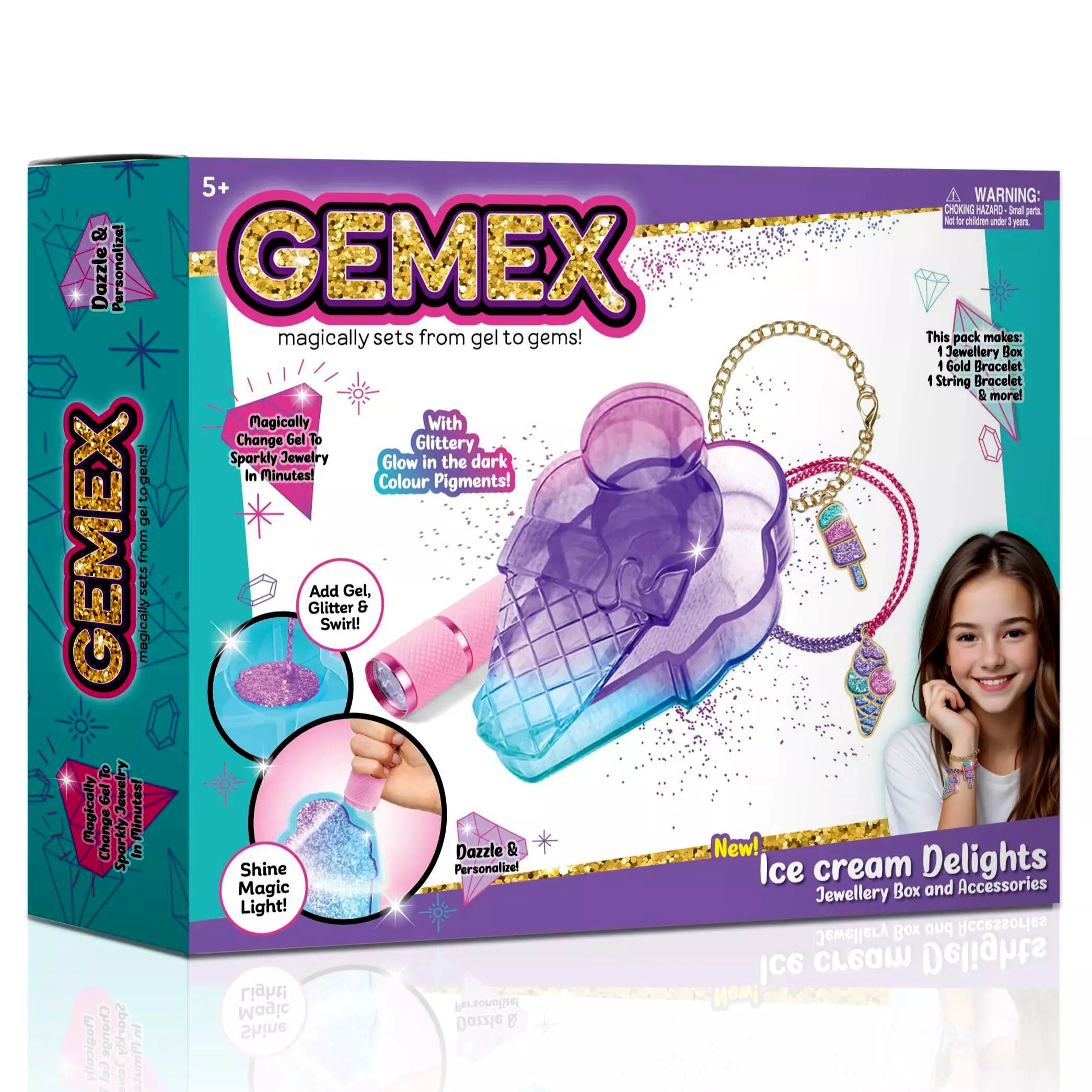 A Gemex szettekkel a gyerekek egy egészen új szintre emelhetik az ékszerkészítést - gélből alkothatnak valódi ékszereket! A varázslat a gyerekek szeme előtt zajlik le, és garantált, hogy minden ékszer egyedi és különleges lesz, nincs két egyforma. A szett használata egyszerű és szórakoztató. A gél alapú folyadék öntőformába töltésével, különféle dekorációk hozzáadásával, majd a varázslatos lámpával való megvilágítással a gél három perc alatt megszilárdul, és csillogó ékszerré alakul. A gyerekek így akár 50 egyedi ékszert is elkészíthetnek, amelyeket viselhetnek vagy ajándékozhatnak.
