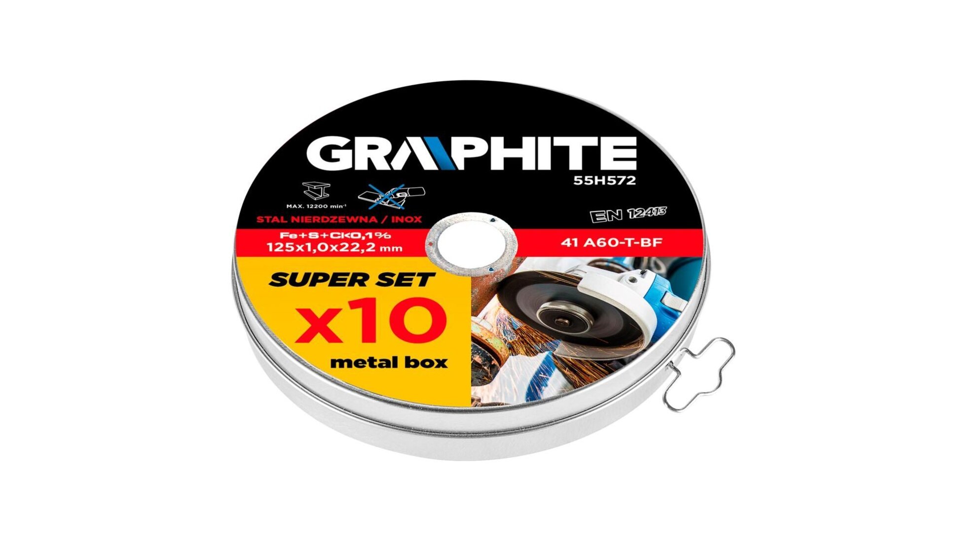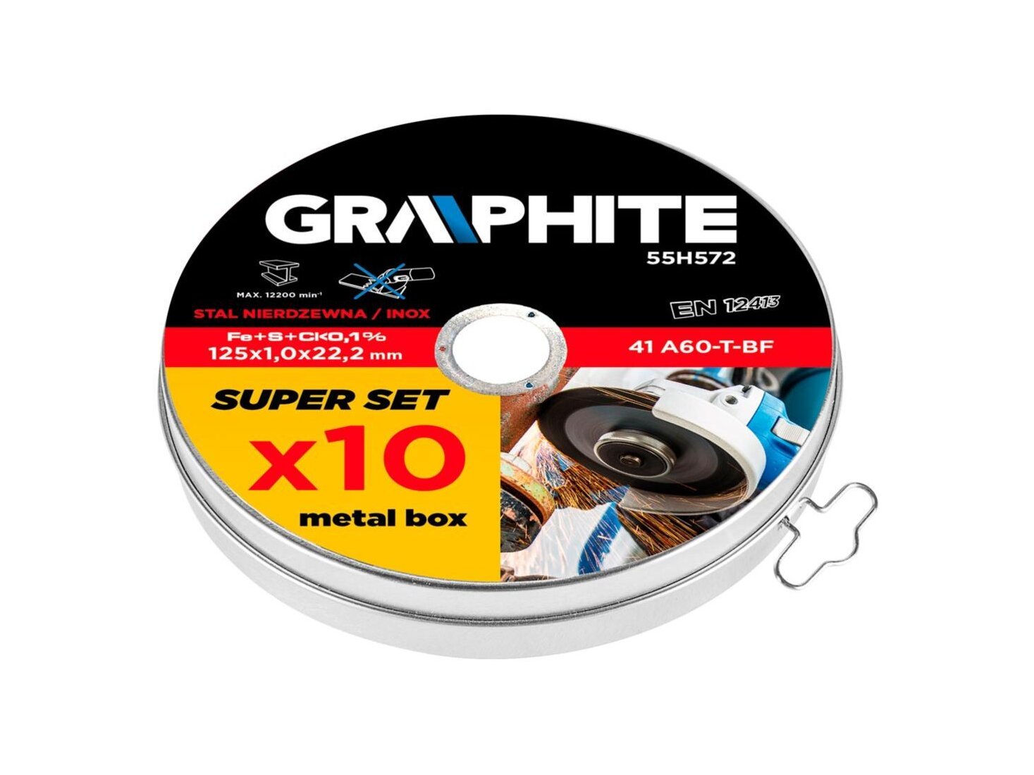 A GRAPHITE 125 mm átmérőjű vágótárcsa fémekhez (kat. sz. 55H572) korszerű felépítésének és vastagsága csökkentésének köszönhetően a vágás időszükségletének jelentős csökkentését teszi lehetővé. Elsősorban rozsdamentes acél vágásához ajánlott, korlátozott mennyiségben tartalmaz ként, klórt és vasat. Magas szintű biztonságot nyújt, megfelelvén az EN 12413 szabvány követelményeinek.