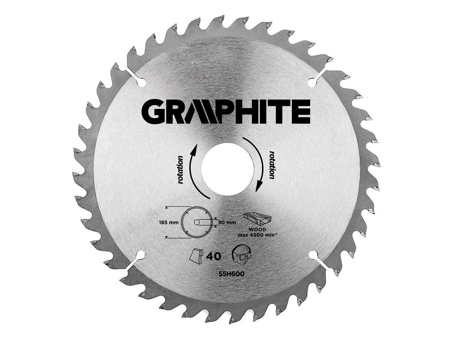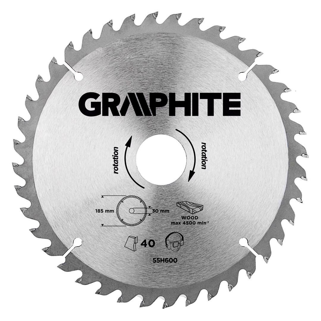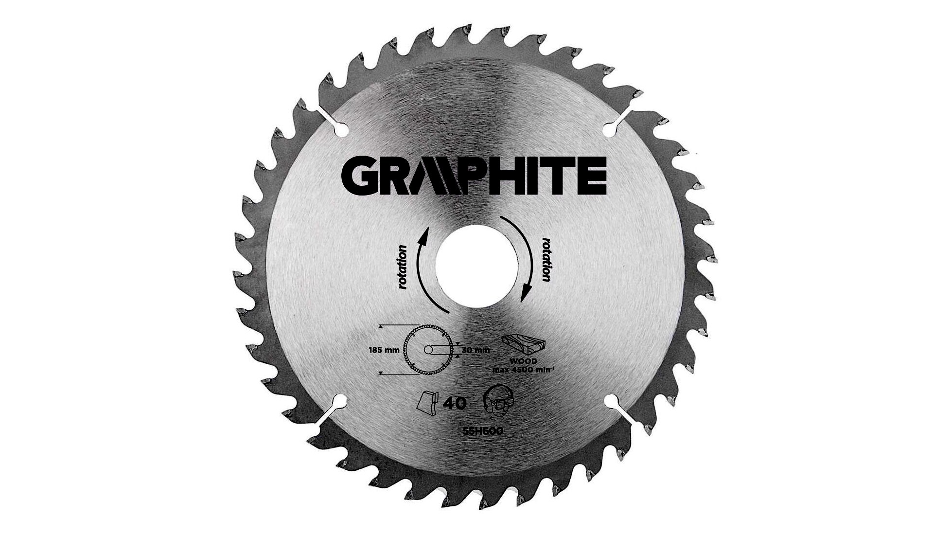A GRAPHITE vídiabetétes fűrésztárcsa (kat. sz. 55H600) átmérővel 185 mm, a hőmérsékletnek és a deformálódásnak igen ellenálló MN65-ös mangán acélötvözetből készül. Az YG6A vídiabetétes fogazás lehetővé teszi a fa és faalapú anyagok, mint pl. a rétegelt lemez, a forgácslap vagy az MDF lapok nagyoló vágását. A csomagolásban megtalálható szűkítő gyűrűk lehetővé teszik a fűrésztárcsák alkalmazását a fűrészgép típusok többségéhez.