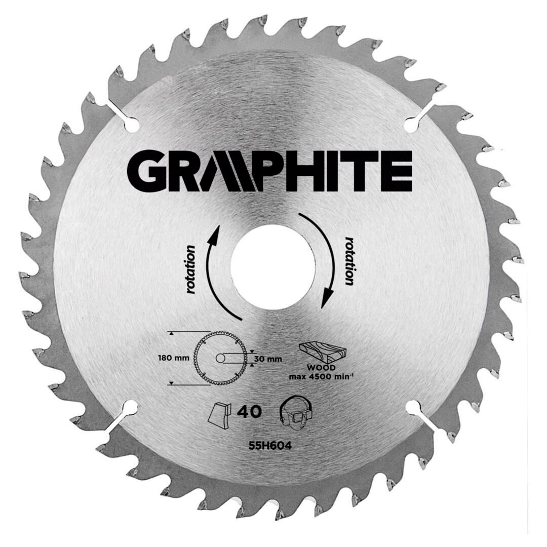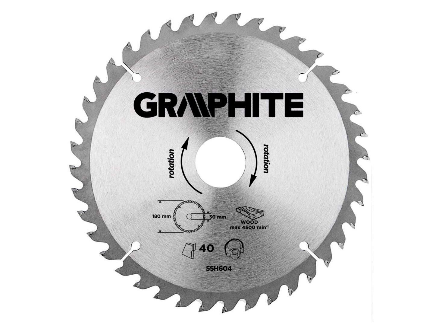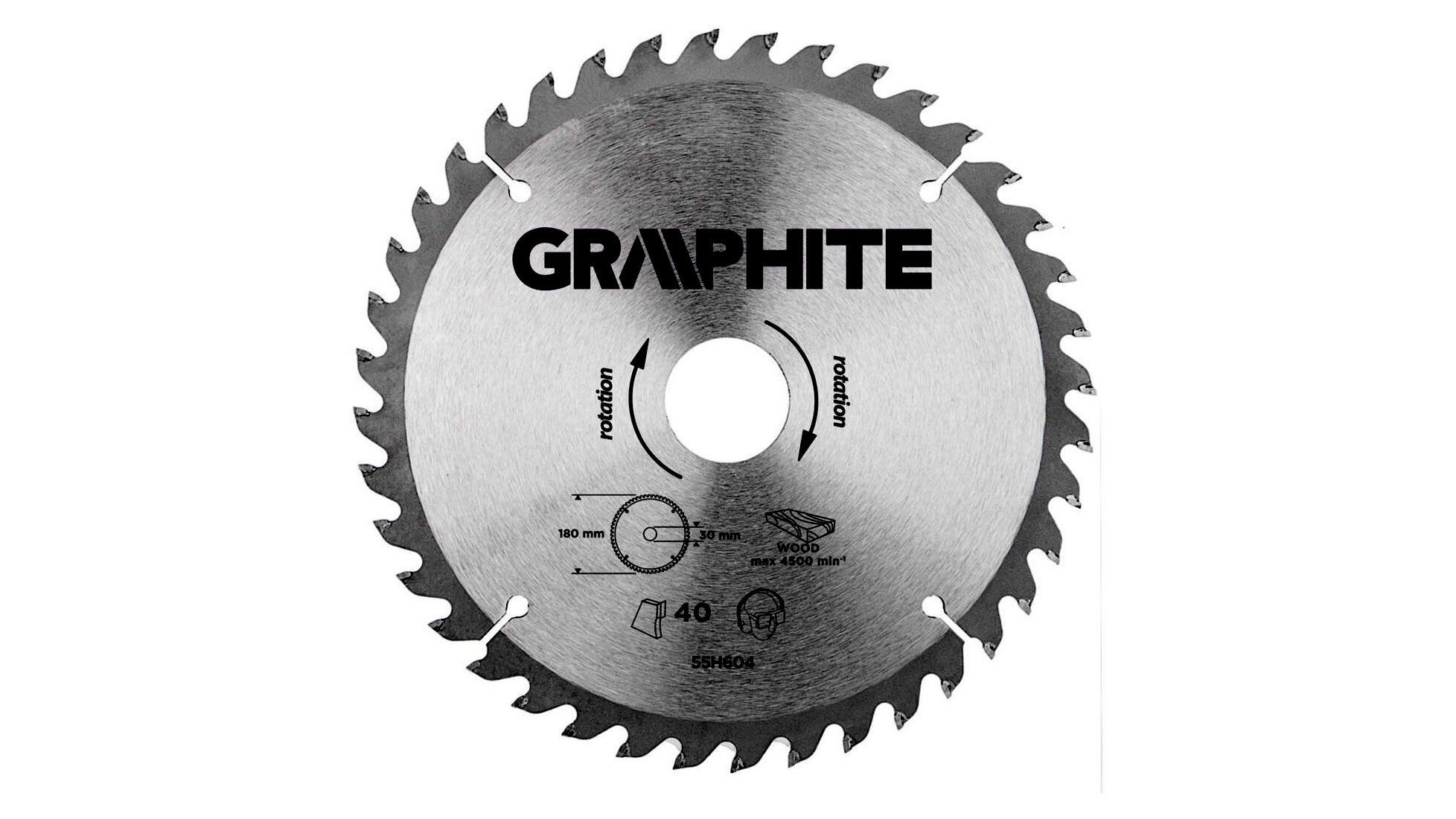 A GRAPHITE vídiabetétes fűrésztárcsa (kat. sz. 55H604) átmérővel 180 mm, a hőmérsékletnek és a deformálódásnak igen ellenálló MN65-ös mangán acélötvözetből készül. Az YG6A vídiabetétes fogazás lehetővé teszi a fa és faalapú anyagok, mint pl. a rétegelt lemez, a forgácslap vagy az MDF lapok nagyoló vágását. A csomagolásban megtalálható szűkítő gyűrűk lehetővé teszik a fűrésztárcsák alkalmazását a fűrészgép típusok többségéhez.