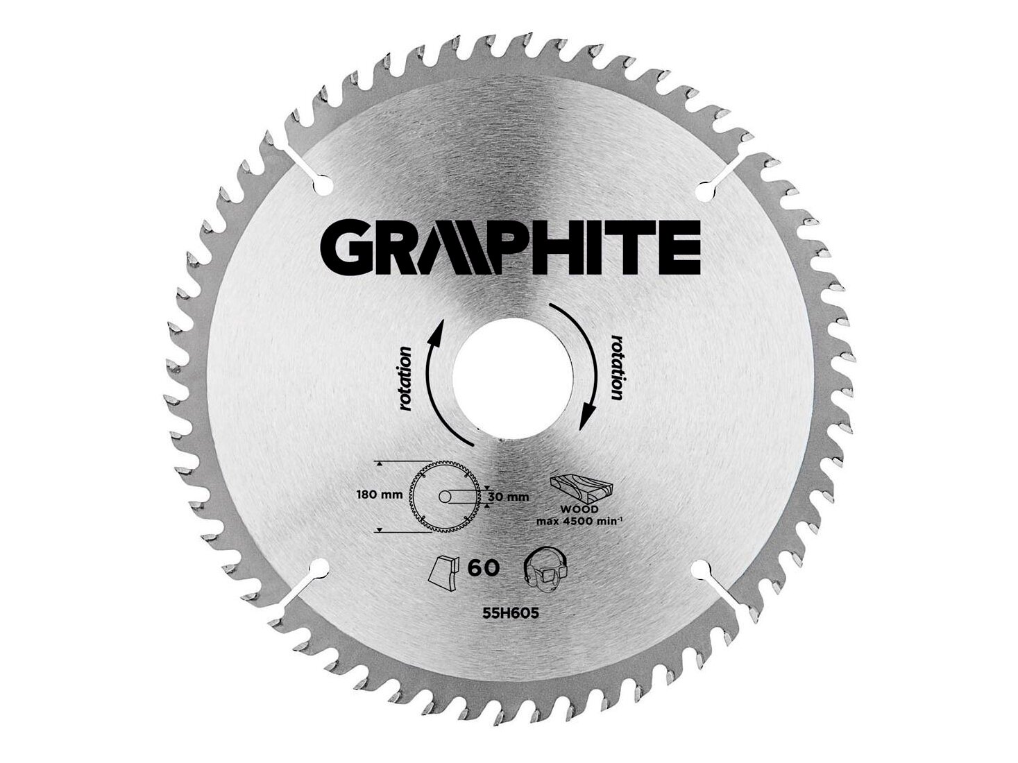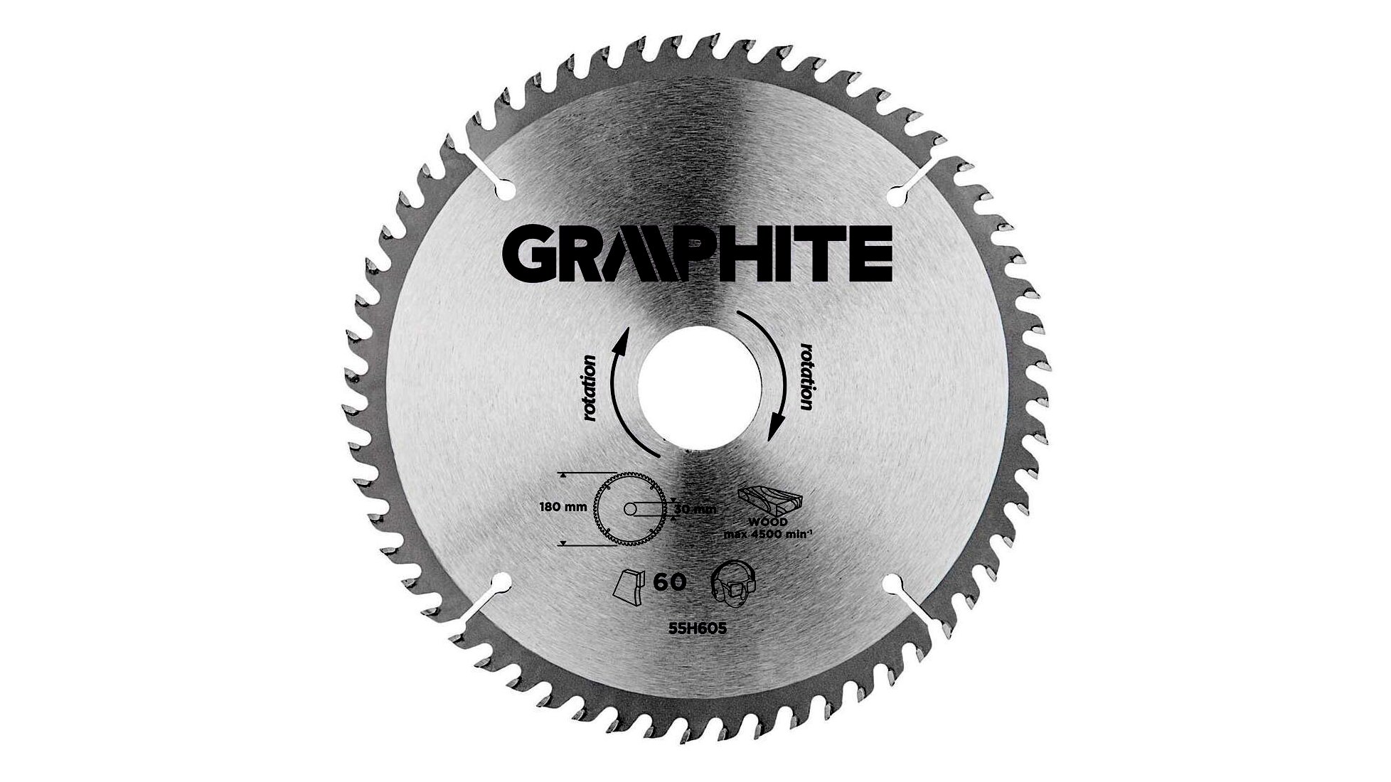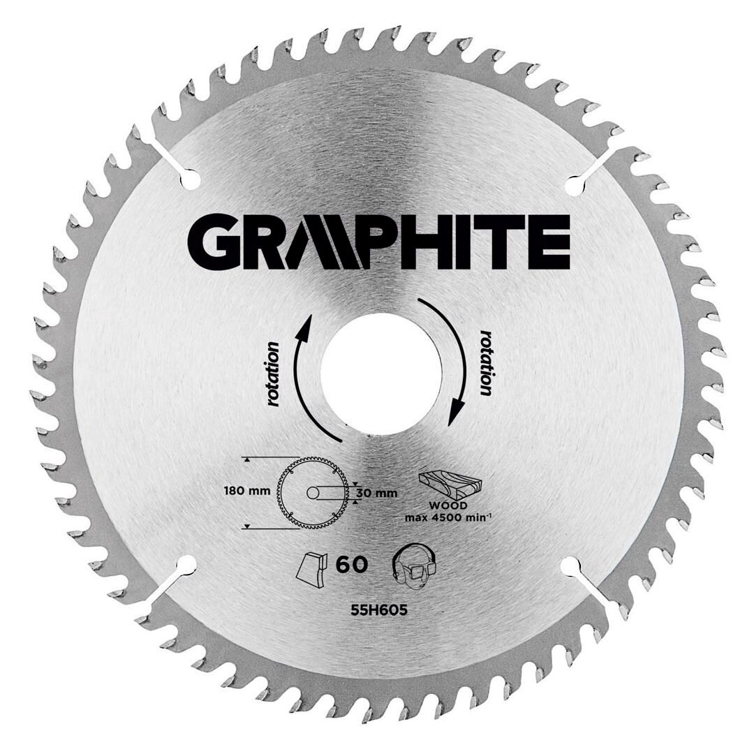 A GRAPHITE vídiabetétes fűrésztárcsa (kat. sz. 55H605) átmérővel 180 mm, a hőmérsékletnek és a deformálódásnak igen ellenálló MN65-ös mangán acélötvözetből készül. Az YG6A vídiabetétes fogazás lehetővé teszi a fa és faalapú anyagok, mint pl. a rétegelt lemez, a forgácslap vagy az MDF lapok nagyoló vágását. A csomagolásban megtalálható szűkítő gyűrűk lehetővé teszik a fűrésztárcsák alkalmazását a fűrészgép típusok többségéhez.