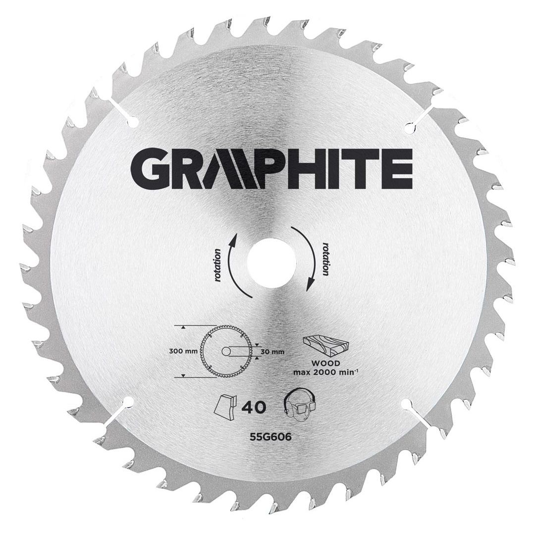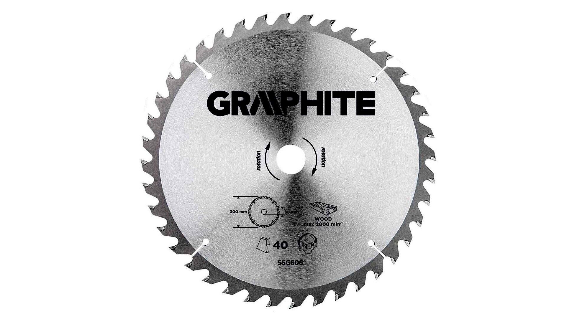 A GRAPHITE vídiabetétes fűrésztárcsa (kat. sz. 55H606) átmérővel 300 mm, a hőmérsékletnek és a deformálódásnak igen ellenálló MN65-ös mangán acélötvözetből készül. Az YG6A vídiabetétes fogazás lehetővé teszi a fa és faalapú anyagok, mint pl. a rétegelt lemez, a forgácslap vagy az MDF lapok nagyoló vágását. A csomagolásban megtalálható szűkítő gyűrűk lehetővé teszik a fűrésztárcsák alkalmazását a fűrészgép típusok többségéhez.