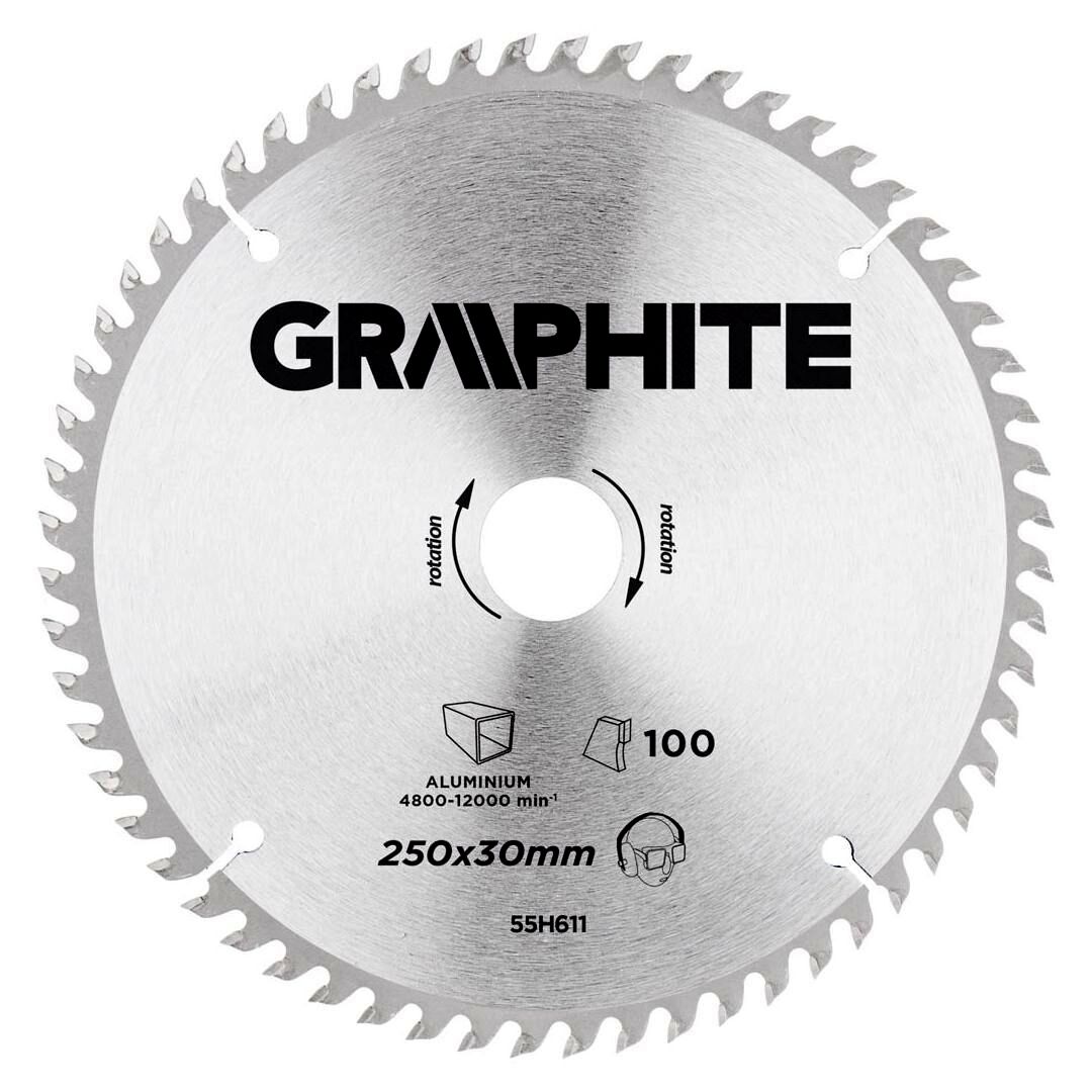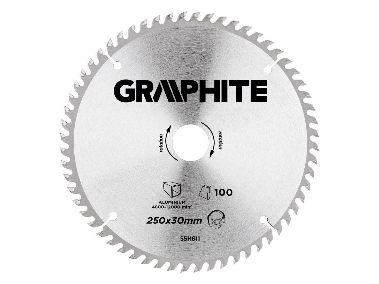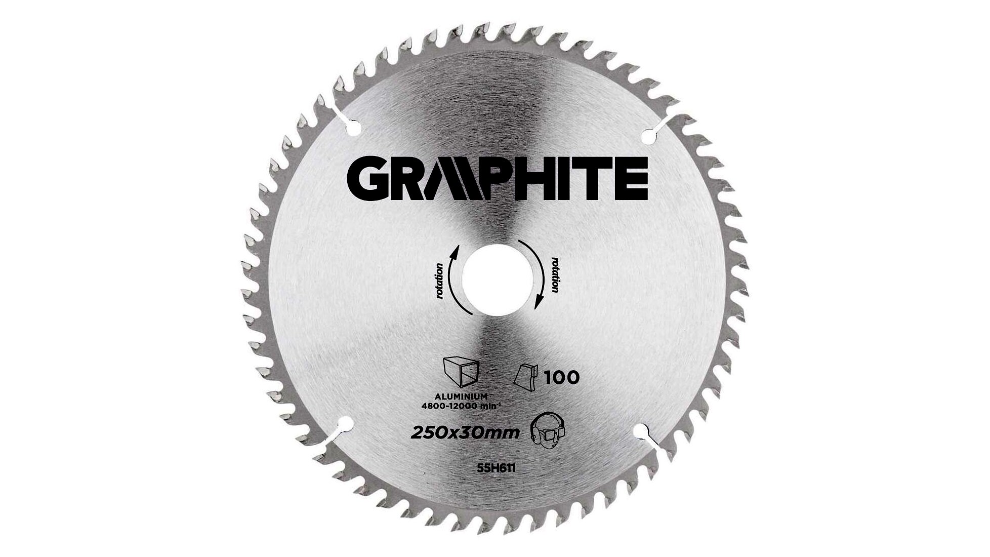 A 250 mm átmérőjű, GRAPHITE márkanevű keményfém fűrésztárcsa (hivatkozási szám: 55H611) az MN65 mangánacél ötvözetből készül, nagy hőállósággal és deformációval szemben. Az YG6A keményfém bevonatú fogak lehetővé teszik az alumínium vágását. A csomagolásban található redukciós gyűrűk lehetővé teszik a fűrészkorong használatát a legtöbb fűrészgép-modellnél.