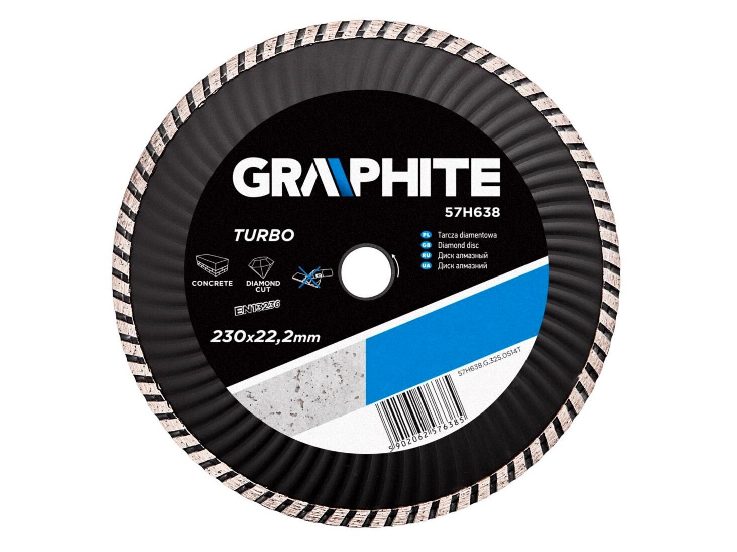 A GRAPHITE turbo wave gyémánttárcsa melegen préselt TURBO típusú szegmenseinek köszönhetően ideális nehéz építőipari munkákhoz. A különleges alakú tárcsa jelentősen javítja a munka közben a hűtést, meghosszabbítva az élettartamot. Az igen erős gyémánt szegmensek lehetővé teszik a betonból, vasbetonból, gránitból, márványból, kőből, téglából, stb. készült elemek effektív vágását.
