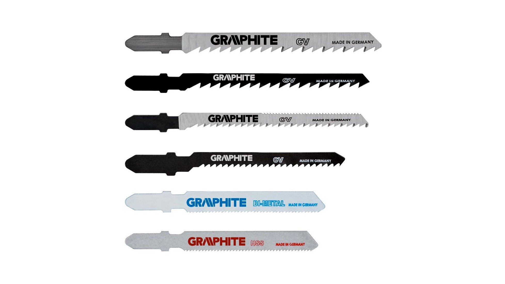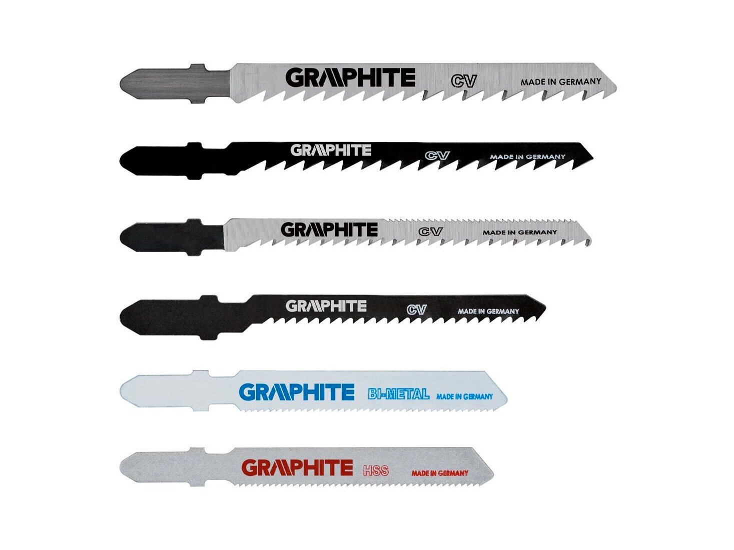 A GRAPHITE szúrófűrészlap készletben 6 db, különféle anyagok vágására szolgáló penge található. Fa vágására 4 fűrészpenge (nagyoló, pontos, valamint íves vágáshoz), 1 penge fém vágására, 1 pedig univerzális, fához és fémhez is. Mindegyik penge népszerű T típusú befogású, így használhatók a piacon kapható szúrófűrészek többségében.