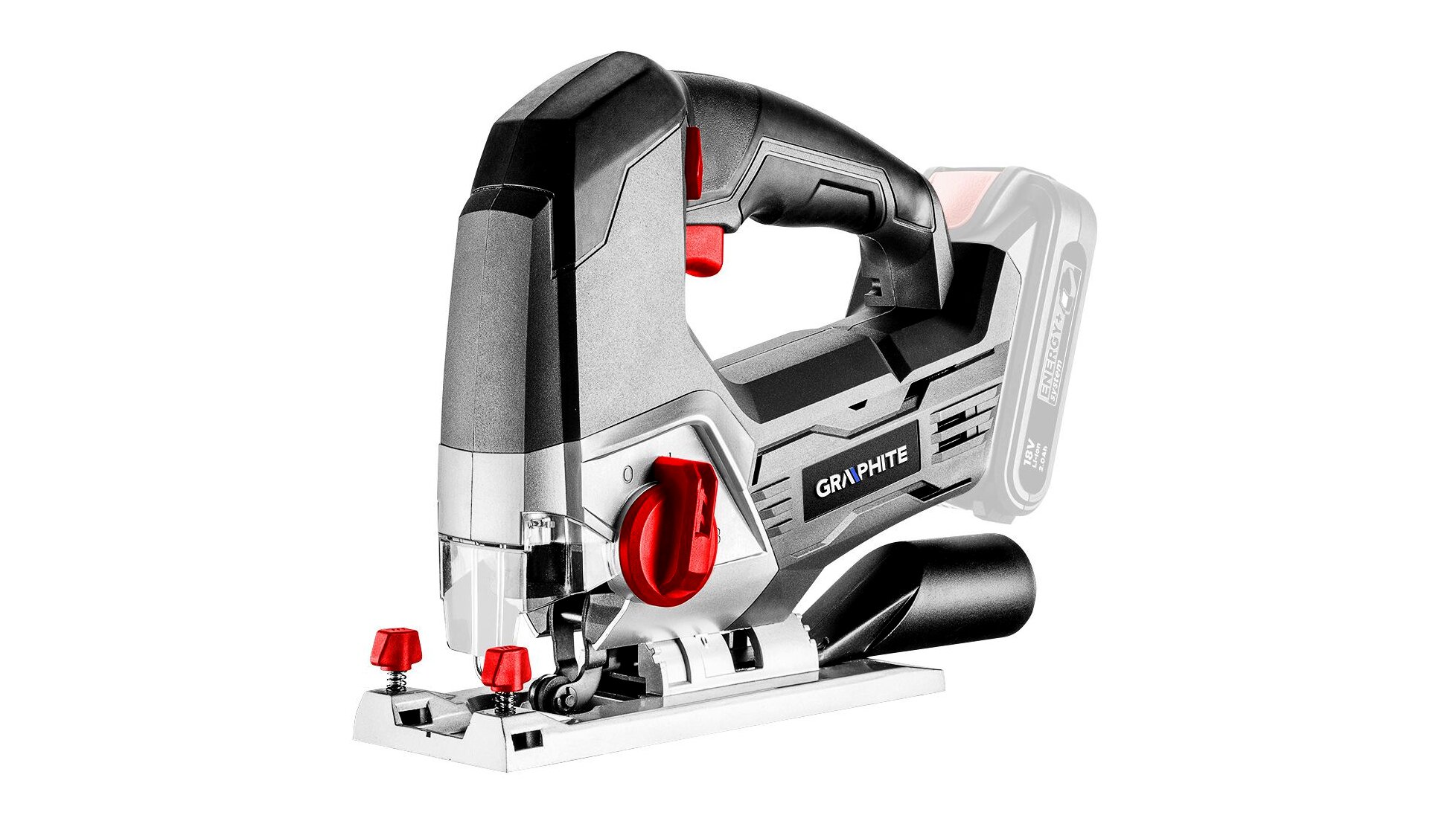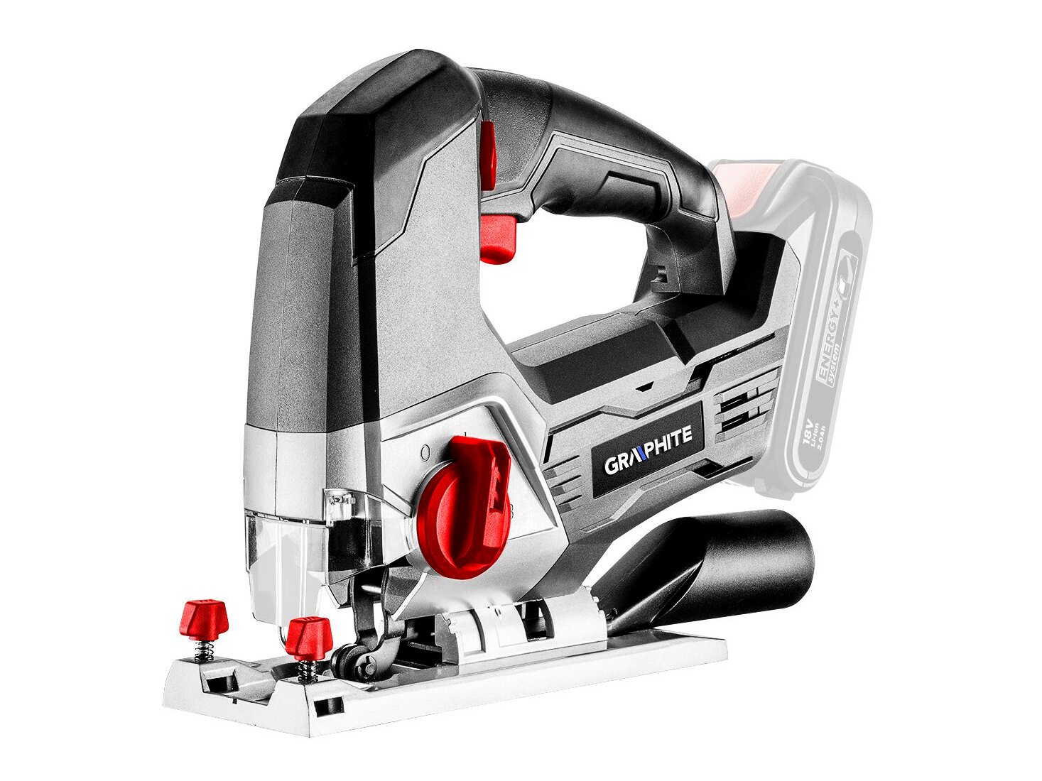 GRAPHITE dekopírfűrész, a 18V Li-Ion GRAPHITE Energy+ akkumulátorokkal kompatibilis. A berendezés maximálisan 80 mm vastag (fa) és 10 mm (fém) munkadarabok precíz és gyors vágásához alkalmas. A fordulatszabályozó egységgel a munka percenként 0 és 2400 rezgés között állítható. A dekopírfűrész alumínium talppal rendelkezik, mely 0° és 45° közötti terjedelemben jobbra és balra dönthető. Három fokozatú gépi előtolási lehetőséggel rendelkezik ami lehetővé teszi az egyes anyagokat gyorsabban vágását. A gép szerszámmentes fűrészlap cserélő rendszerrel és a munkahelyet megvilágító LED diódával került felszerelésre. A dekopírfűrész pengéje (25 mm mozgás) áttetsző biztosító tokban van, ennek anyaga tartós polikarbonát. A berendezés befogója T típusú fűrészlapok használatára alkalmas. A fűrész markolata véletlenszerű bekapcsolás ellen védő retesszel van ellátva, továbbá fogás helyének csúszásgátló bevonata kényelmessé és biztonságossá teszi a munkavégzést. A megmunkált anyagok keletkező por hatékony eltávolításának érdekében a dekopírfűrész lefújó és porelevezető rendszerrel került felszerelésre. A dekopírfűrész készletben egy párhuzamvezető sín is megtalálható.