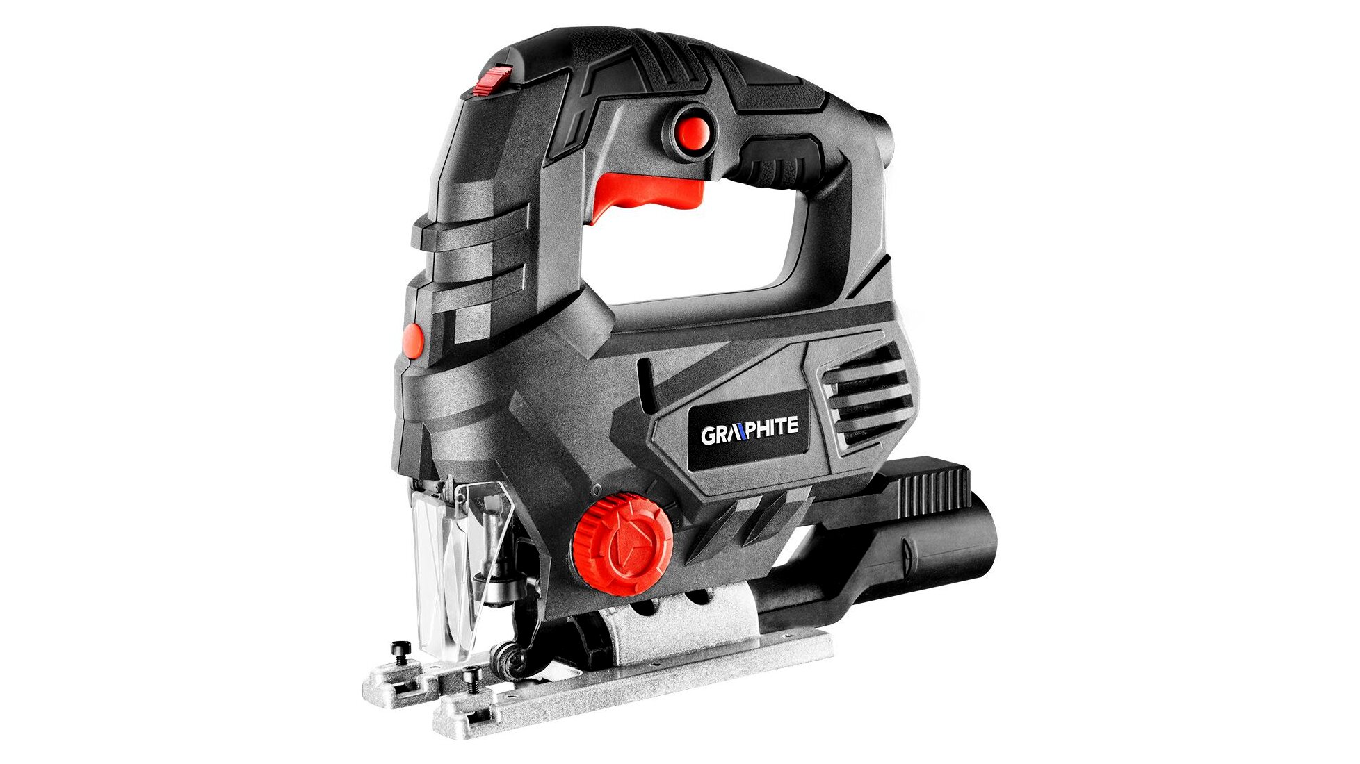 A GRAPHITE felső kategóriás, 650 W-os elektromos szúrófűrész legfeljebb 65 mm vastagságú fa és 8 mm vastagságú fém munkadarabok gyors és pontos vágására szolgál. A fordulatszám-szabályzás lehetővé teszi, hogy a készülék percenkénti 0 – 3 100 közötti löketszámot érjen el. A szúrófűrész alumínium talpa jobbra és balra 0° és 45° között állítható dőlésű, a talp hátsó részében praktikus fűrészpenge tároló kapott helyet. Az előtolás mértéke 3 fokozatban állítható, ami lehetővé teszi a vágás meggyorsítását egyes anyagokban. A szúrófűrész pengéjét (18 mm-es löket) ellenálló polikarbonátból készült átlátszó borítás védi. A készülék markolata kényelmes, reteszeléssel ellátott indítókapcsolóval felszerelt, és a komfort és a biztonság növelése érdekében csúszásmentes bevonatot kapott. A kézreálló szúrófűrész a por és forgács lefúvó és elvezető rendszerrel beválik úgy a kisiparban, mint az otthoni barkácsműhelyben. A szúrófűrészhez mellékelt tartozékok: hatlapú kulcs, fűrészlap - 2 db, párhuzamos vezetősín, hordtáska.