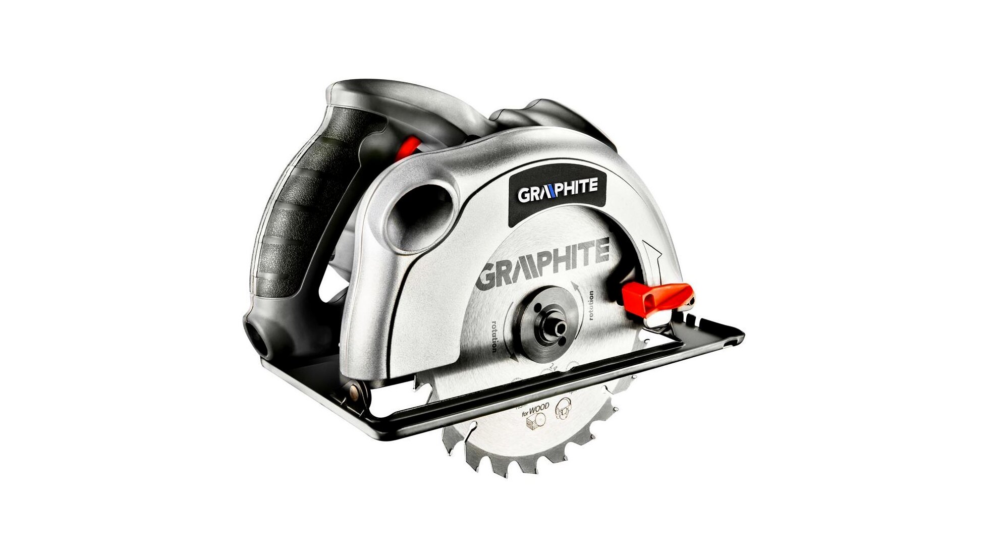 GRAPHITE körfűrész (kat. sz. 58G488) 1 200 W-os motor, 5 000/perc fordulatszám. A fűrész alkalmas 0°-45° tartományban ferdevágásra is. A vágandó anyag maximális vastagsága egyenes vágásnál max. 65 mm, ferdevágásnál 43 mm. A vágási szög és a vágási mélység szerszám használata nélkül beállítható – a vágási paraméterek beállítását külön skálák könnyítik meg. A körfűrész markolata véletlen bekapcsolás elleni reteszeléssel van ellátva, és csúszásgátló műanyaggal van bevonva a munka kényelmének növelése céljából. A fűrészgépben 185 mm külső átmérőjű, 20 mm átmérőjű rögzítőfurattal ellátott fűrésztárcsa használható. A fűrésztárcsa gyors cseréjét szolgálja az orsózár acél nyomógombja. A fűrésztárcsa alsó és felső védőborítása is alumínium ötvözetből készült. Szükség esetén az elhasználódott szénkefék saját kezűleg is kicserélhetők. A fűrészgéphez fűrésztárcsa és hordtáska is tartozik. A CE tanúsítvány bizonyítja az európai szabványoknak való megfelelést.