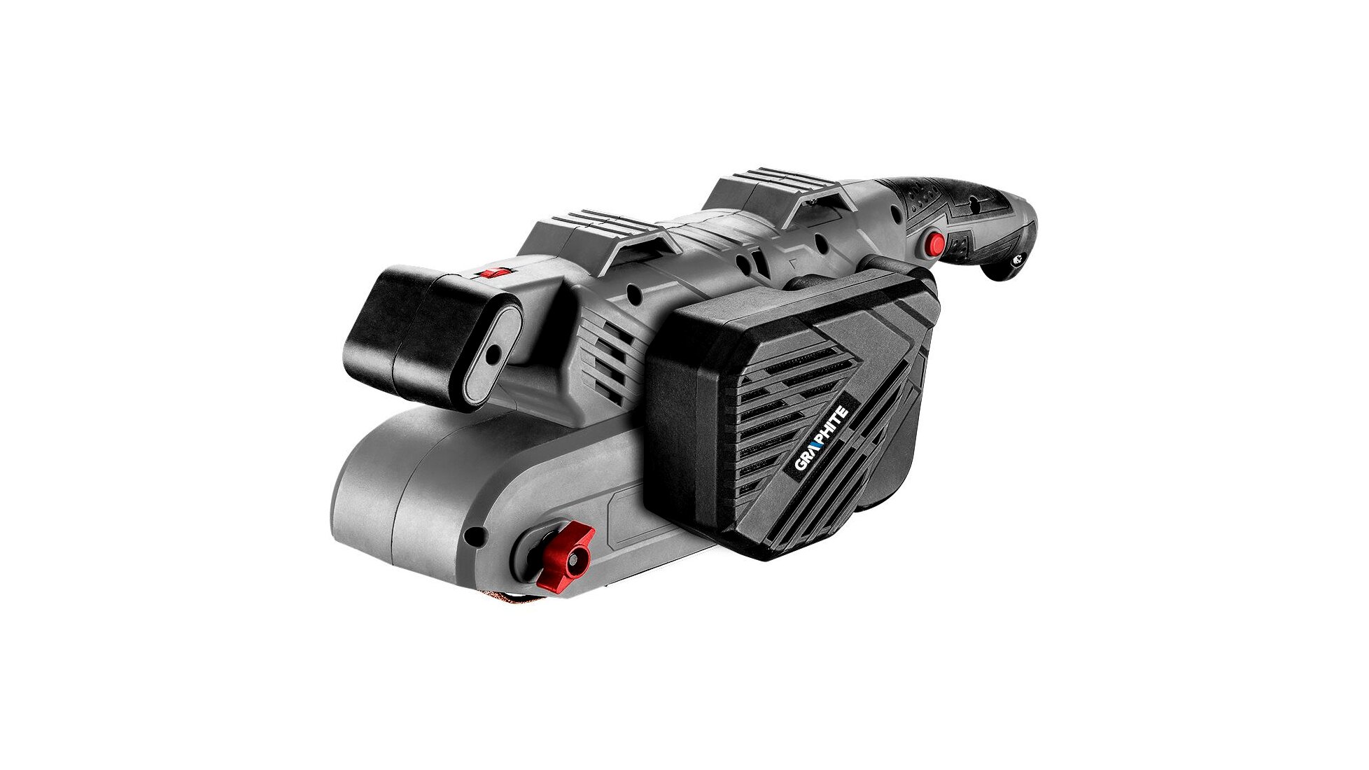 Speciális GRAPHITE szalagcsiszoló, teljesítménye 900W, rendeltetése szerint fa, fa alapú, fém és műanyag munkadarabok megmunkálására alkalmas. A berendezést ergonómiailag tervezett burkolat, korszerű formatervezés, a fogantyún elhelyezett csúszásgátló bevonat és profilírozott kiegészítő fogantyú jellemzi. A csiszológép további előnye, hogy a berendezés asztalhoz rögzíthető. Határozottan növeli a kezelő munkájának kényelmét és mozgásterét. A berendezés a rögzített üzemmódban alkalmas az apróbb fa alkatrészek, pl. bútor fogantyúk, rövid lécek, vagy kisiparosi termékek előállítására. A csiszológép vezető görgője a magas hőmérsékleteknek és a mechanikus hatásoknak ellenálló alumínium ötvözetből készül. Ezen túlmenően a berendezés folyamatos üzem kapcsolóval, továbbá beépített porelvezető rendszerrel van ellátva levehető tartállyal, ami megóvja a helyiséget a szennyeződéstől. A szalag előtolás maximális sebessége percenként 400 méter.