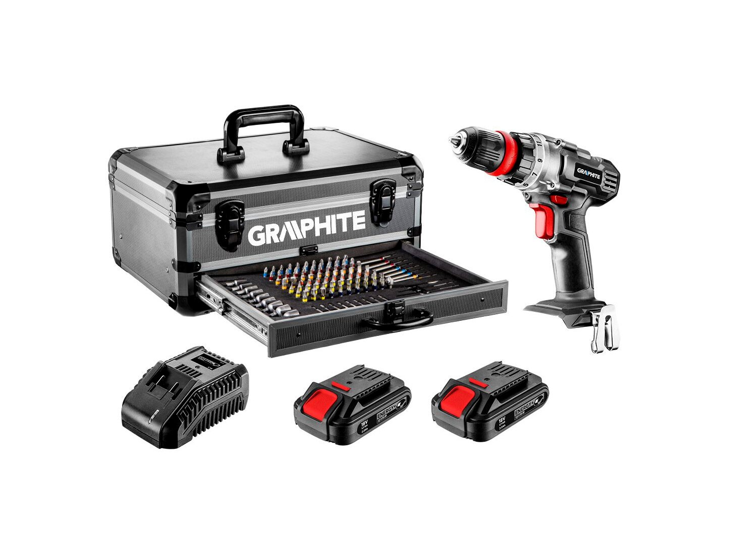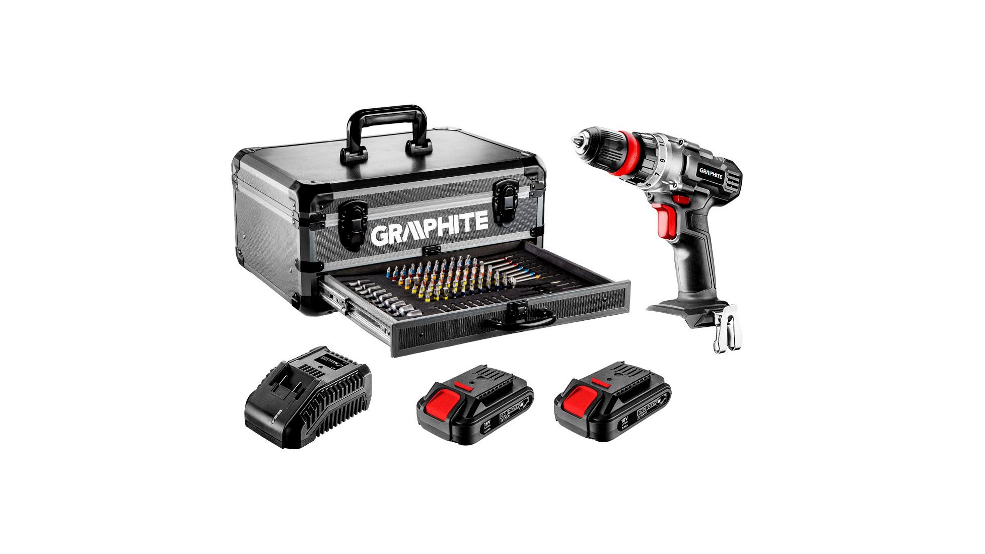 GRAPHITE Energy+ készlet. A készlet tartalma: fúró-csavarozó, 2 db akkumulátor 2.0Ah (58G002), akkutöltő (58G001) és 109 tartozék: bitek és fúrók. A készlet praktikus és tartós alumínium kofferben kapott helyet. A koffer a készlet minden alkatrésze számára helyet biztosító rendszerezővel került felszerelésre. A koffer fő rekeszében helyezhetők el a felhasználó további tartozékai. A készletben található bitek kimagasló keménységű S2 acélból készülnek. A készlet ideális megoldás a kedvenc szerszámainak könnyű tárolását és szállítását kedvelők számára, mindezt a külső tényezők általi megrongálódás kockázata nélkül.