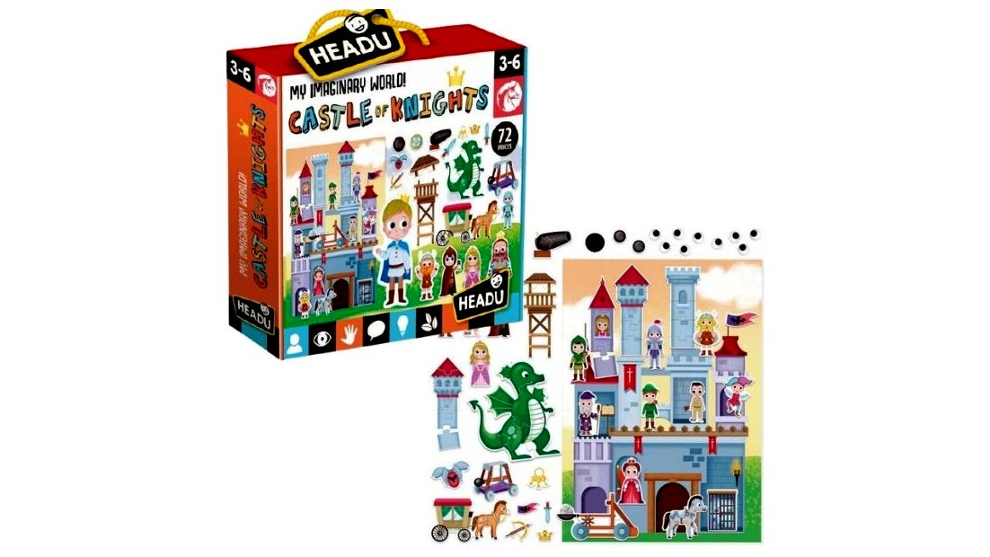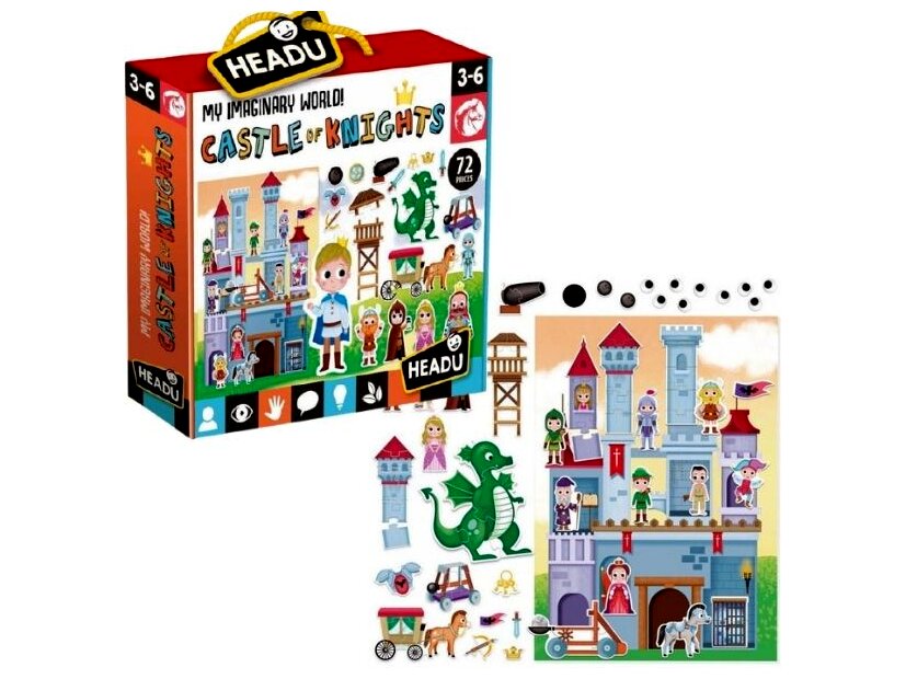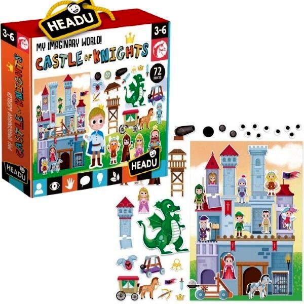 Talán minden kisgyerek eljátszott már azzal a gondolattal, hogy milyen lett volna a lovagkorban élni. A Headu lovagkastély logikai puzzle segítségével a képzelet és a kreativitás világa tárul a gyerekek elé egy lovagi kastély formájában. A kicsik elkészíthetik saját történetüket a 72 db igényesen kidolgozott, színes puzzle elem segítségével. A csomagban a gyerekek 15 db karaktert és 36 db öntapadó szemet is megtalálhatnak az óriásposzter mellett, hogy a középkori várat még élethűbben rendezhessék be.
