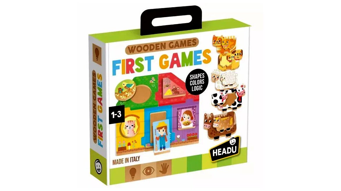 A Headu Első fajátékaim készlet jó választás 1–3 éves gyermekeknek otthoni, játékos fejlesztéshez: a formák és színek megismerését, a finommotorikát és az egyszerű logikai feladatok megértését támogatja tartós, fából készült elemekkel.