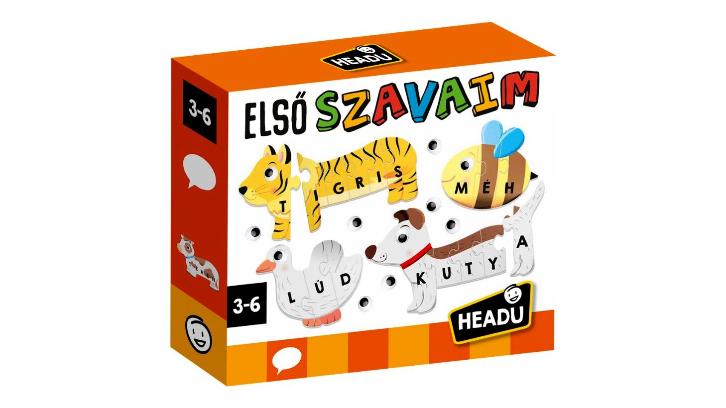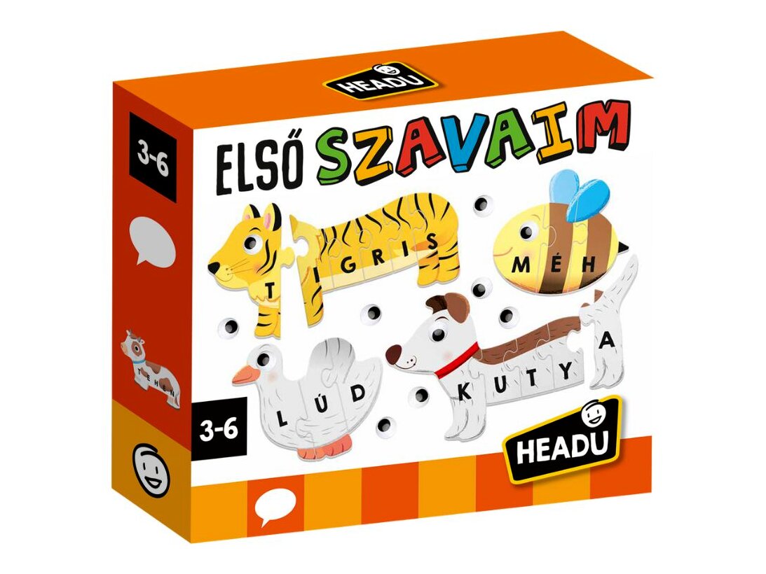 A Headu magyar nyelvű Első szavaim illesztőjátékával a gyerekek játékosan ismerkedhetnek meg az állatokkal és azok nevének betűivel. A készlettel háztáji, vízi és vadállatok képei rakhatók ki a tökéletesen illeszkedő, lekerekített szélű kirakós darabokból.Az egyes kirakóselemeken az állatok neveinek betűi is szerepelnek (magyar nyelven), így a gyerekek megfigyelhetik a nyomtatott betűk képét, majd később, az olvasástanulás során akár össze is olvashatják azokat. Ha a lurkók összeillesztették az állatkákat, a csomagban található felragasztható szemekkel tehetik teljessé a képeket.
