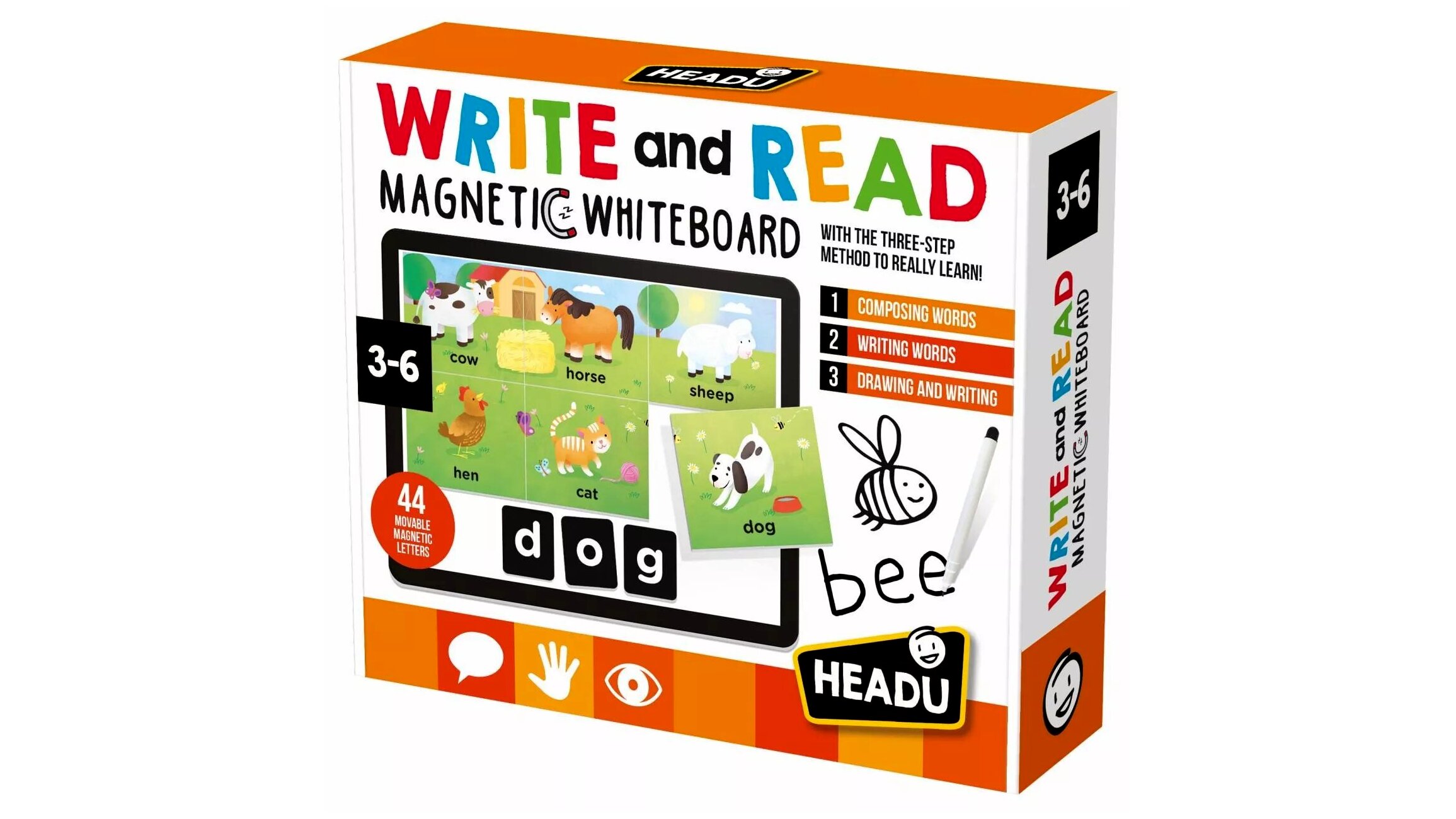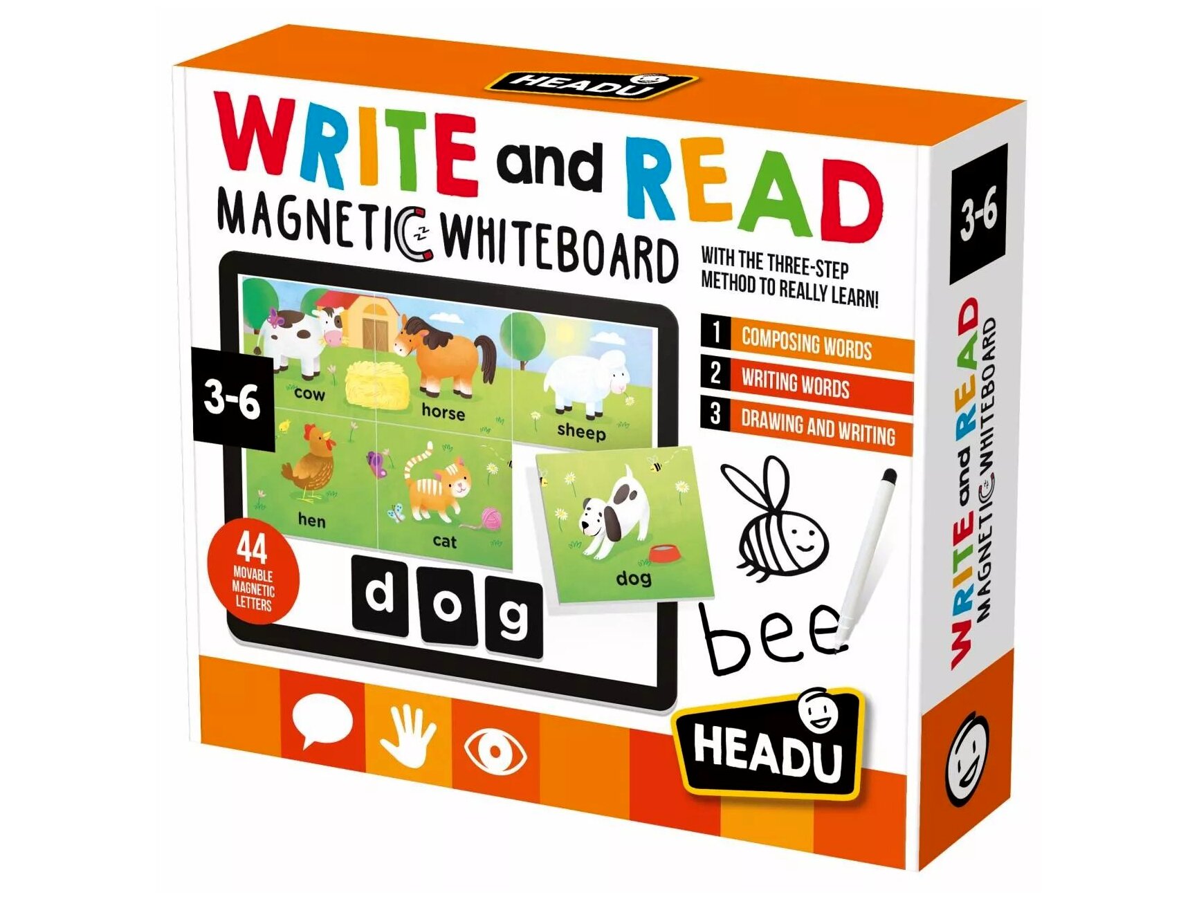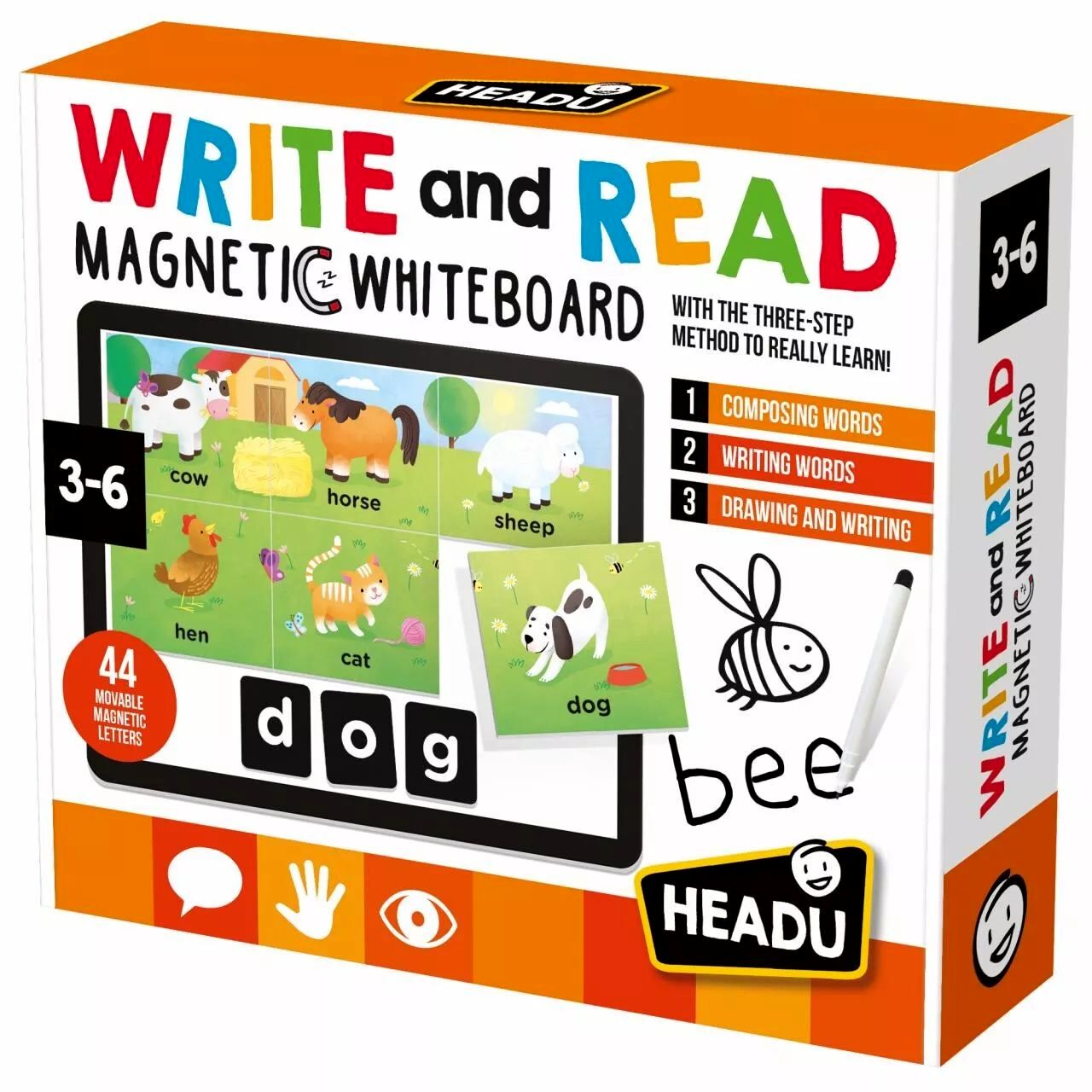 Tartalom: 1 db kétoldalas mágnestábla, mágneses betűk, képkártyák, 1 db letörölhető filctoll, 1 db kréta készlet, 1 db szivacs, használati útmutató