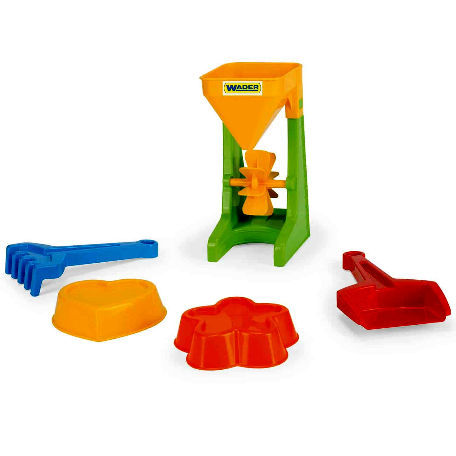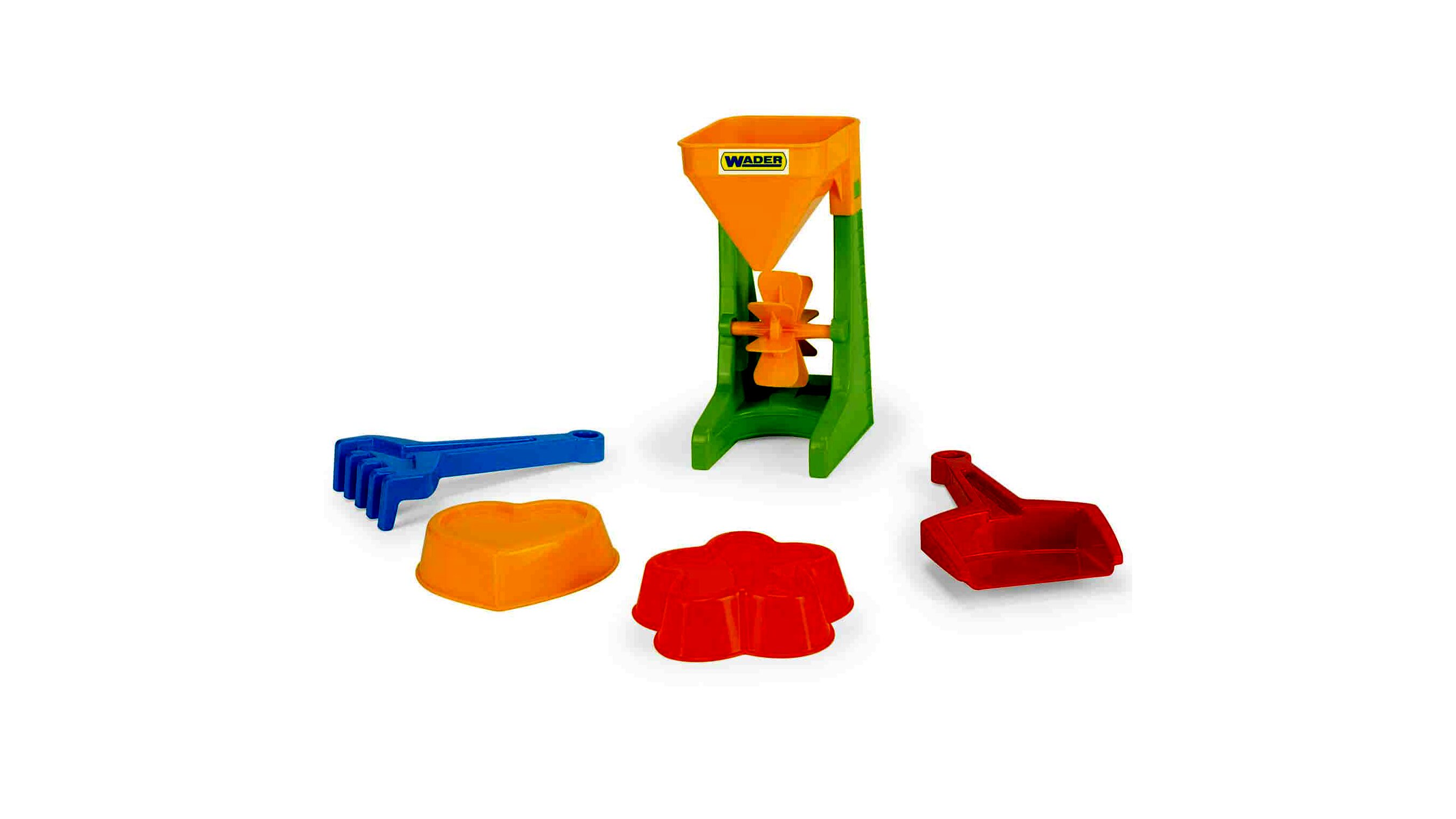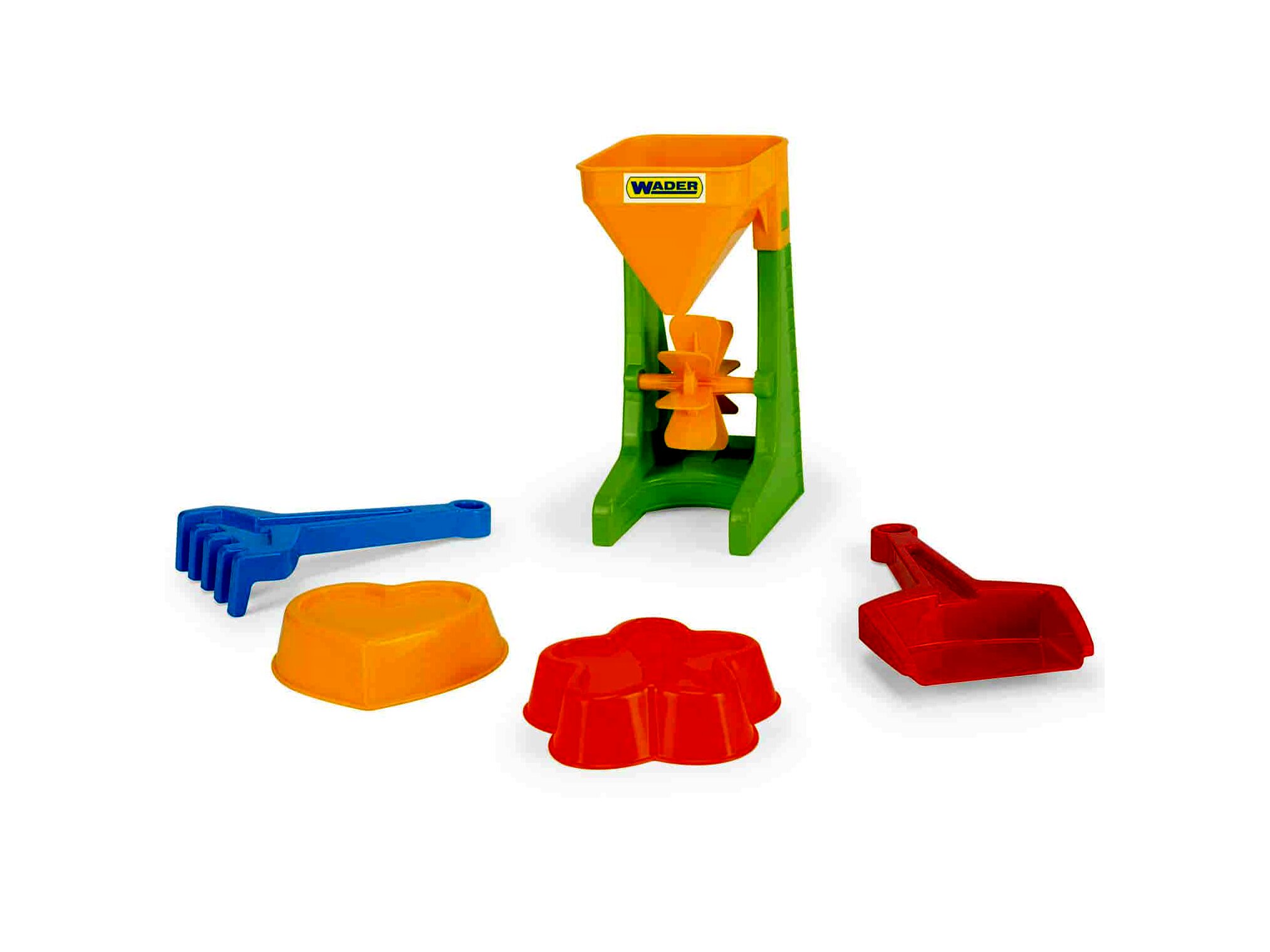 Műanyagból készült homokkal és vízzel is működő malom. Öntsd be a játék tetején a vizet vagy a homokot, ami lefolyva megpörgeti a lapátkereket. A csomagban egy kis lapát, gereblye és homokozó formák is megtalálhatóak.