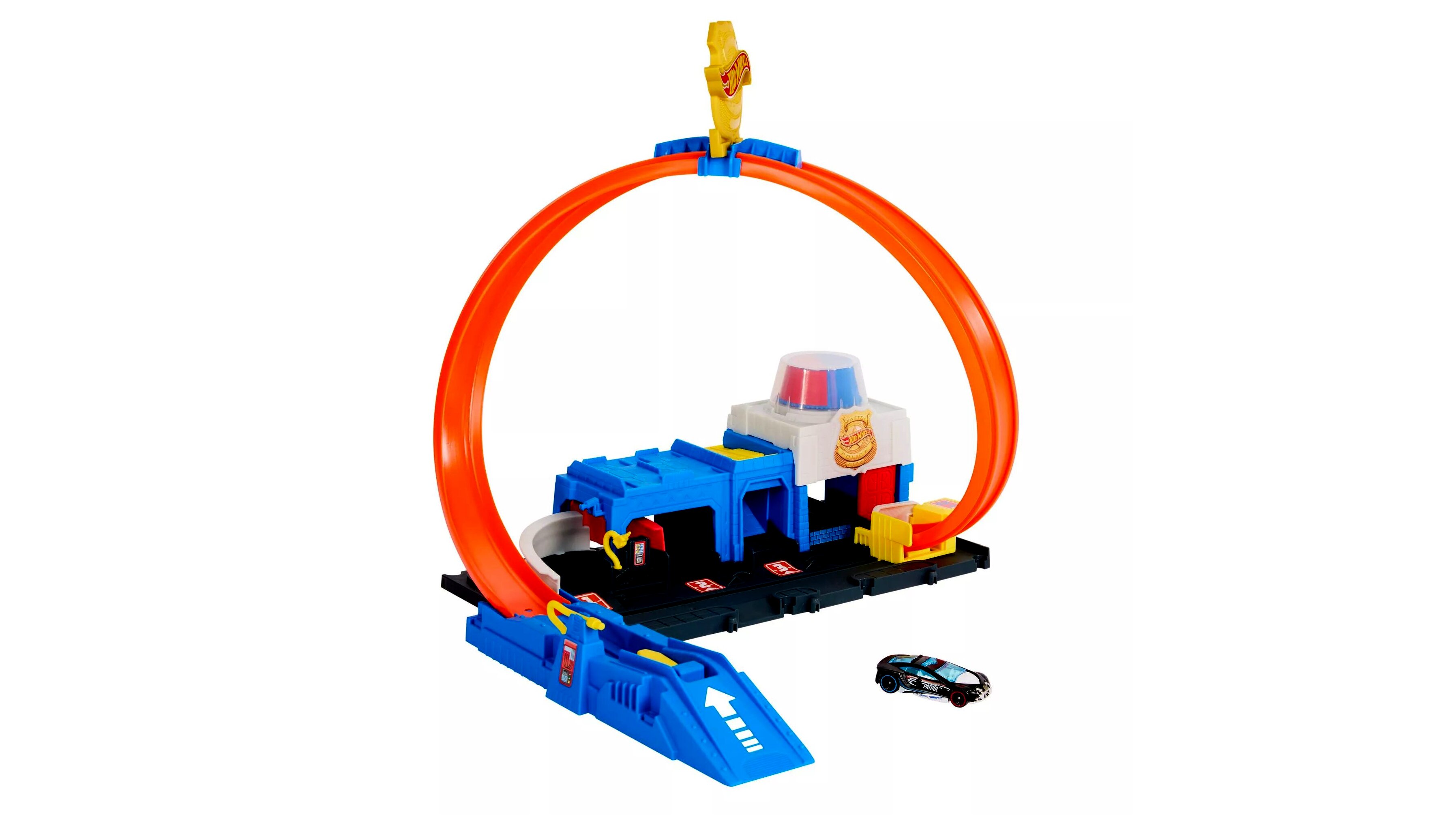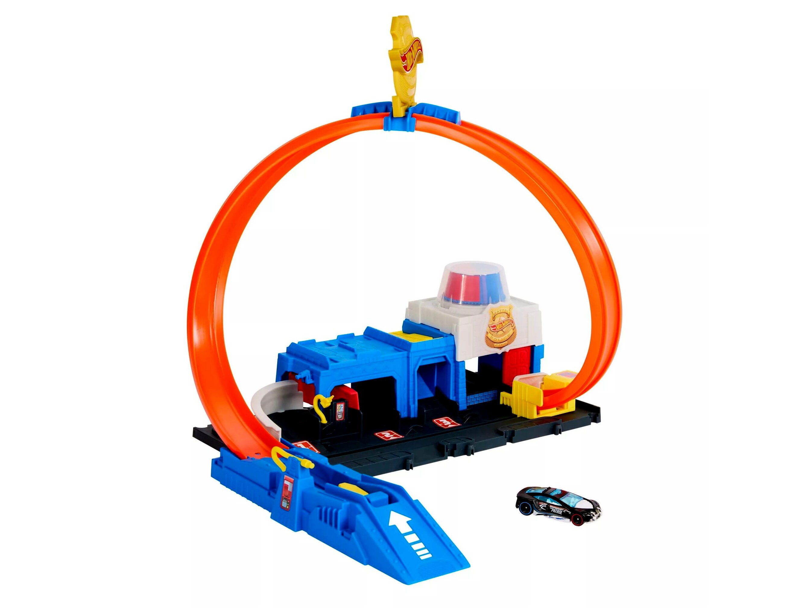 A Hot Wheels City Rendőrállomáson a gyerekek négy módon is versenyezhetnek a készletben található 1:64 méretarányú rendőrautóval vagy a kedvenc kisautóikkal. A készletben a hurokpálya vége a csúszkán négy helyre is beállítható, mindegyikkel más-más trükk hajtható végre.A rendőrállomáson 4 - külön kapható - kisautó is parkolhat és további pályaszettekkel is összeköthető, így egy egész Hot Wheels univerzum építhető. A játékszettben egy kisautó található, a további kisautók és pályaszettek külön kaphatók.