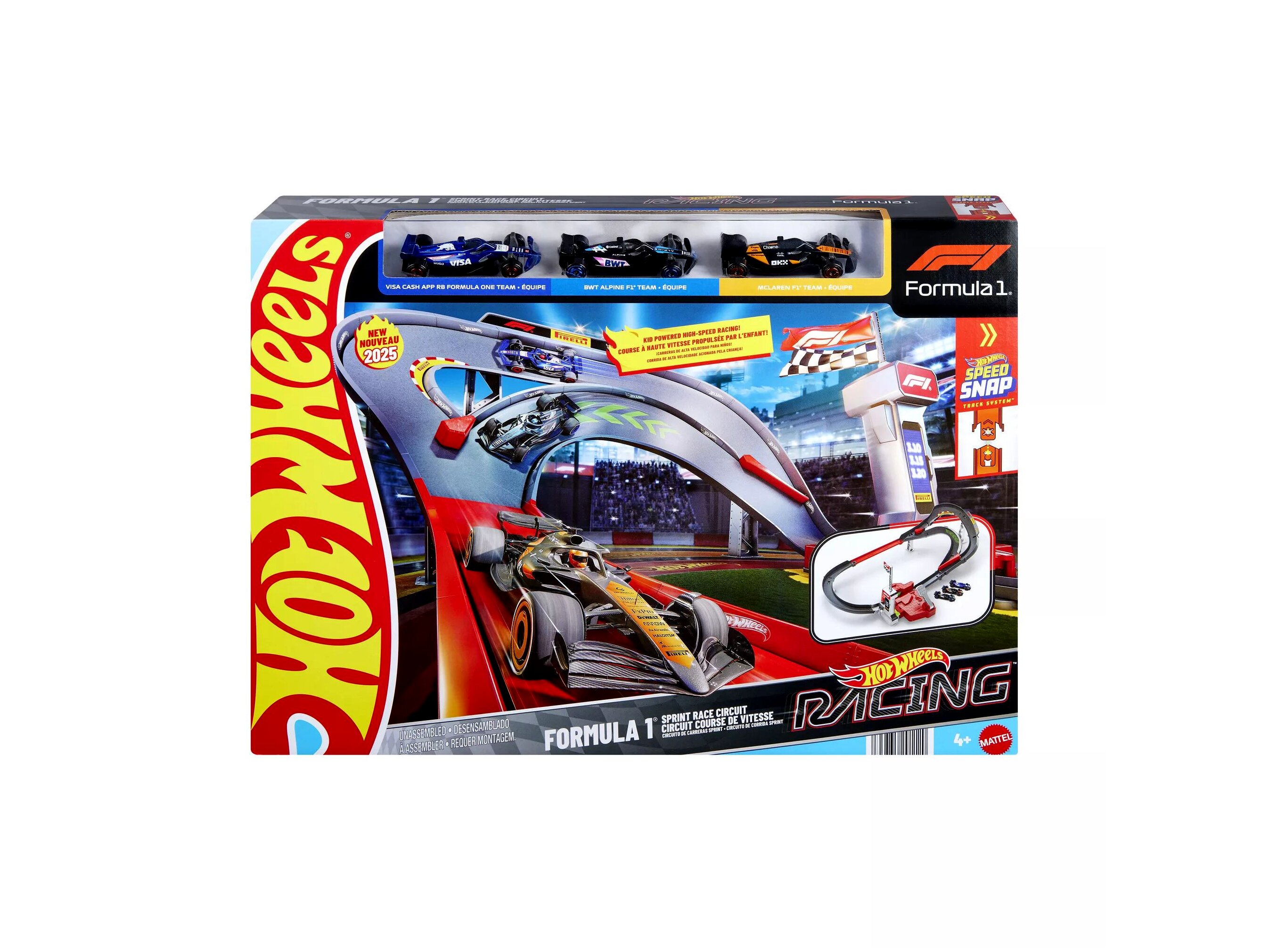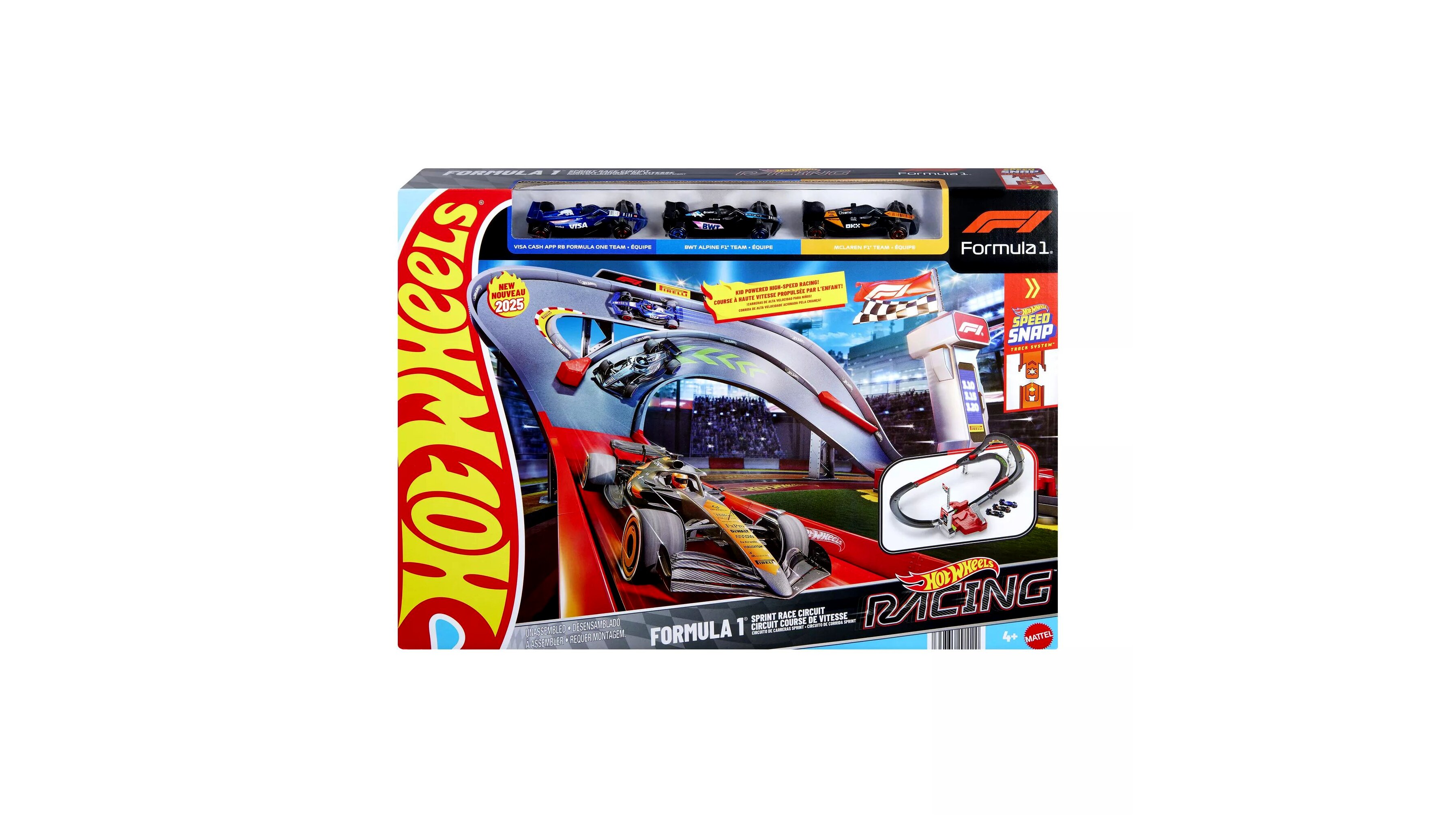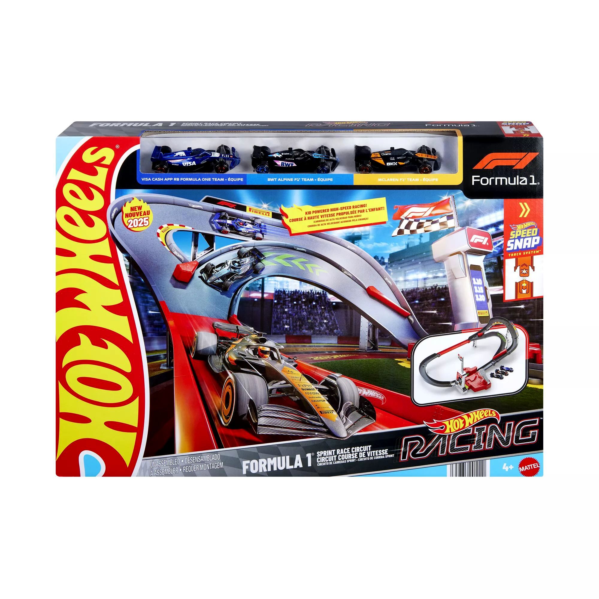 A készlet tartalmaz három darab 1:64 méretarányú Forma-1 kisautót, melyek festését ikonikus versenycsapatok ihlették, mint a McLaren Formula 1 Team, Alpine F1 Team és a RB Formula One Team. A pályaszettet két különböző játékmódban is lehet használni: verseny módban és végtelen módban. Verseny módban a járművek izgalmas előzésekkel száguldhatnak végig a pályán, míg végtelen módban a kisautók körbe-körbe járhatják a terelősávokat, akár az igazi versenyeken.