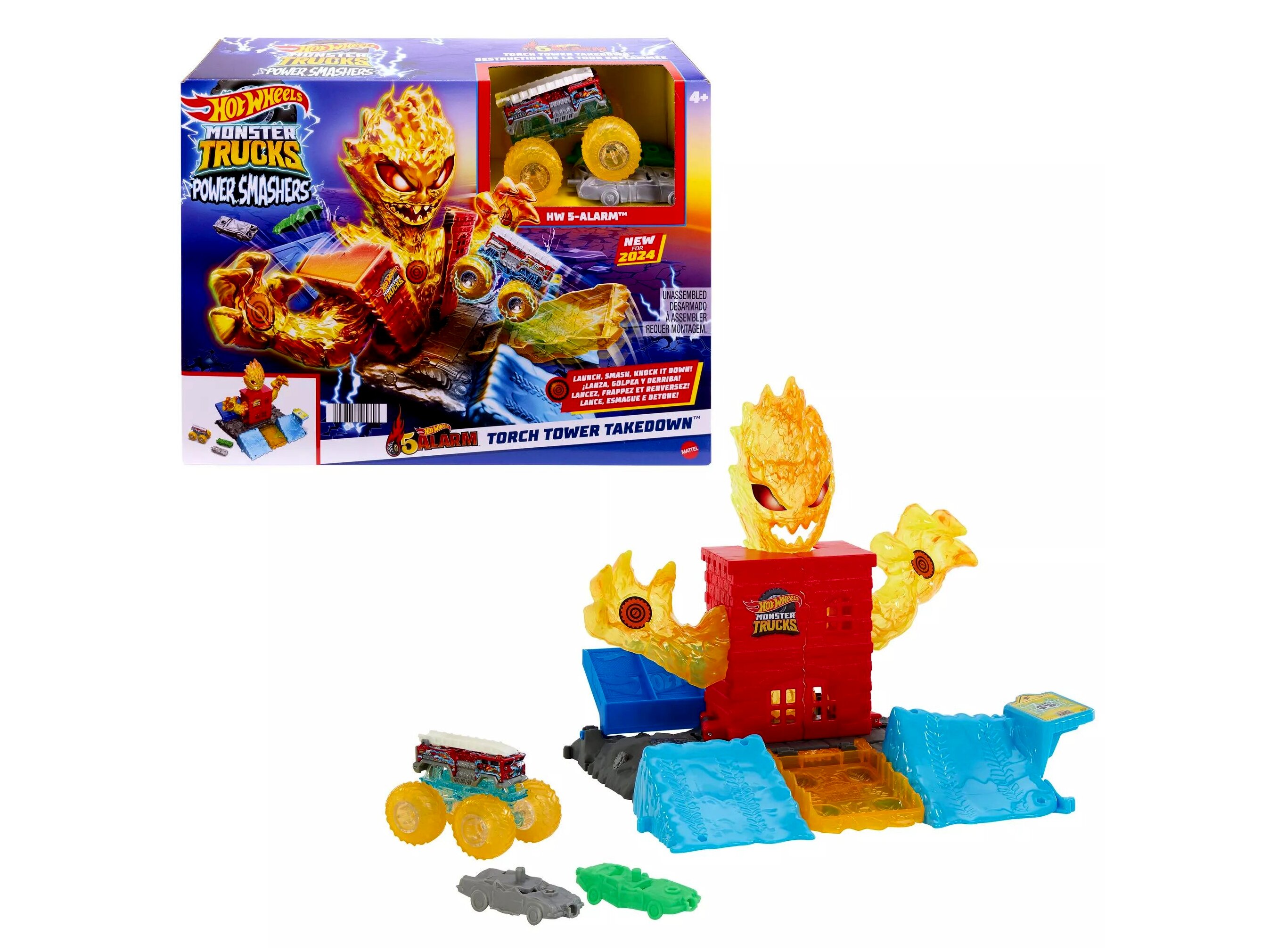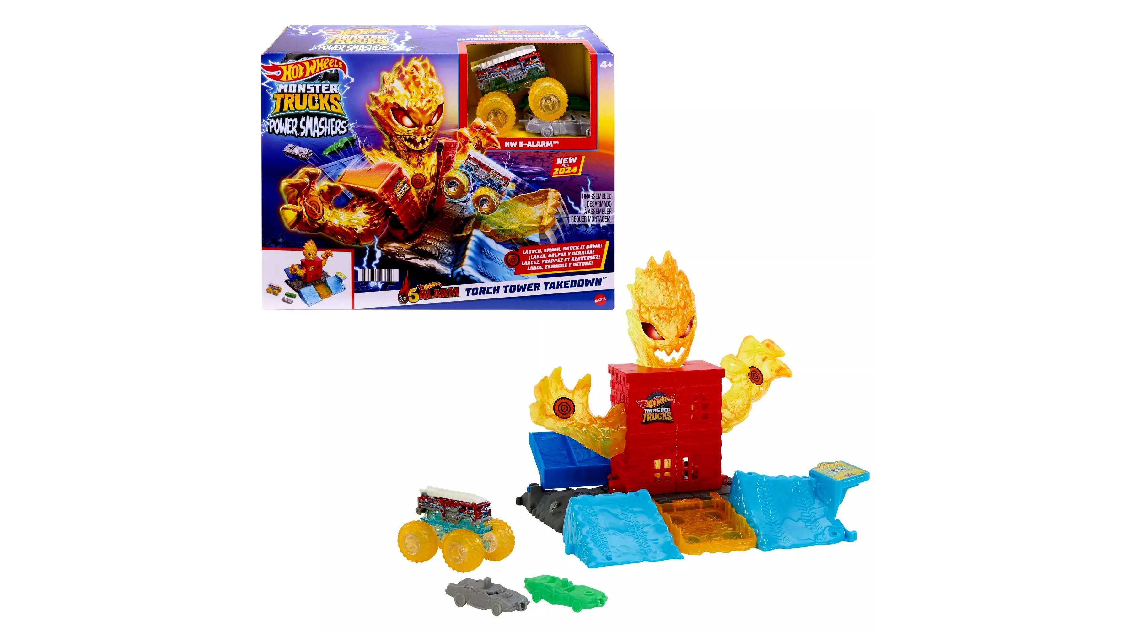 A gyerekek most mindegyiket átélhetik a Hot Wheels Monster Trucks Power Smasher Tűzszörny pályaszettel. A készletben egy 1:64 méretű 5-Alarm járgány küzdhet meg a tűzszörnyeteggel. Ha eltalálja a bestiát a megfelelő pontokon, ledöntheti a birodalmát. A sikeres küldetés egy vicces lezárást is kapott. A készlet 2 db további roncsautót is tartalmaz az extra zúzós élményhez.A játékszett összeköthető más Hot Wheels Monster Trucks készletekkel, így a gyerekek felépíthetik a saját világukat. A további készletek és kisautók külön kaphatók és elérhetőségük változhat. A színek és díszítések eltérhetnek.