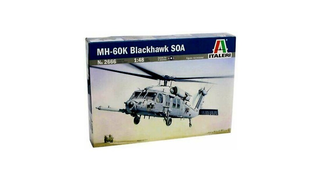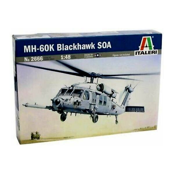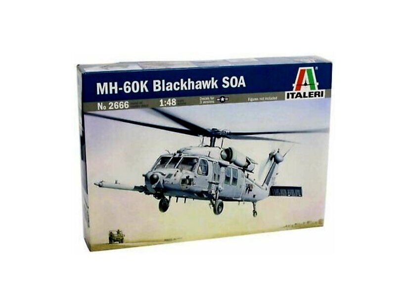 1:48 méretarányú, MH-60K Blackhawk Soa helikopter makett. A Sikorsky Aircraft által fejlesztett és gyártott, fő és farok rotoros, két gázturbinás helikopter. Az UH-60 egy többcélú, közepes teherbírású szállító helikopter melynek alapváltozatát UH, kommandós bevetéseket teljesítő alfaját MH jelöléssel látták el. A gép többféle feladatot is képes ellátni attól függően, hogy melyik változatról van szó. Belső rakterében 1170 kg terhet, külső függesztett teherként pedig 4050 kg terhet képes szállítani. 11 felfegyverzett katonaszállítására alkalmas.