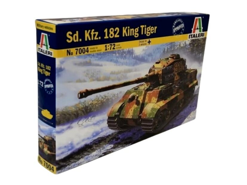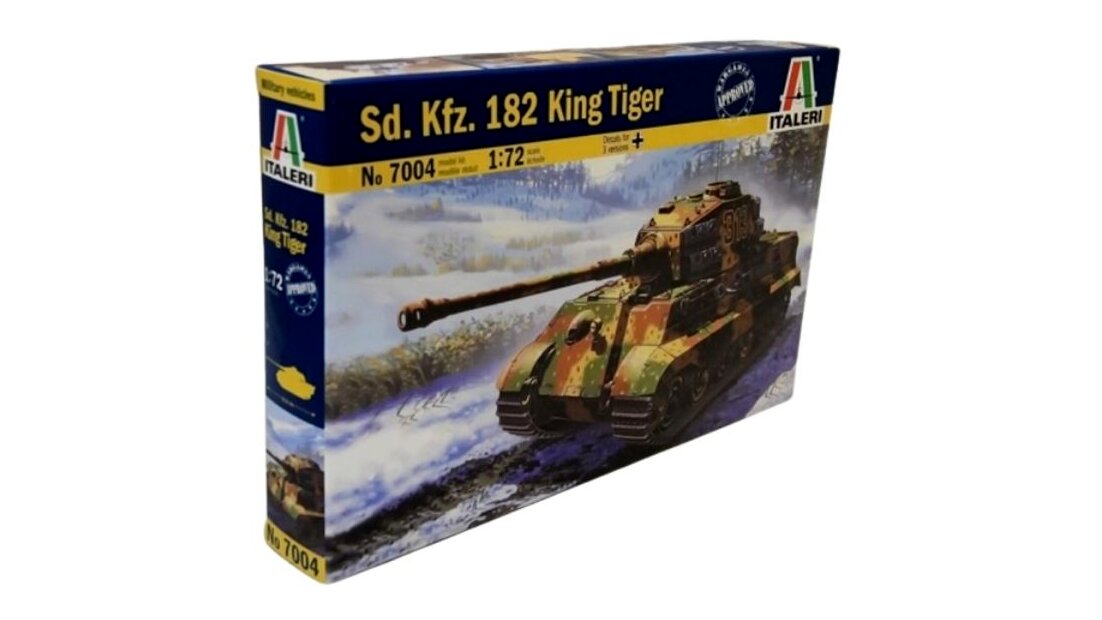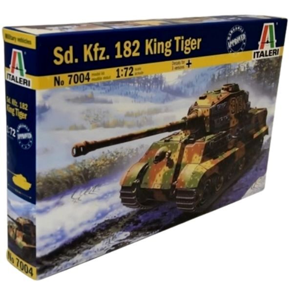 1:72 méretarányú Sd. Kfz. 182 Király tigris tank makett. A II. világháború egyik legerősebb harckocsija. A Panzerkampfwagen VI Ausf. B német nehézharckocsi, amelyet a második világháborúban a Pzkpfw VI és a Pzkpfw V Panther tapasztalatai alapján fejlesztettek ki. 1944 januárja és 1945 márciusa között összesen 492 darab Királytigrist gyártottak. A termelés üteme 1944 augusztusában érte el a maximumot, ez idő tájt 94 példány gördült le a gyártósorról. A legtöbb egyszerre hadra fogható Királytigris 1944 szeptemberében 226 darab volt. A háború vége felé közeledve a Királytigris megbízhatósága még a Párduc harckocsiét is meghaladta.Puszta tűzerő alapján a Királytigris akár 3500 m-es távolságból is meg tudta semmisíteni a Churchill, T-34/85, Cromwel illetve Sherman harckocsikat, ám az alacsonyabb találati valószínűségből adódóan ehhez legalább négy-öt lőszer felhasználására volt szükség. Takarékossági okokból ezért a legénység általában megvárta, amíg az ellenséges harcjármű 2000 m-es távolságon belülre ér, így egy-két lövéssel is könnyedén elpusztíthatták az ellenséges páncélost, amely még abból a távolságból sem vehette fel a küzdelmet vele. Akadtak azonban olyan páncélos ászok, akik nem követték ezt a gyakorlatot, és nagyobb távolságból is kielégítő találati arányt értek el.
