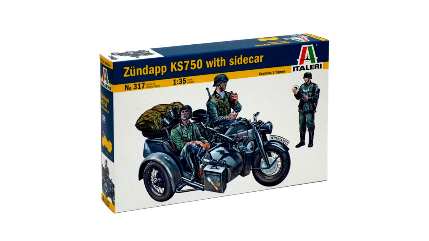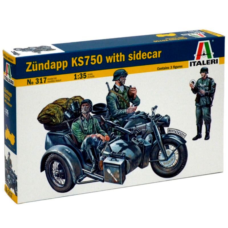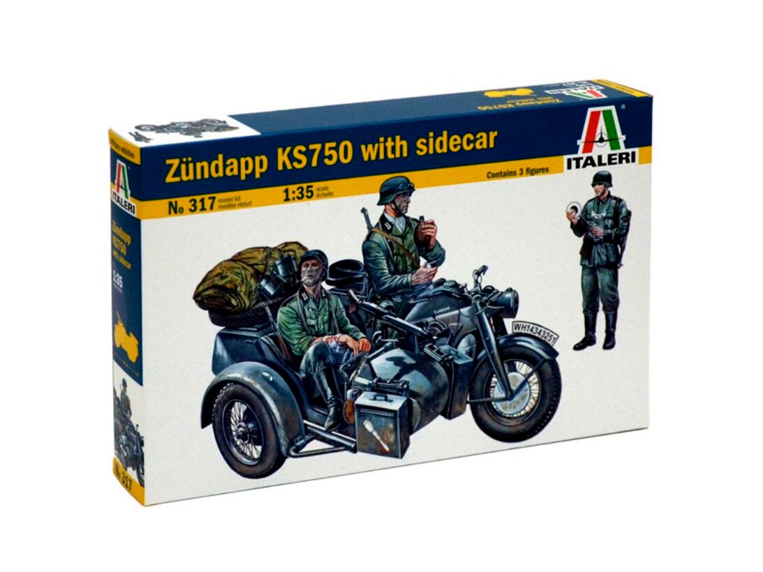 1:35 méretarányú műanyag motorkerékpár makett. A Zündapp KS750 egy II. világháborús német oldalkocsis motorkerékpár, amelyet a német Wehrmacht számára fejlesztett ki a második világháború idején a szintén német Zündapp GmbH cég. Miután 1941-ben szolgálatba lépett, az összes nagyobb német harctéren megfordult, és különféle szerepekben használták. Az oldalkocsira gyakran szereltek MG34 vagy MG42 géppuskát.