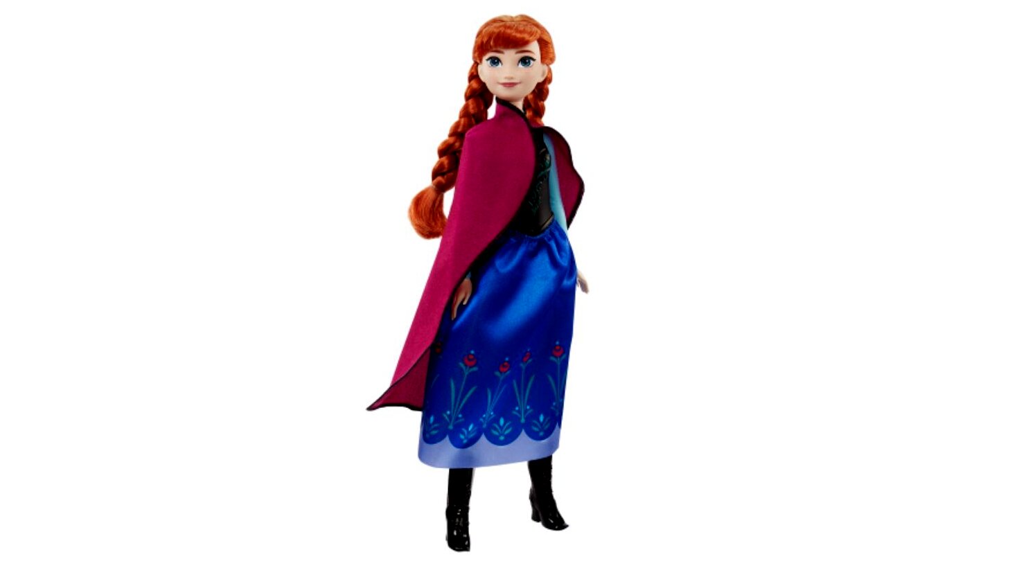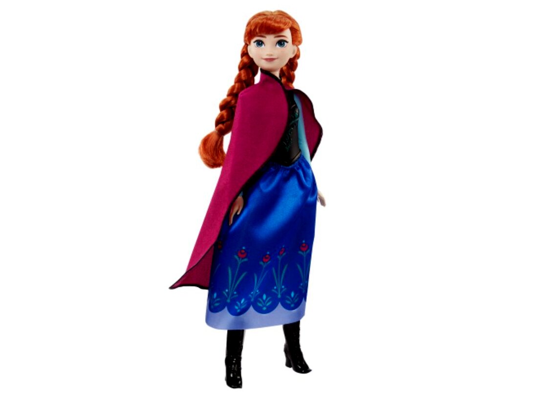 Ez a mozgatható Anna divatbaba a híres kék és lila utazó ruháját viseli, mely tartalmaz egy levehető puha köpenyt, szoknyát és cipőket.