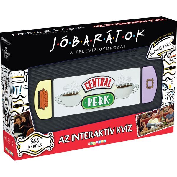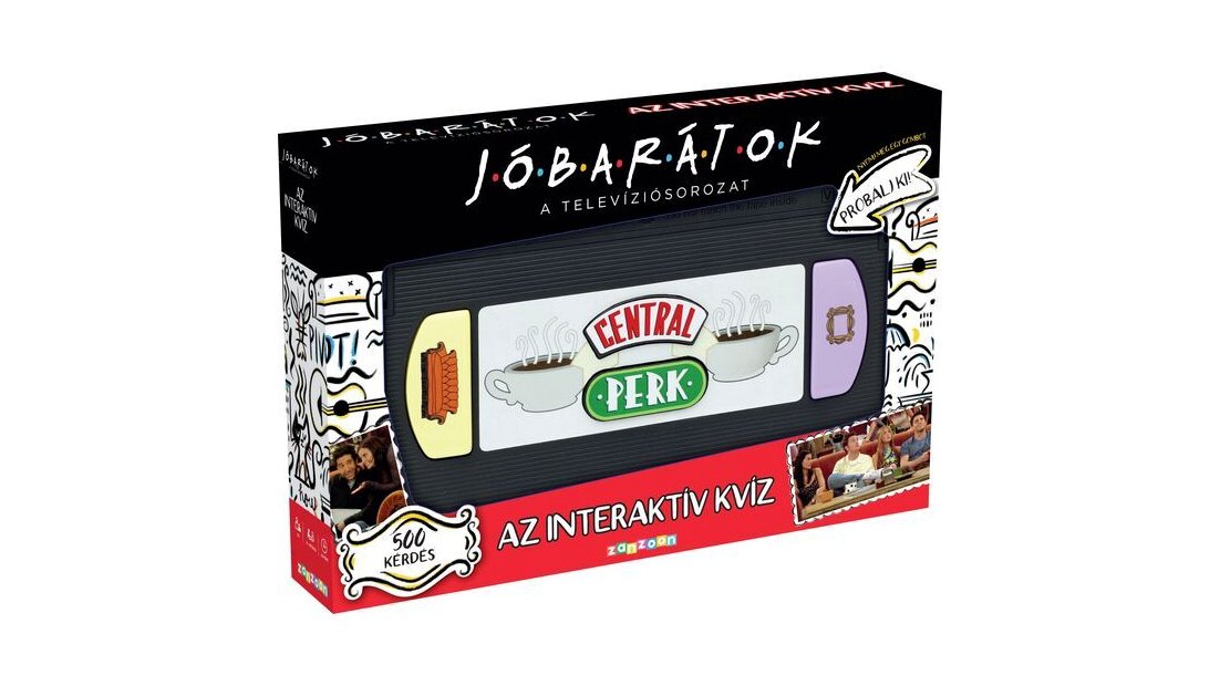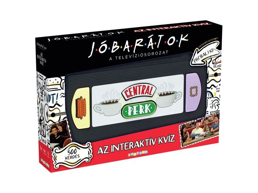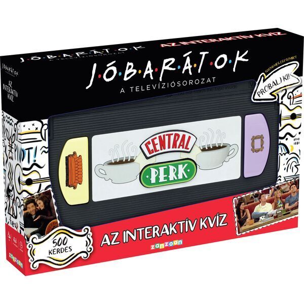 Jóbarátok családi társasjáték különleges, videokazetta formájú konzollal, amin a Central Perk kávézó logója szerepel. Ebben az interaktív kvíz társasjátékban most ti is kipróbálhatjátok tudásotokat a népszerű sorozattal kapcsolatosan. 500 kérdés vár a játékosokra, hogy megválaszolják!