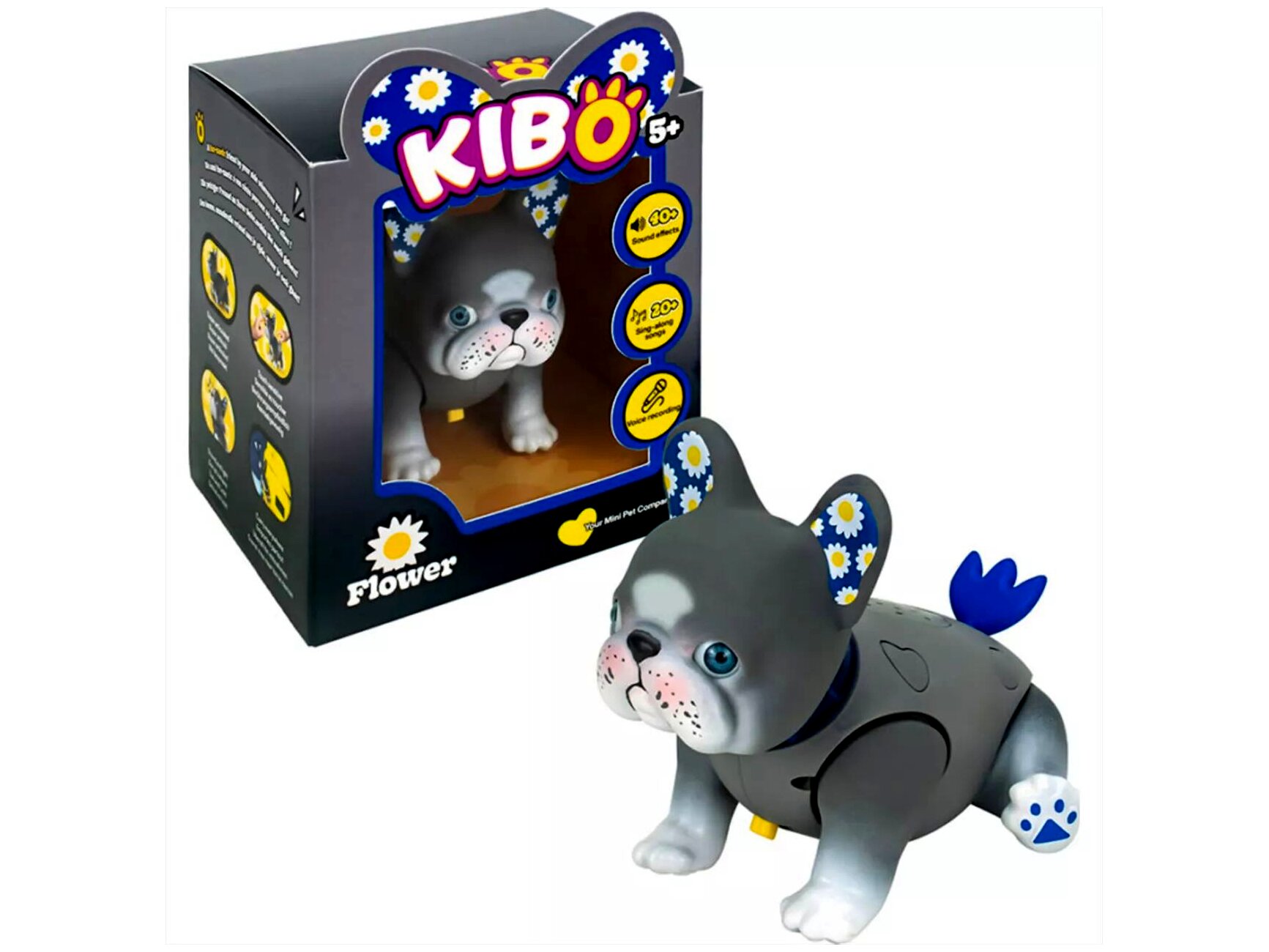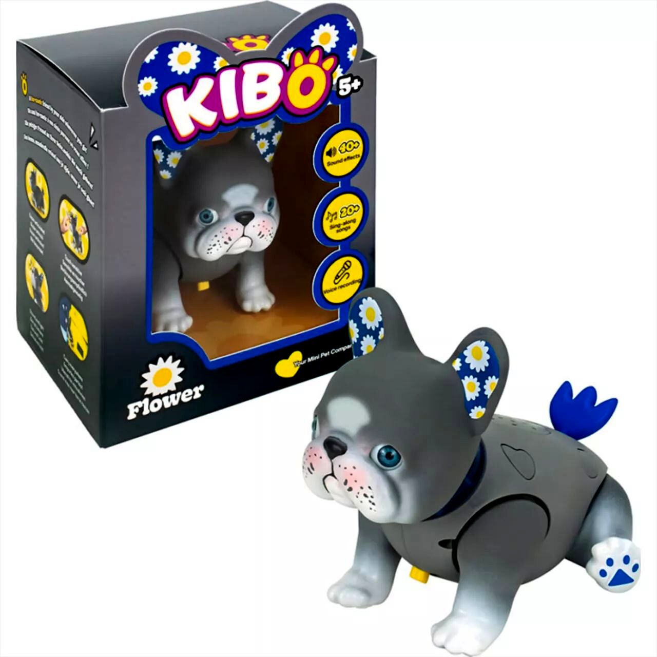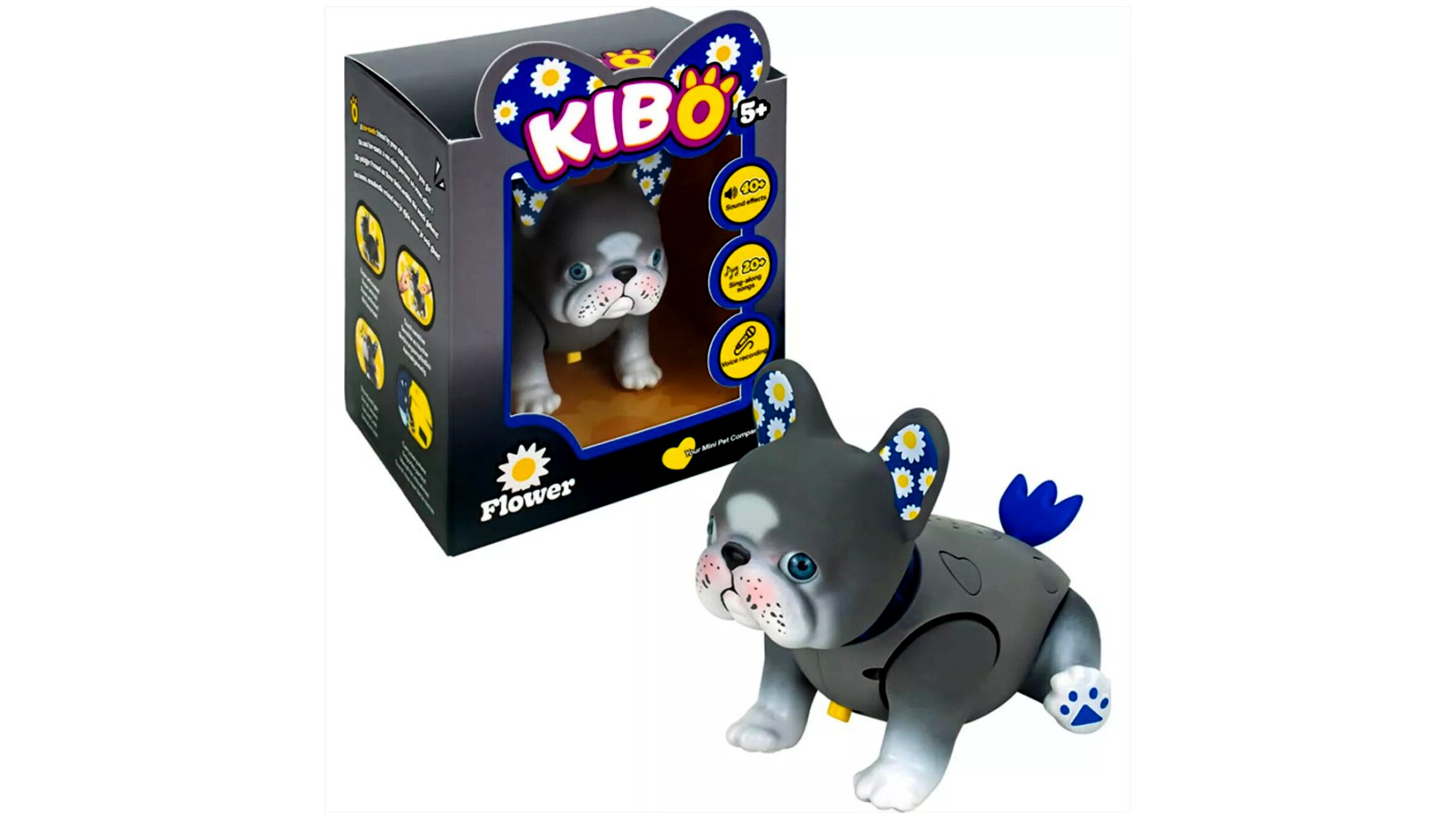 A Kaboom Kibo – Flower egy tenyérnyi méretű, interaktív francia bulldog játék, amely hangokra és érintésre reagál, trükköket mutat be, valamint hangfelvétel és hangismétlés funkcióval teszi élővé a szerepjátékot.