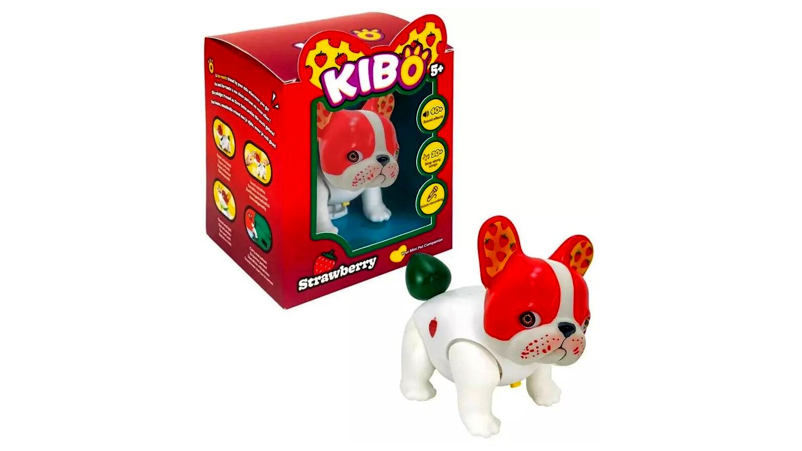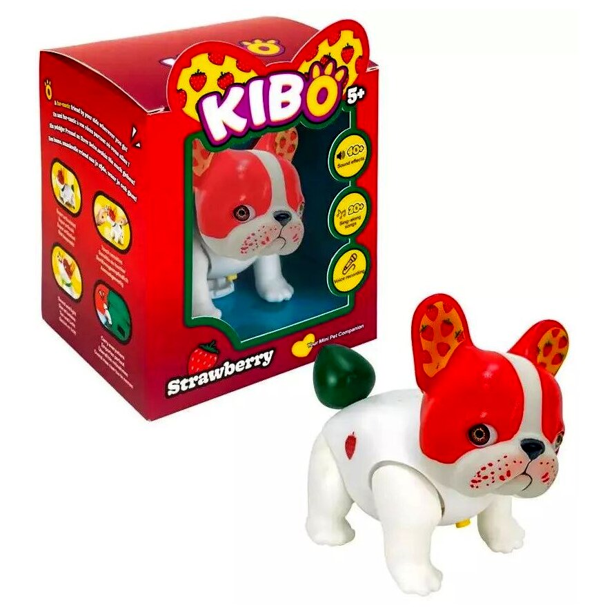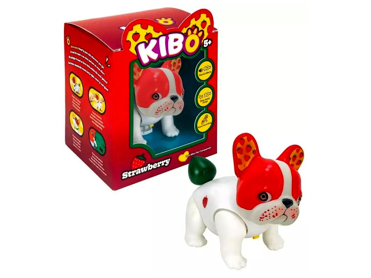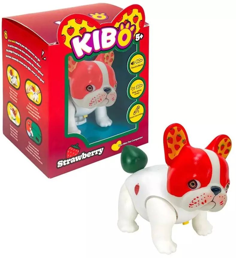 A Kaboom Kibo Strawberry egy tenyérnyi, interaktív francia bulldog kölyök, amely hangokkal, mozgással és fényjelzésekkel reagál a játékra. Simításra, mozdulatokra és megszólításra különböző válaszokat ad, így a gyerekek könnyen bevonódnak a szerepjátékba és a gondoskodós helyzetekbe.