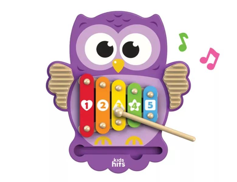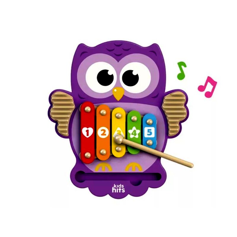 Ez a xilofon öt színes billentyűvel rendelkezik, amelyek segítik a gyerekeket a számolás és a színek megismerésében. A termék fa anyagból készült, és vízbázisú festékkel van bevonva, ami biztonságos a gyermekek számára. A bagoly szárnyain található csörgő és az önállóan tárolható fa ütő teszi még élvezetesebbé a játékot.