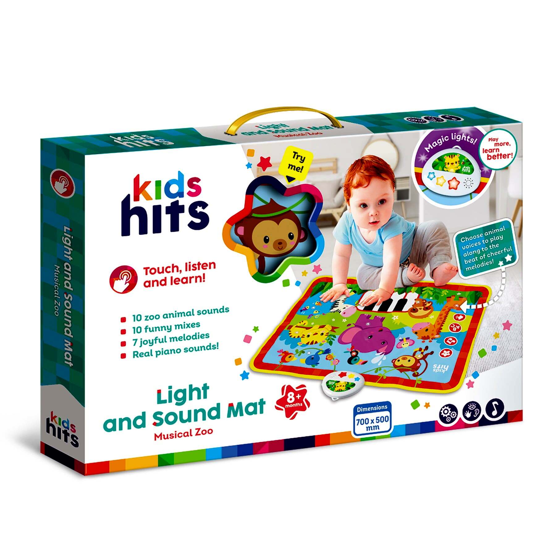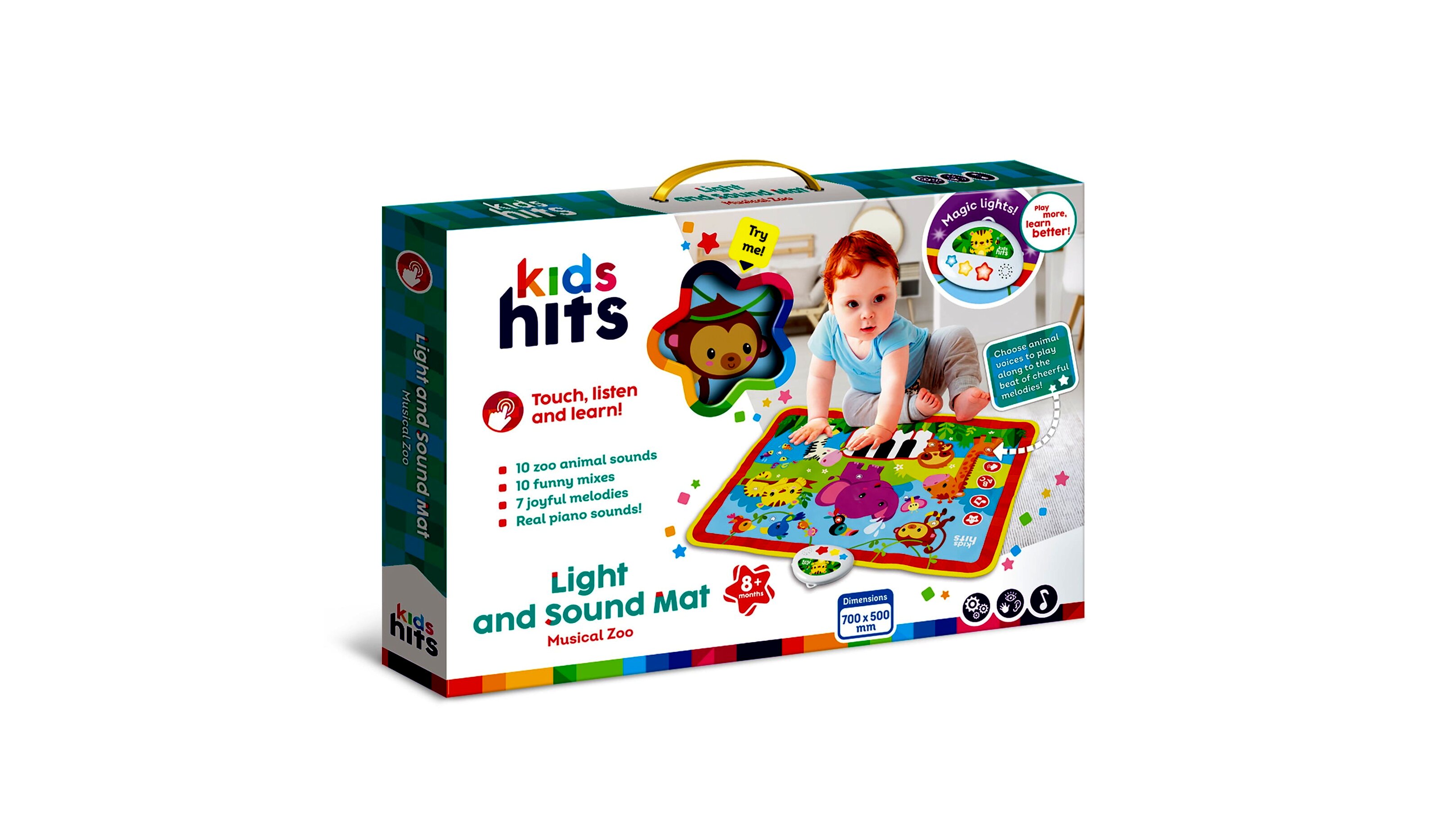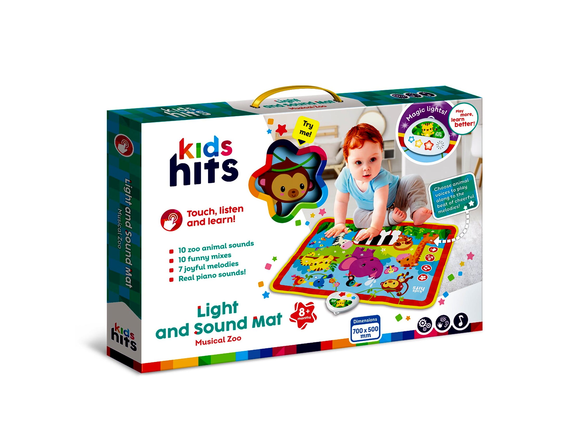 Élénk színek és különböző anyagok teszik varázslatossá a játékot, miközben a gyerekek fejleszthetik zenés észlelőképességüket. A szőnyeg varázslatos fényekkel és valódi zongorahangokkal kápráztat el, amelyek azonnal megragadják a babák figyelmét.A szőnyeg 10 különböző állathangot, 10 vicces mixet és 7 vidám dallamot kínál, amelyek együtt éneklésre és játékra ösztönzik a gyerekeket. A kicsik az állathangok kíséretében játszhatnak a vidám zenékre, amely szórakoztató és oktató egyben.