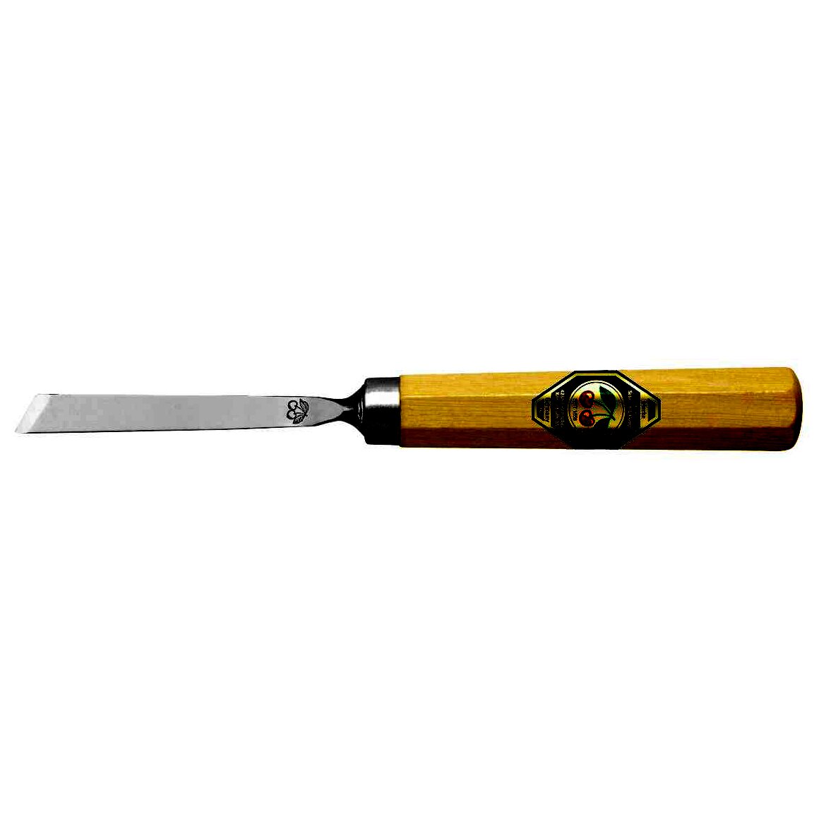 Forgácsfaragó véső egyenes, ferde vágóéllel, nyolcszögletű gyertyán nyéllel.
