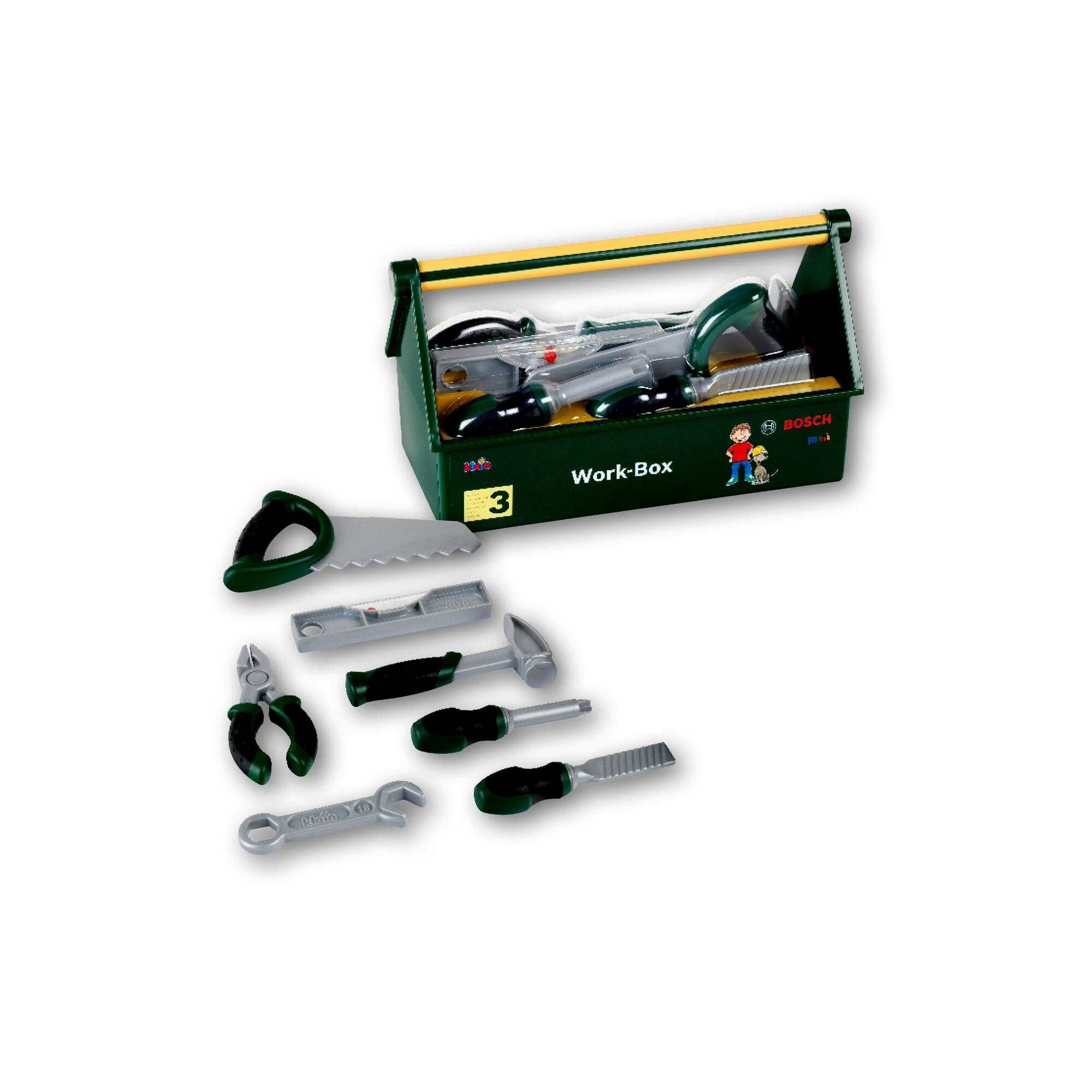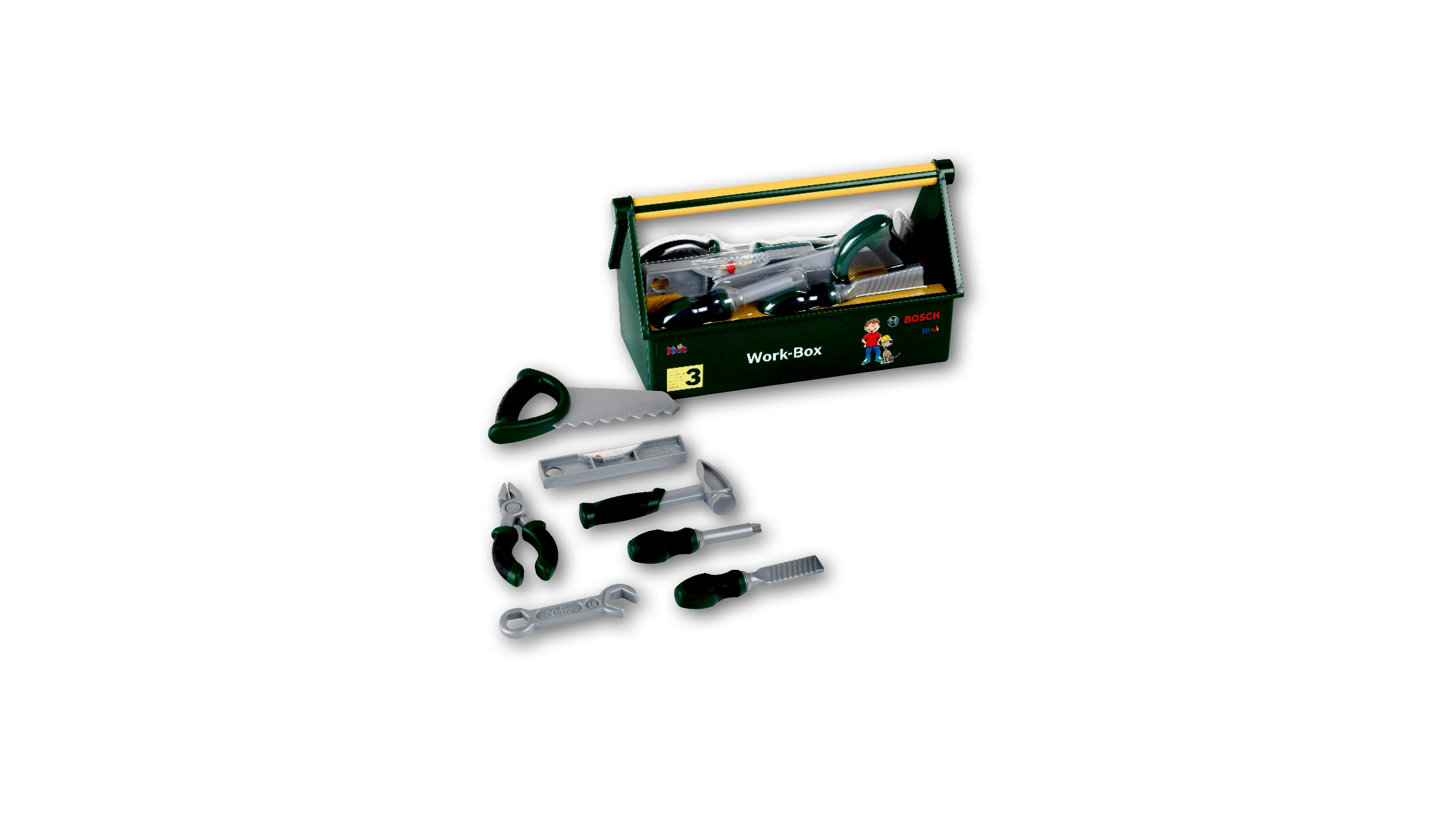 A Bosch szerszámos ládával minden kisfiú megtanulhatja a barkácsolás alapjait. A szerszámos láda praktikus fogantyúval rendelkezik, a ládában pedig található egy fűrész, egy csavarhúzó, egy fűrész, egy vízmérték, egy fogó, egy kalapács és egy csavarkulcs is.A szárszámos láda kompatibilis a Bosch és a Technico készletekkel.