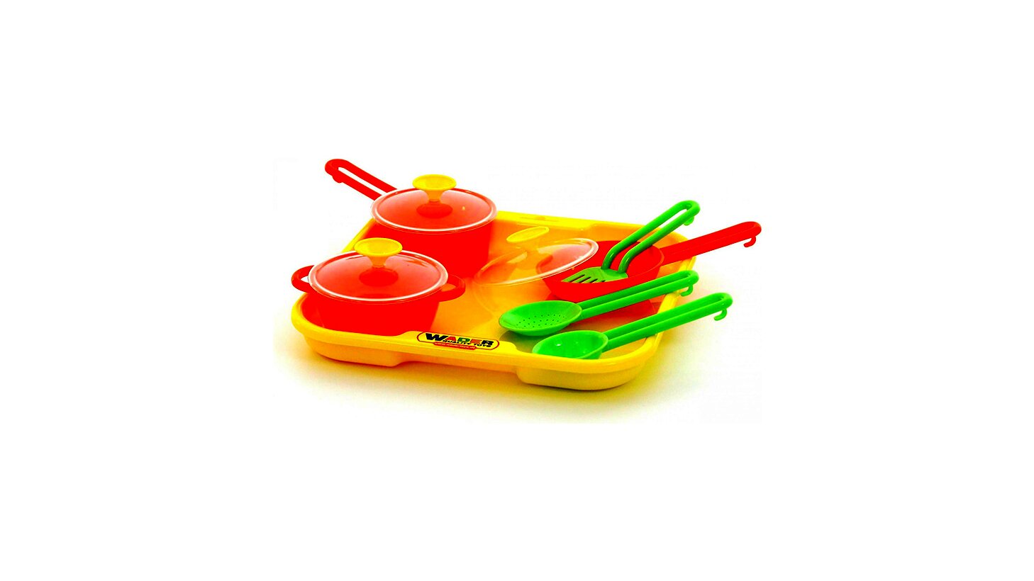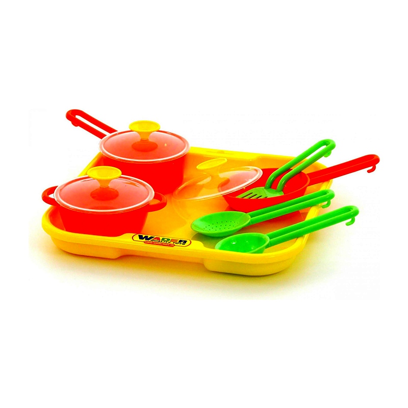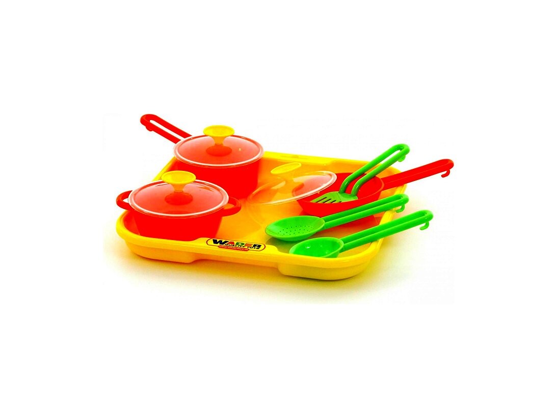 A szett tartalma: 1 db tálca, 1 db fazék, 2 db serpenyő, 3 db fakanál.