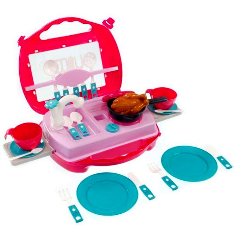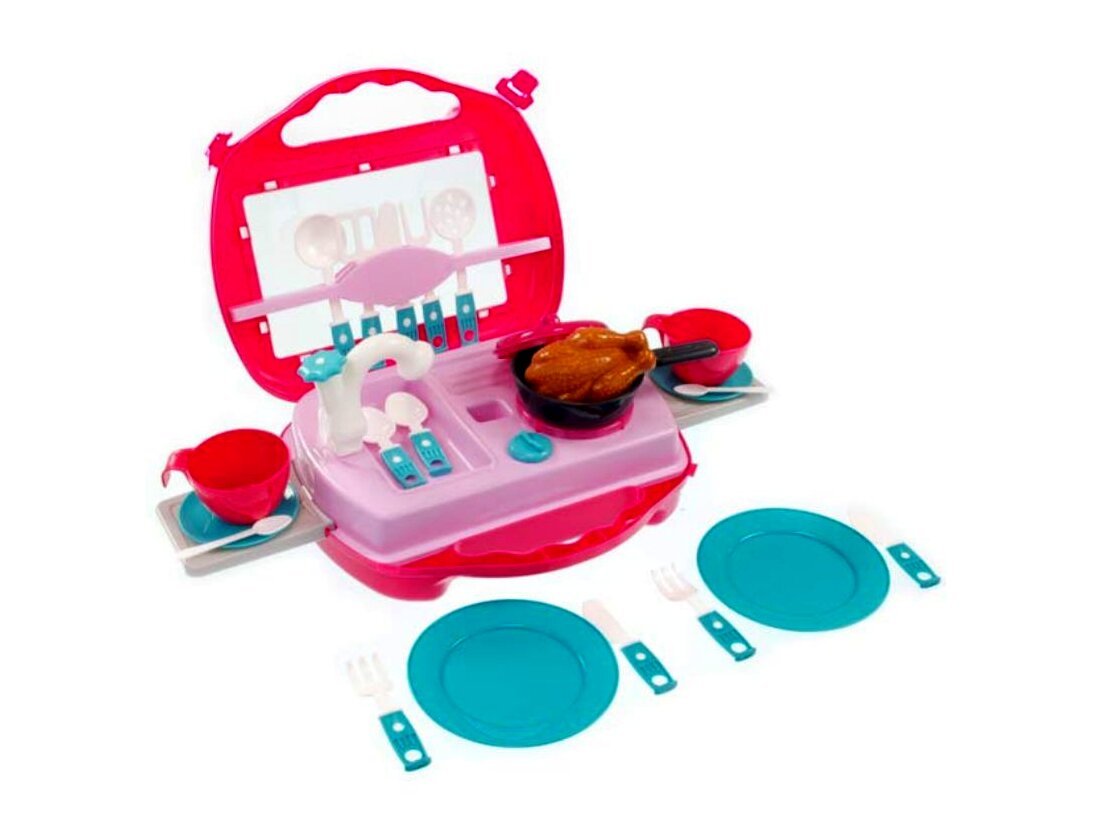 Tartalom: mobil játékkonyha 22 db kiegészítővel (tűzhely; serpenyő; sült csirke; mini mosogató; 2 db teáscsésze csészealjakkal, kiskanalakkal; 2 db tányér; 2 szett evőeszköz (kanál, kés, villa); 5 db-os konyhai eszközkészlet.