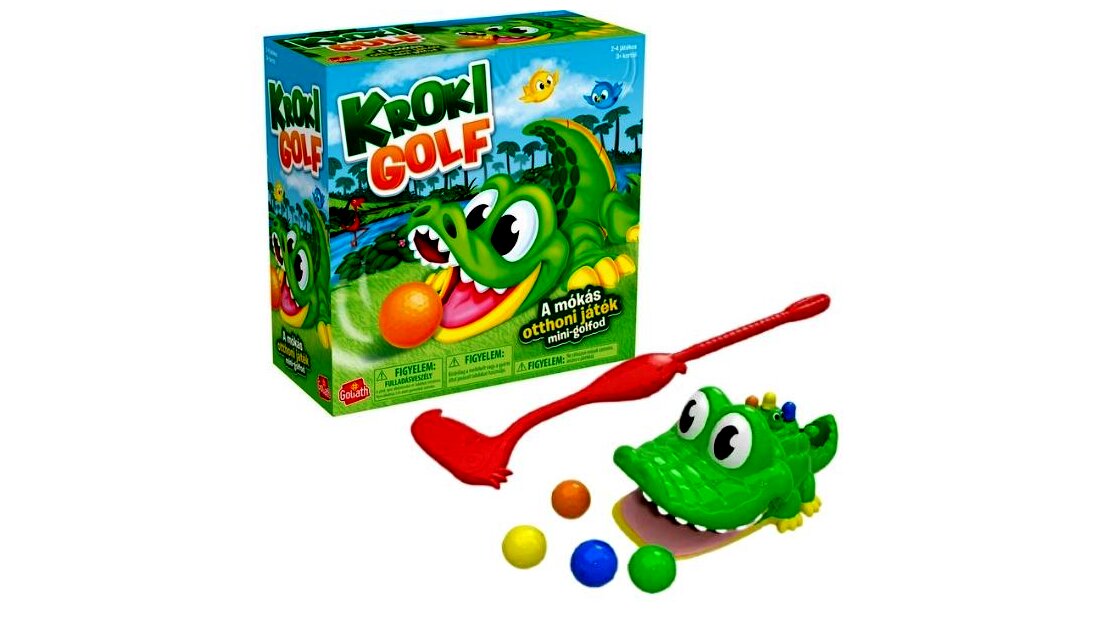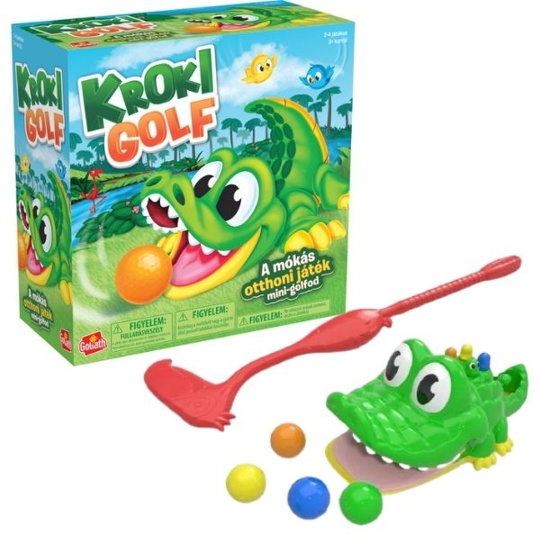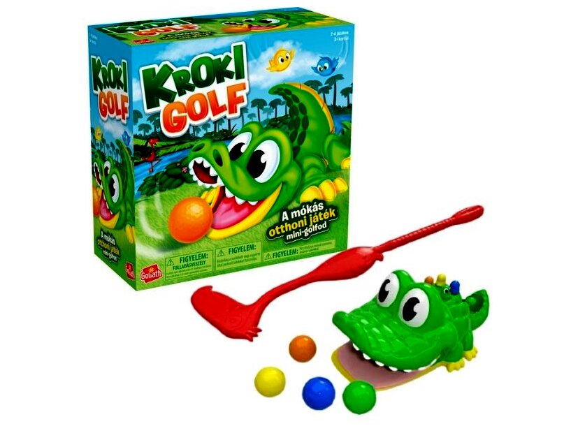 A Kroki Golf egy igazán vidám és mókás, otthoni mini-golf játék. Célja, hogy a színes labdákat a nyitott szájú Kroki szájába irányítsák a gyerekek a flamingó formájú ütő segítségével. Ha eléri a kroki farkát, visszadobja nekik a labdát. A hátán lévő színes kis madárkák számolják majd a pontokat.A játék fejleszti a szem-kéz koordinációt és a motoros készségeket, emellett ez a klasszikus mini-golf játék állat köntösbe bújva remek szórakozást és kikapcsolódást ígér az egész családnak!