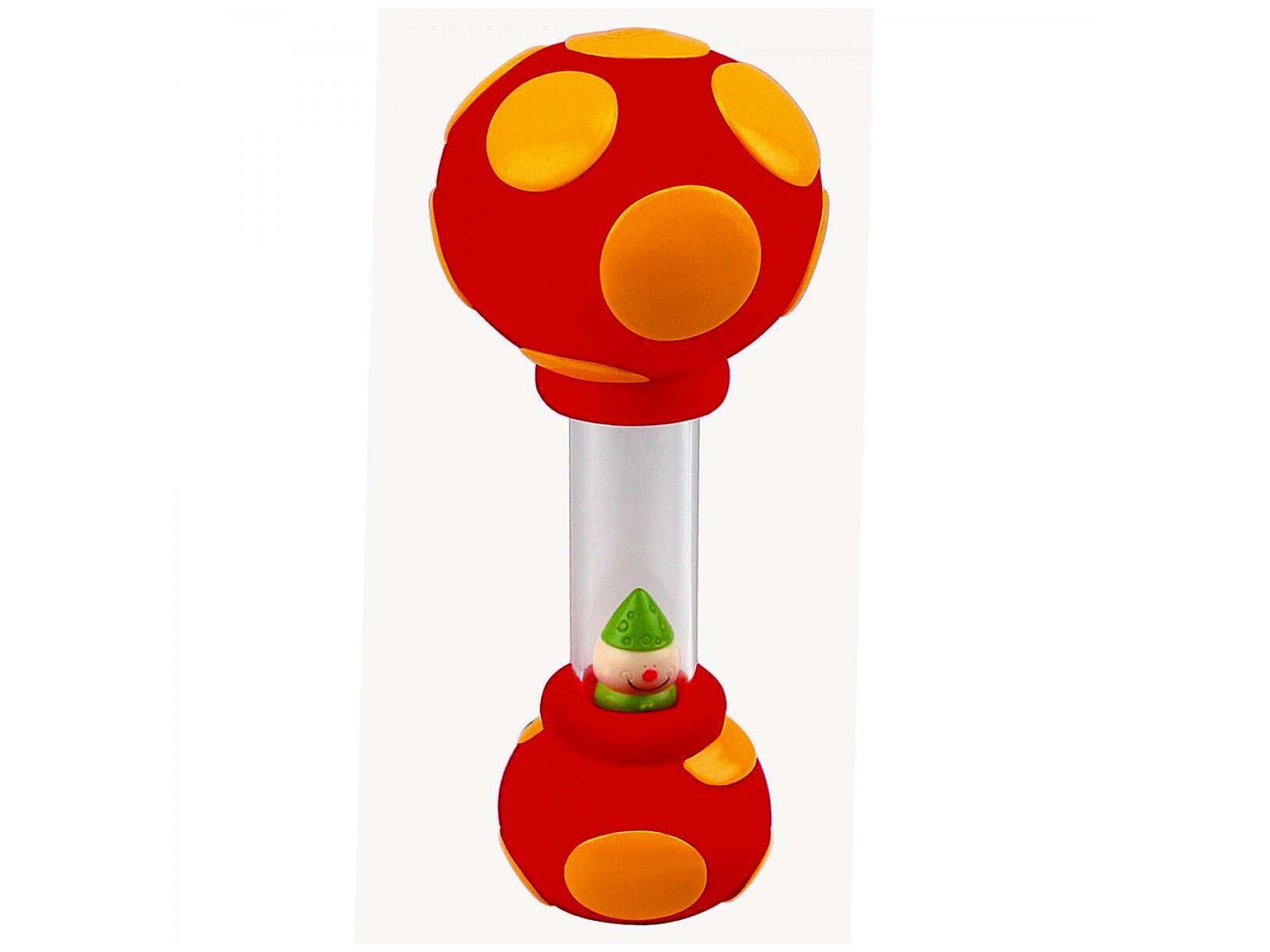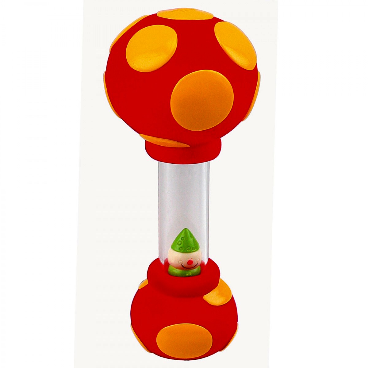A csörgő átlátszó műanyag részében, egy kis mókás bohócfej szórakoztatja a babákat.