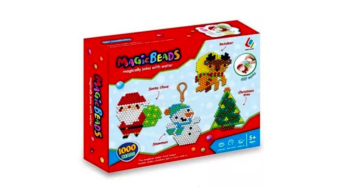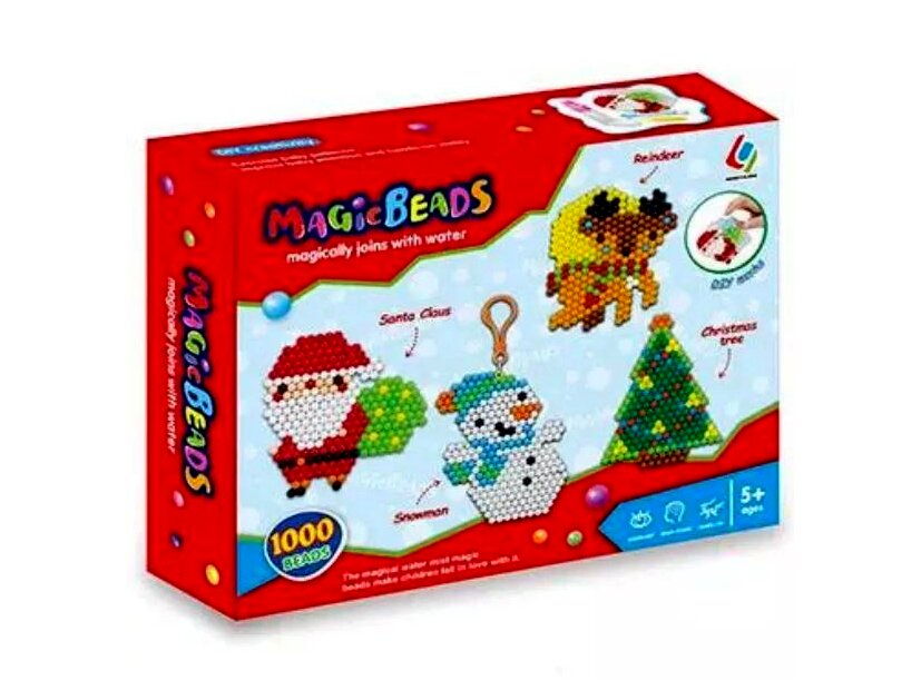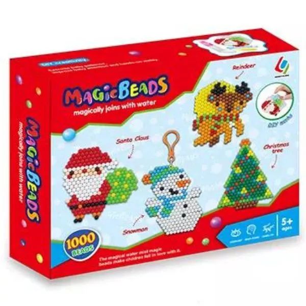 Ez a gyöngykép készítő szett tökéletes választás a kreatív gyerekek számára. A készlet segítségével egyedi, színes karácsonyi lógatható díszek, készíthetők. A gyöngyök könnyen - az AquaBeads-hez hasonlóan - víz segítségével tapadnak egymáshoz, ezért nincs szükség vasalóra. A játék fejleszti a kreativitást és a finommotorikus készségeket.A termék jellemzői: