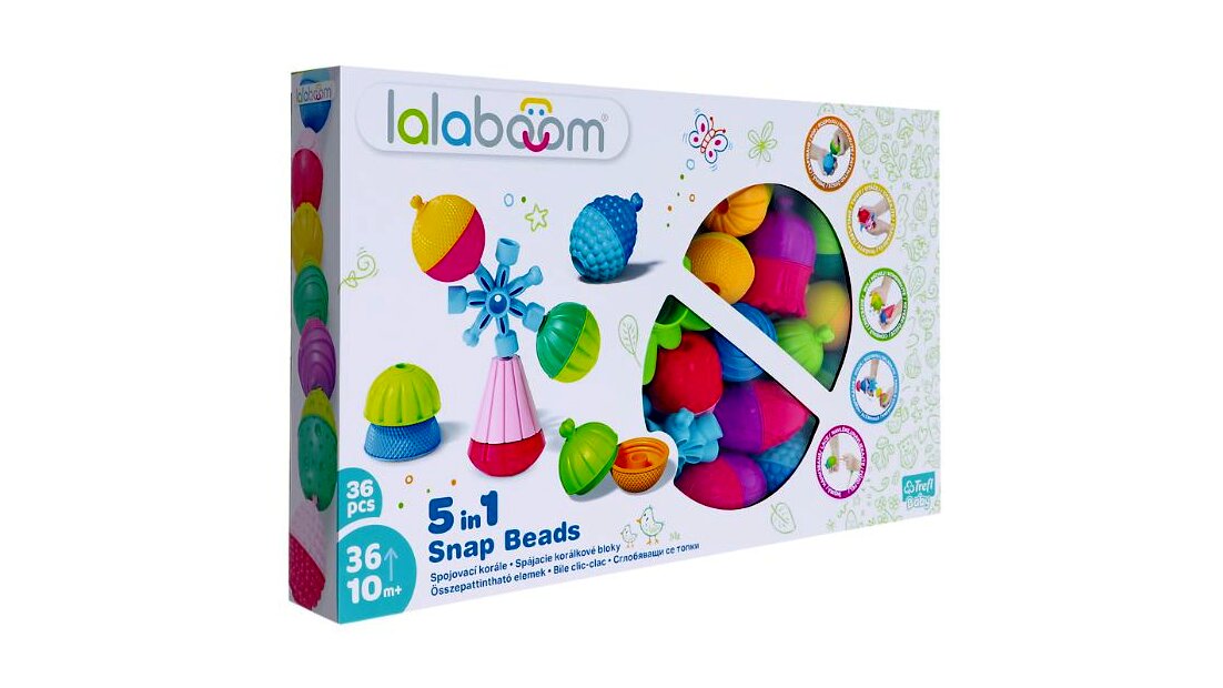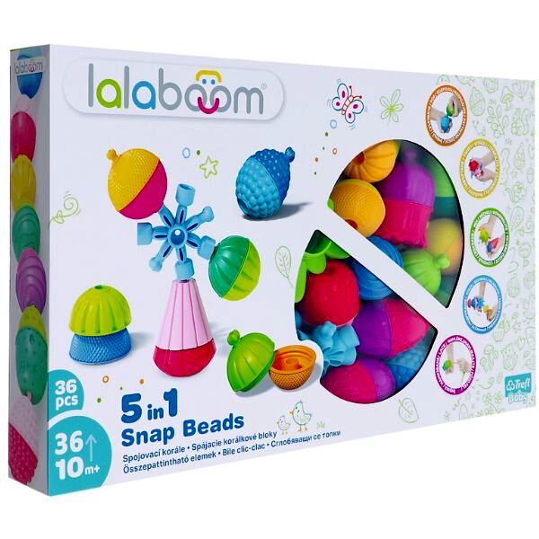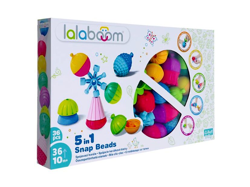 A Lalaboom Montessori bébi fejlesztőjátékokkal a kicsik játékosan ismerkedhetnek meg a különböző formákkal és felületekkel, és ők maguk fedezhetik fel az elemek összekapcsolásának és -illesztésének mikéntjét. Ebben a készletben 36 építőelem található.A színes, különböző felületekkel rendelkező építőelemek könnyen összepattinthatók, összecsavarhatók és tetszőlegesen kombinálhatók, így a kisgyerekek teljesen új építményeket vagy figurákat is alkothatnak belőlük. Ráadásul a golyók még fűzhetőek is, így csak a gyerekek képzeletén múlik, hogy milyen teremtmény vagy építmény születik meg belőlük.